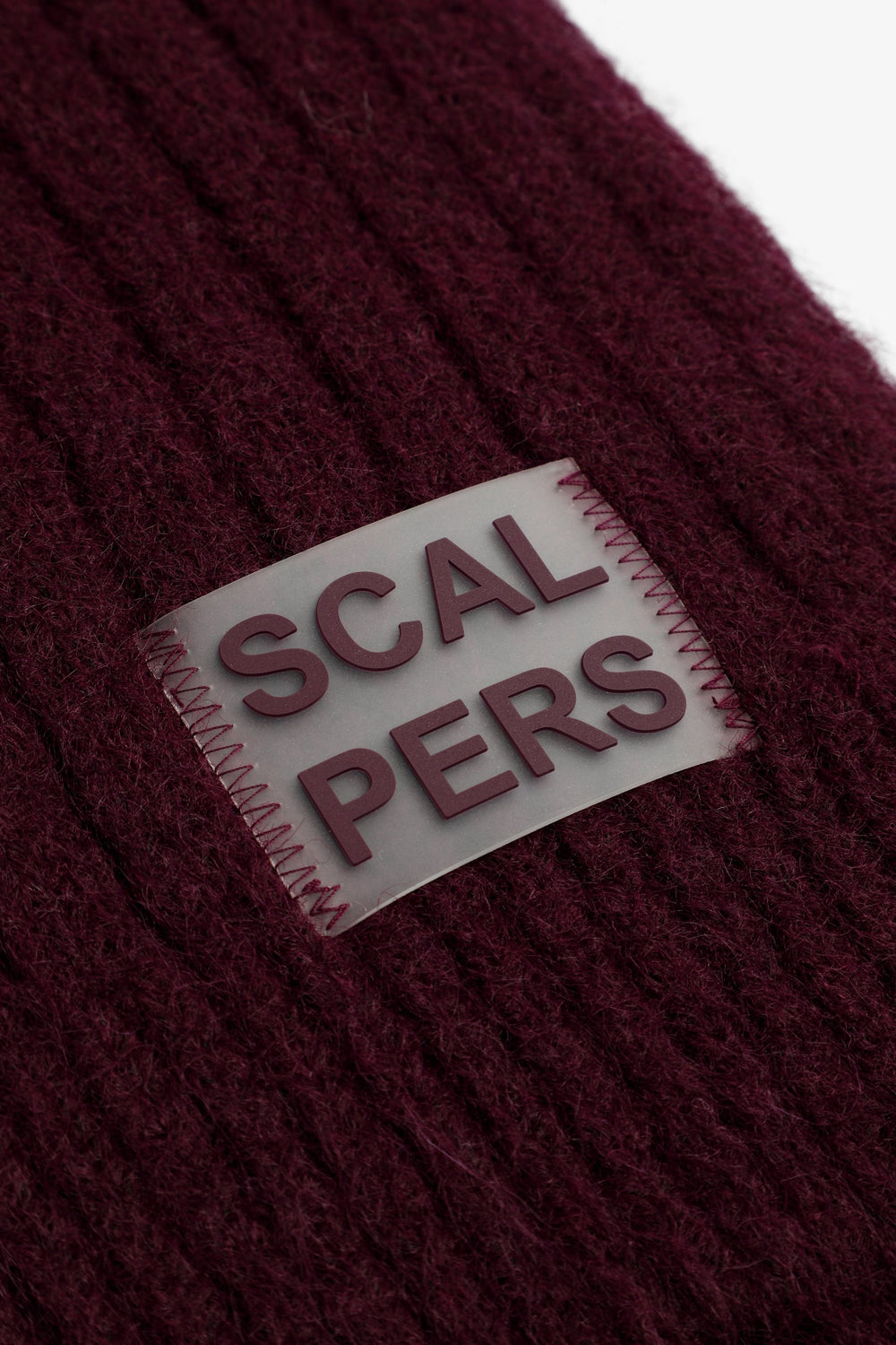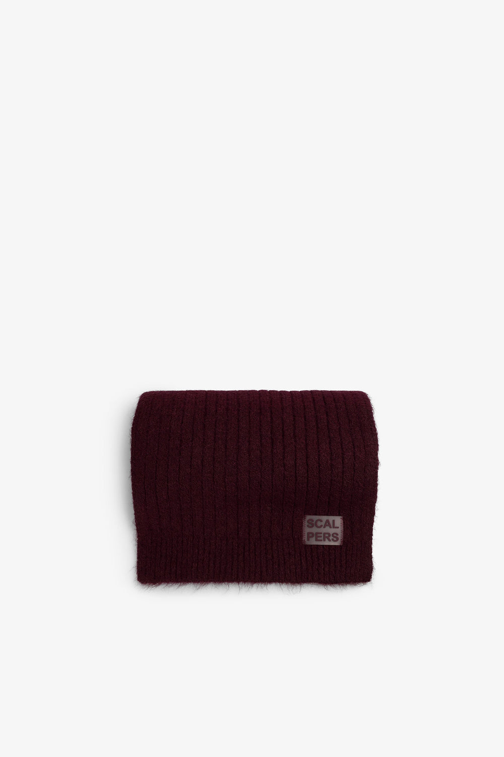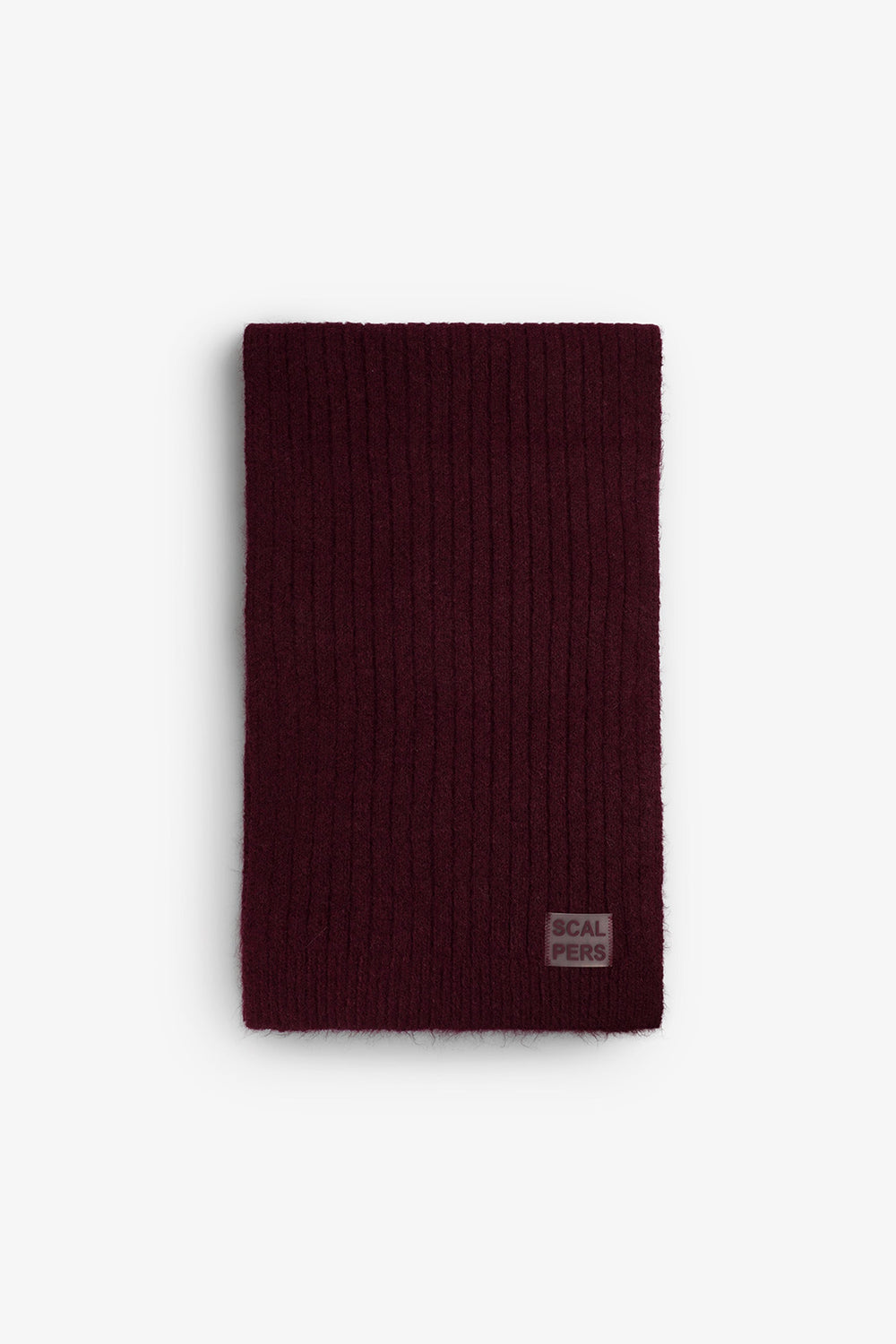 Cachecol confecionado em mistura com lã. Pormenores de canelado. Remendo com logótipo.