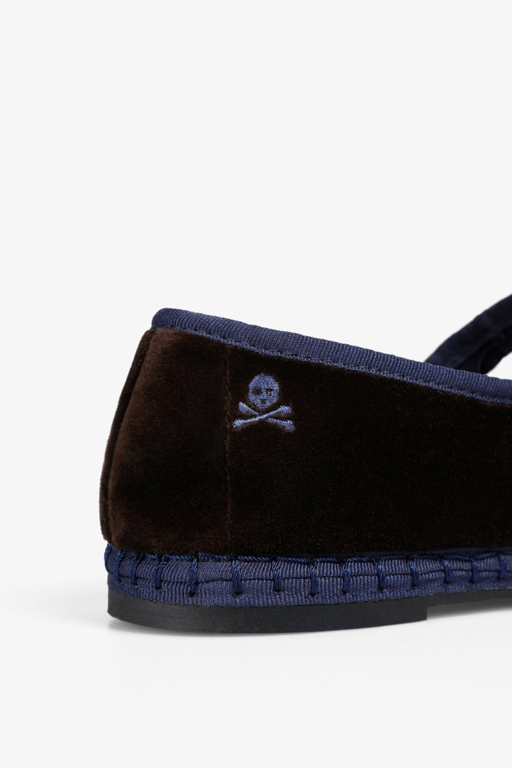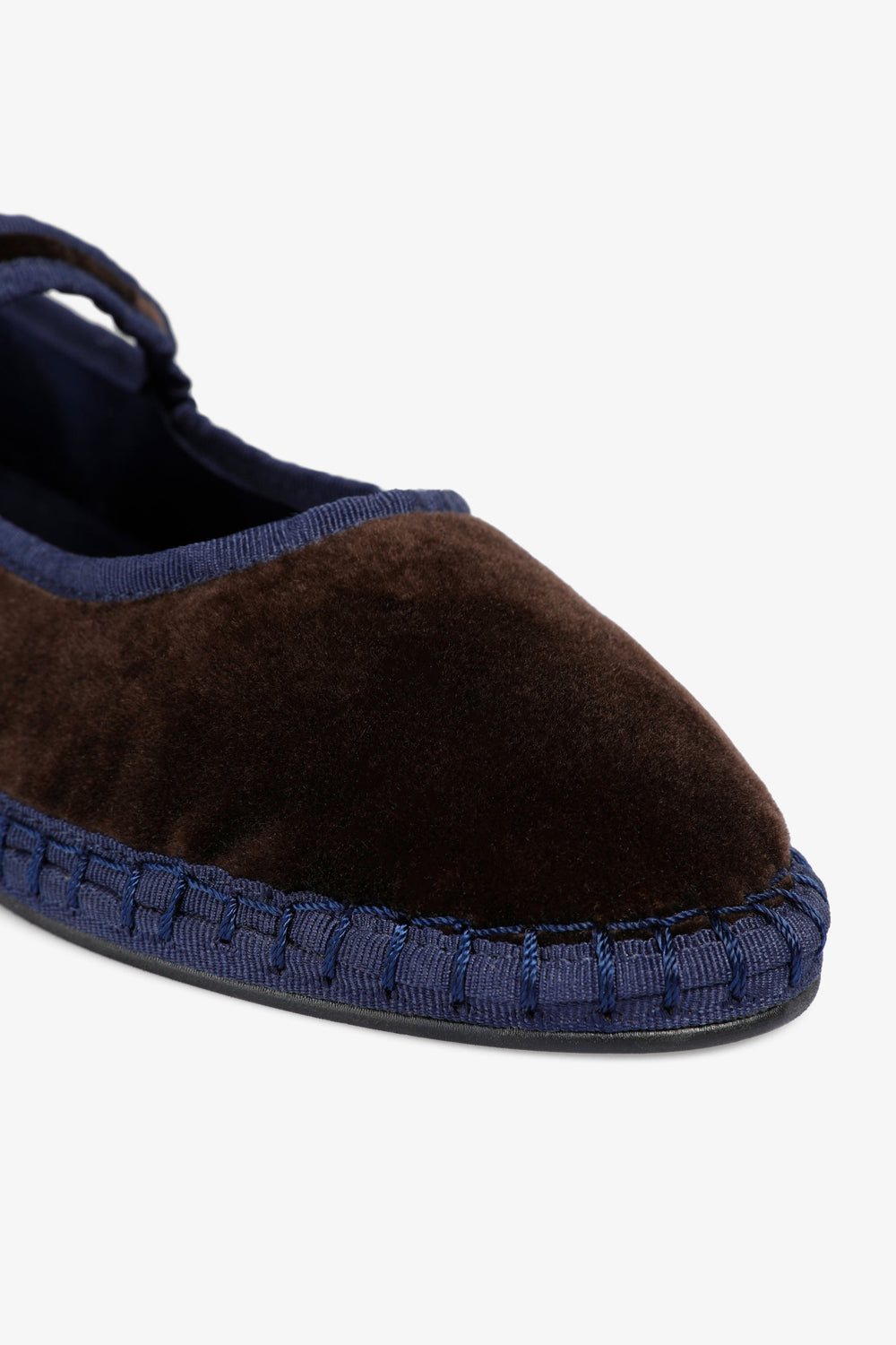 Slipper de veludo castanho com uma única tira e pormenor de acabamento em azul-marinho. Acabamento em veludo. Pormenor de textura macia. Sola flexível de caucho. Design confortável e elegante.