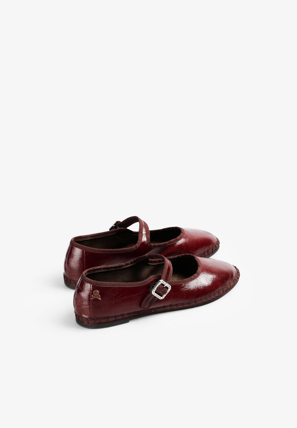 Sabrinas confecionadas em tecido com efeito envernizado. Tira com fecho por fivela personalizada. Pormenor gravado de logótipo no tom.