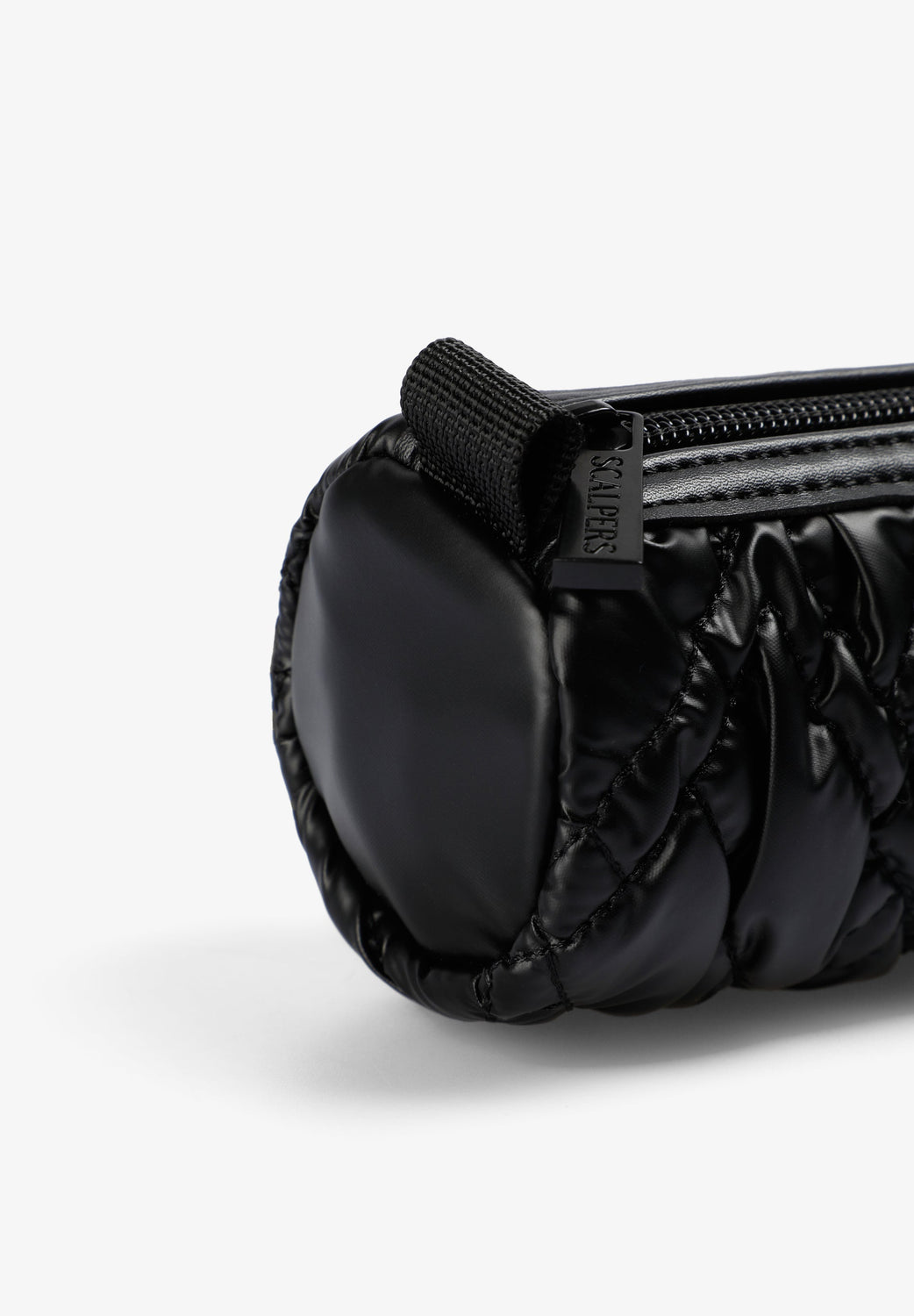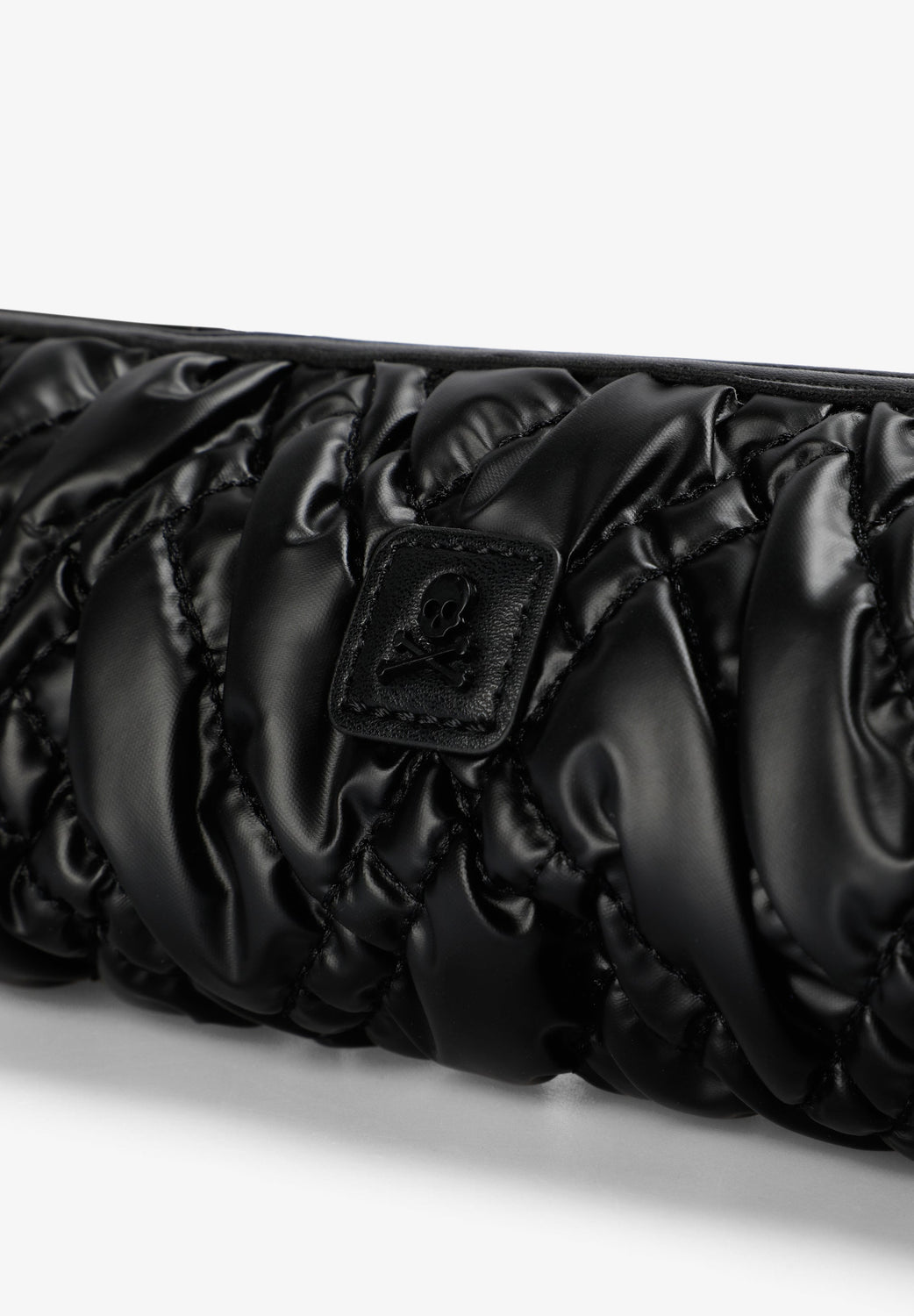 Nécessaire acolchoada. Fecho de correr. Pormenor de remendo em efeito de caucho com skull metalizada.