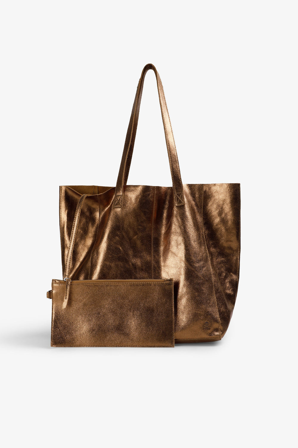 Bolsa shopper confecionada em 100% camurça com acabamento metalizado. Pele com dobra no interior e carteira a condizer com fecho de correr.