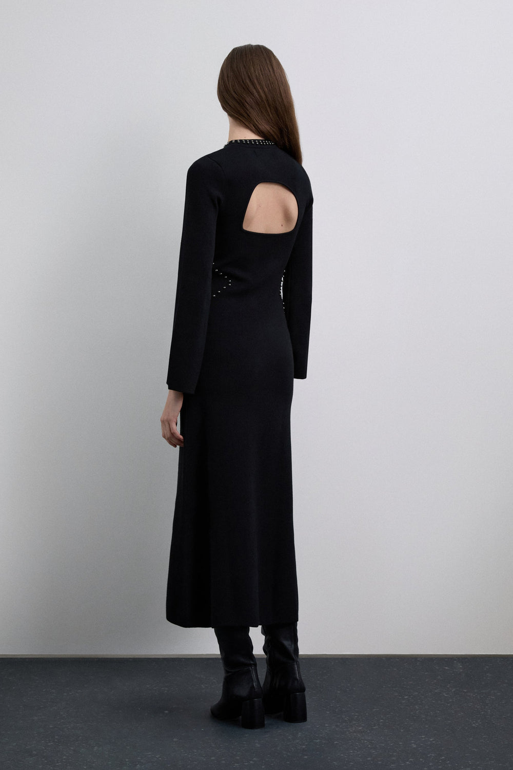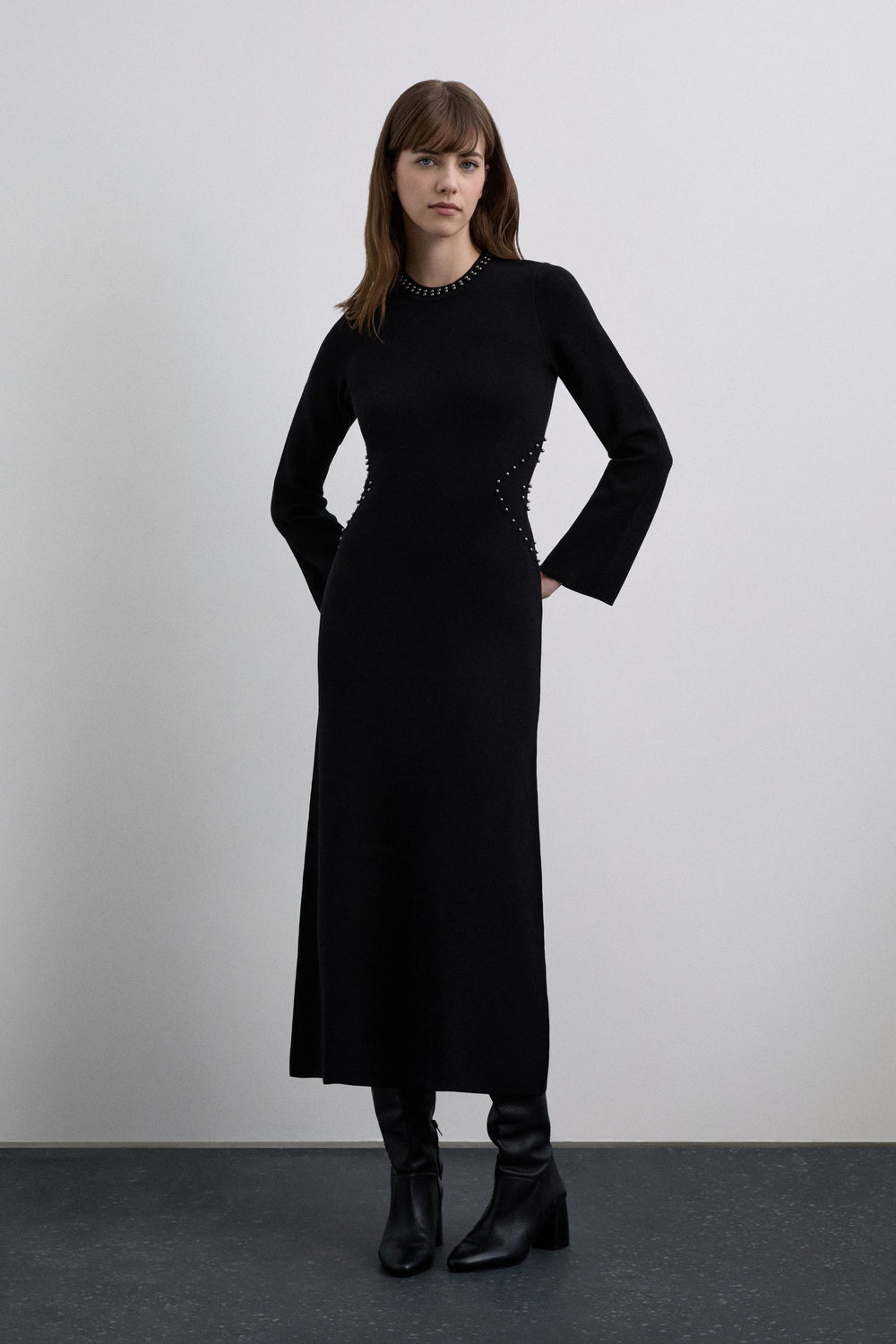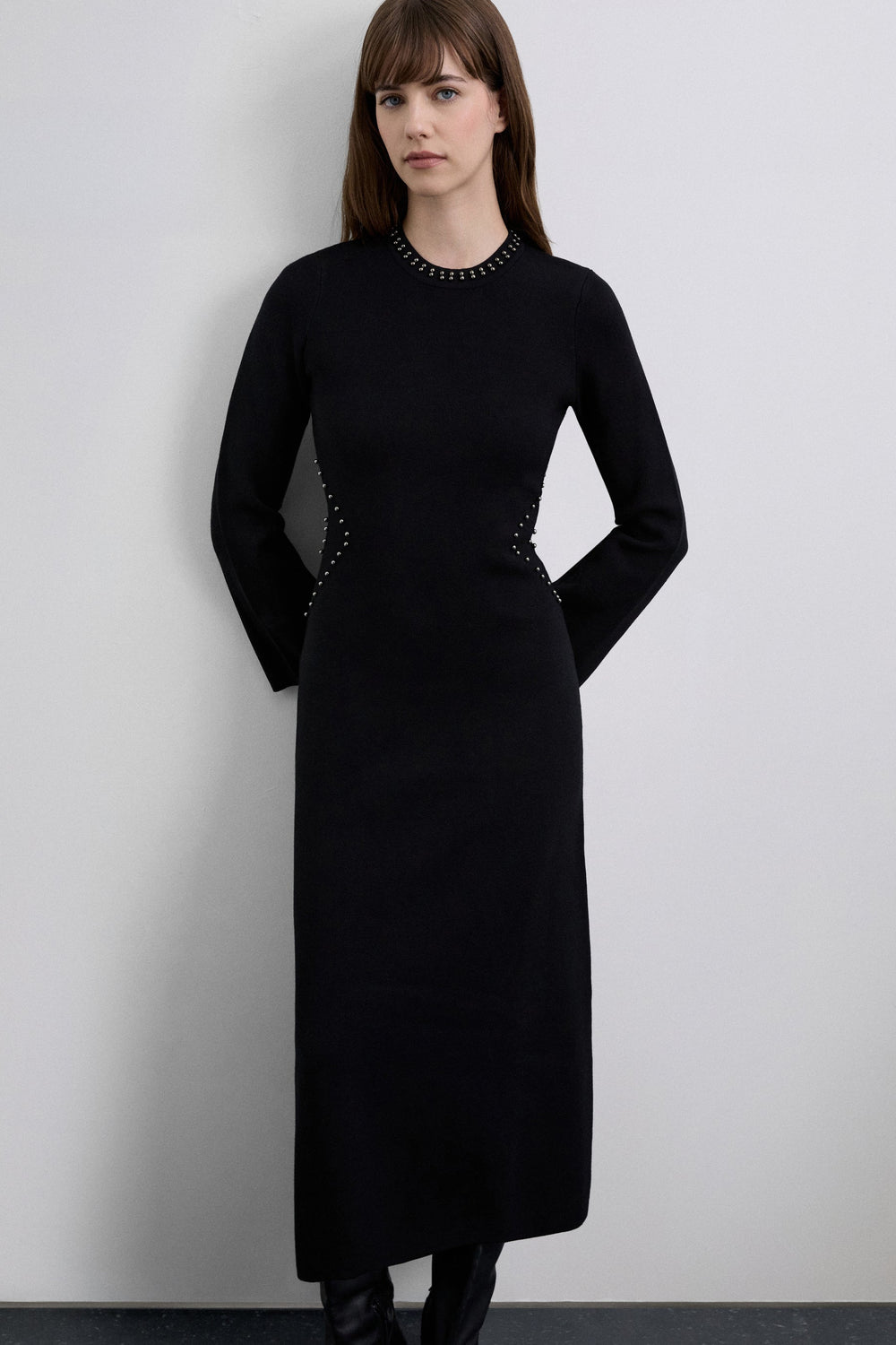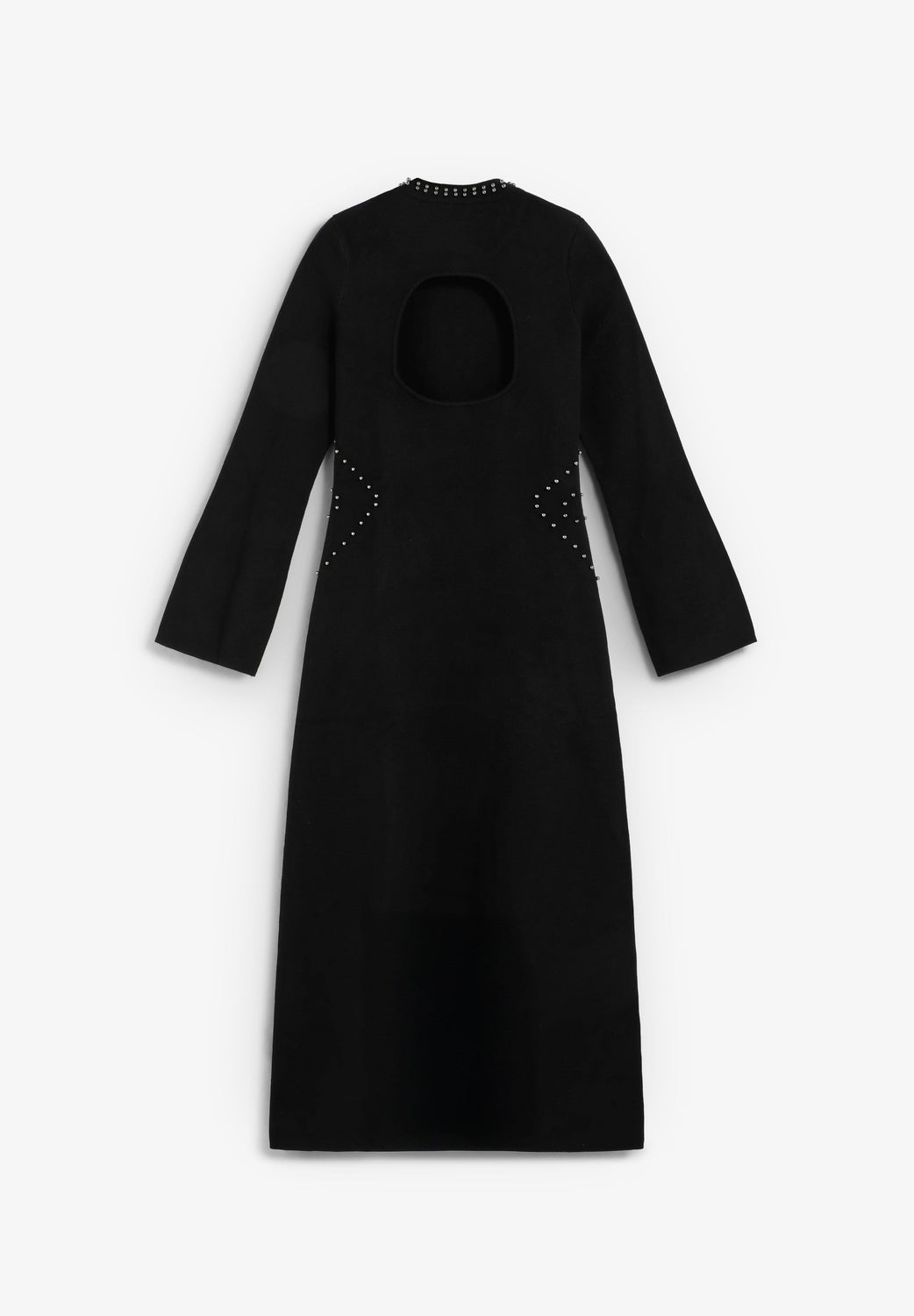 Vestido de malha confecionado em mistura de viscose. Slim fit. Decote redondo. Manga comprida boca de sino. Pormenores de tachas na gola e na cintura. Abertura traseira.