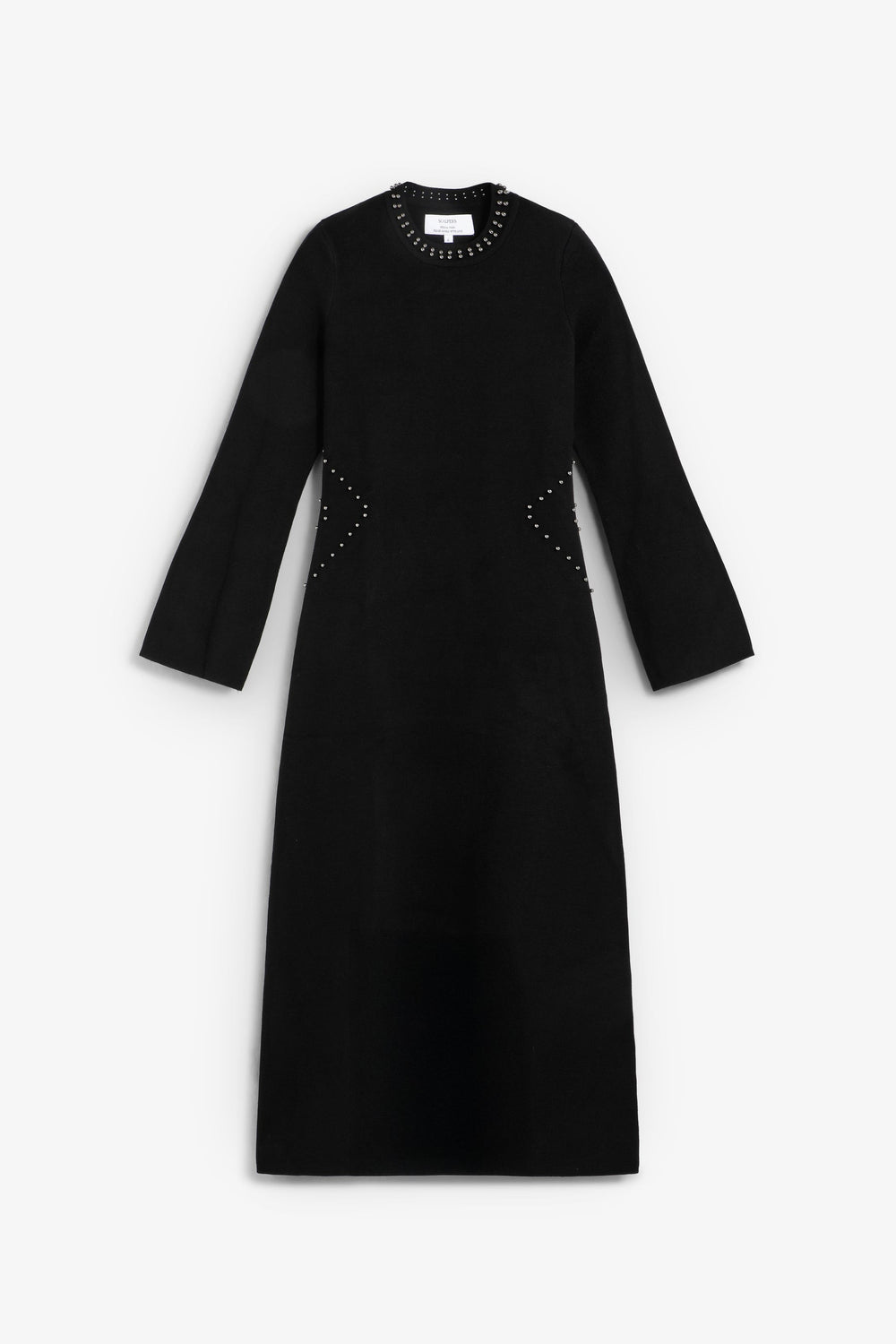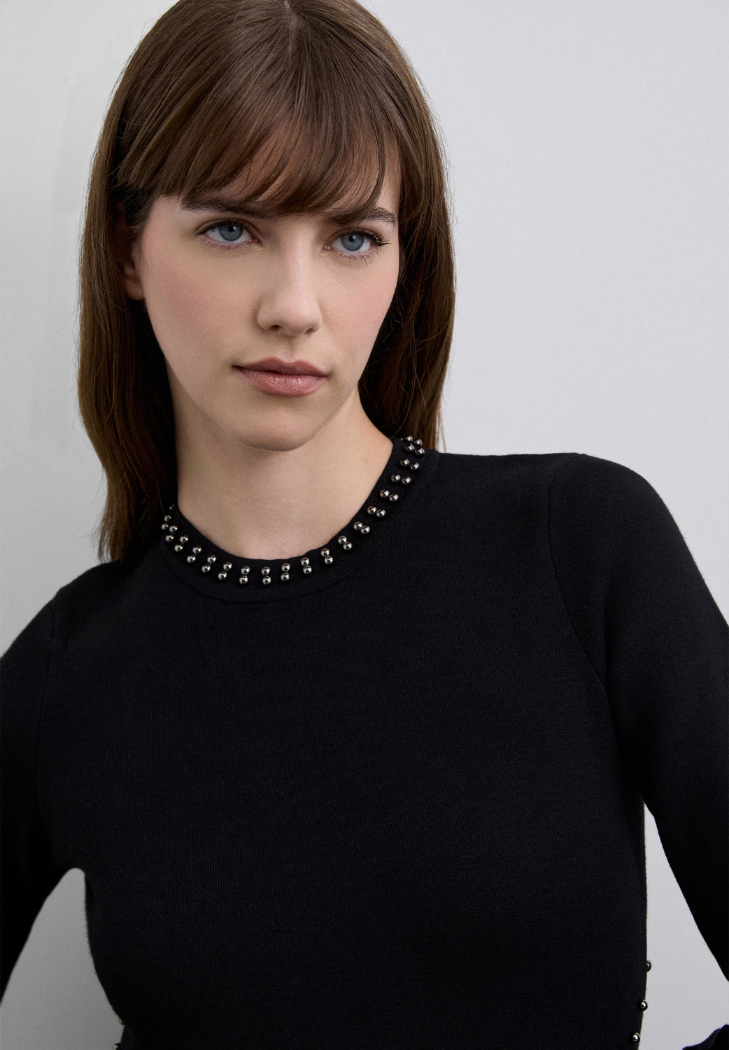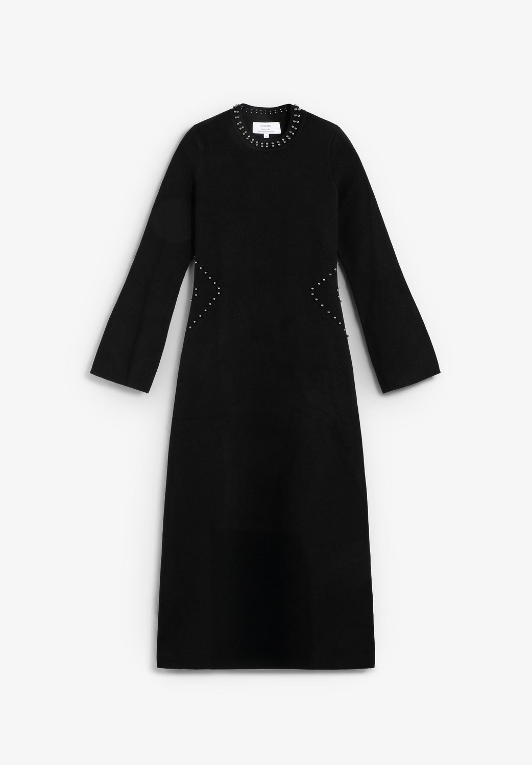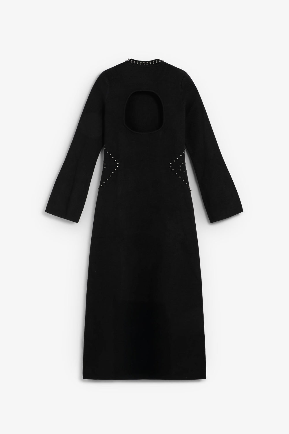 Vestido de malha confecionado em mistura de viscose. Slim fit. Decote redondo. Manga comprida boca de sino. Pormenores de tachas na gola e na cintura. Abertura traseira.