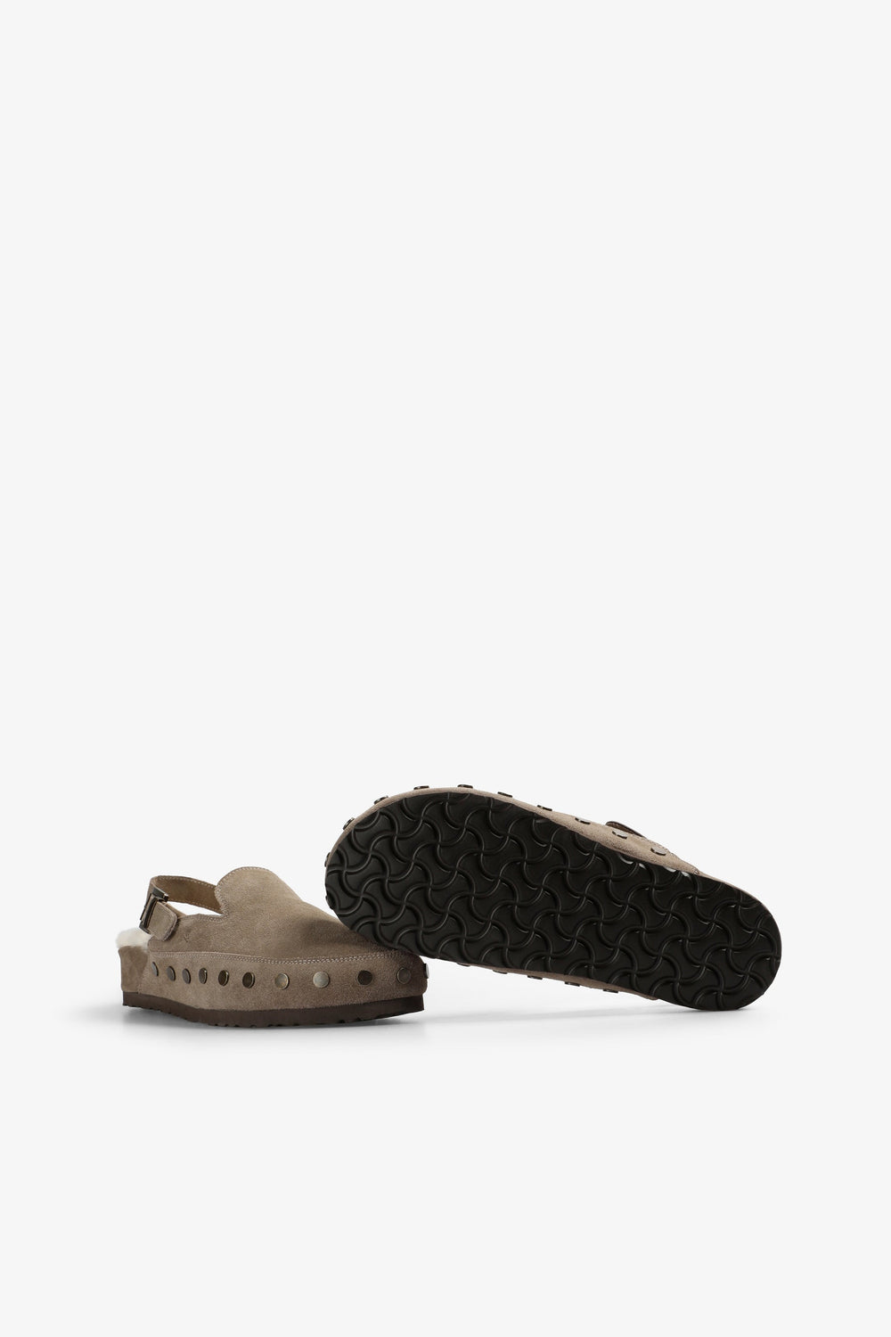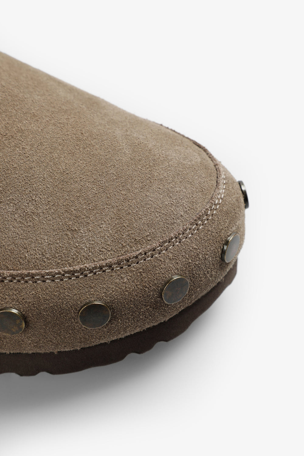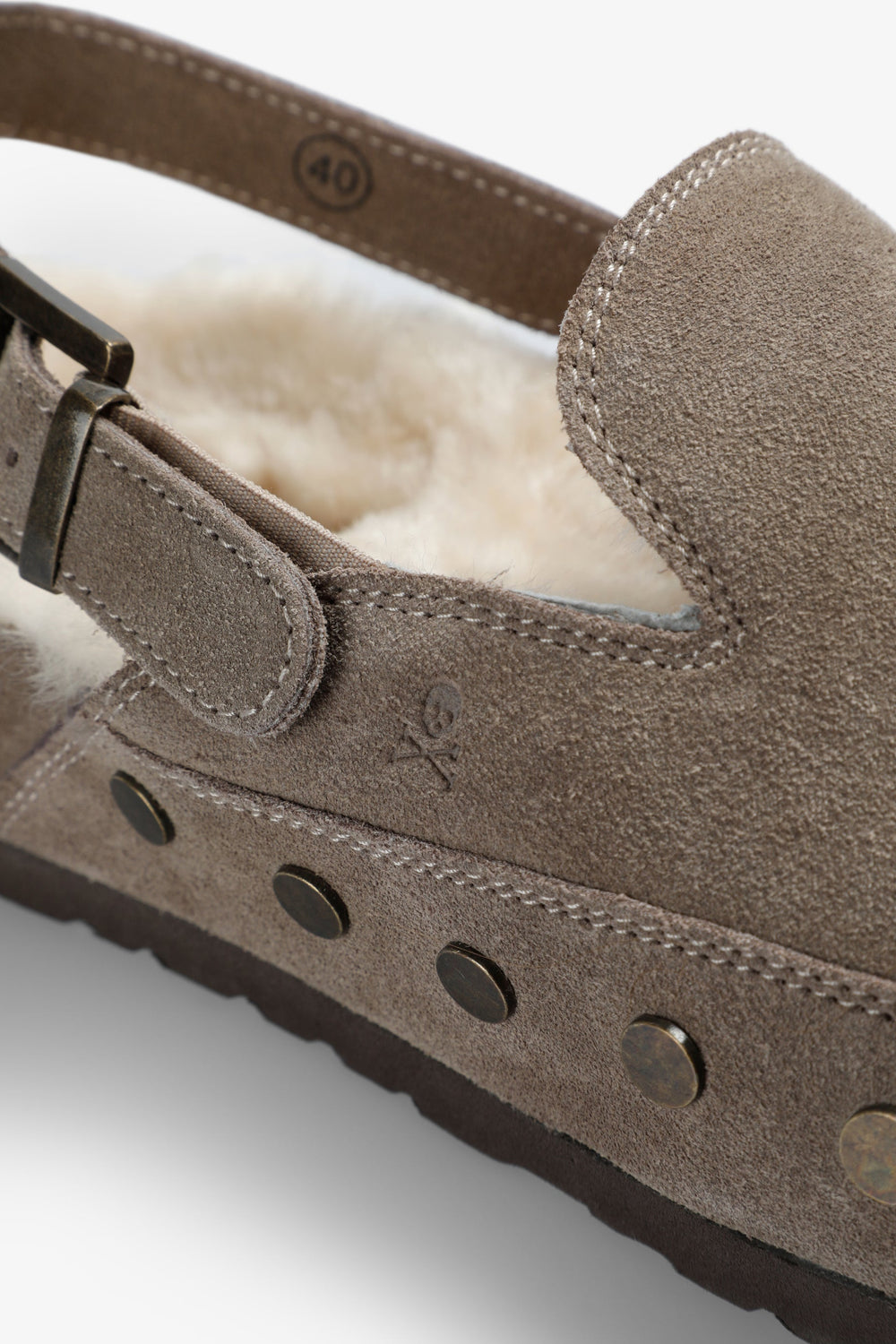 Socas confecionadas em 100% pele. Interior 100% pelo. Pormenor de tachas. Fecho ajustável com tira e fivela. Logótipo gravado no tom.