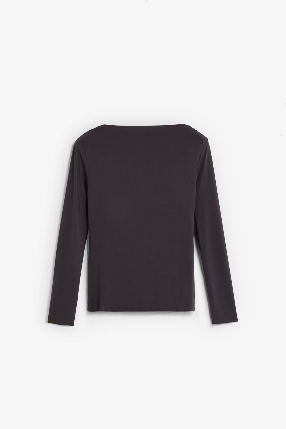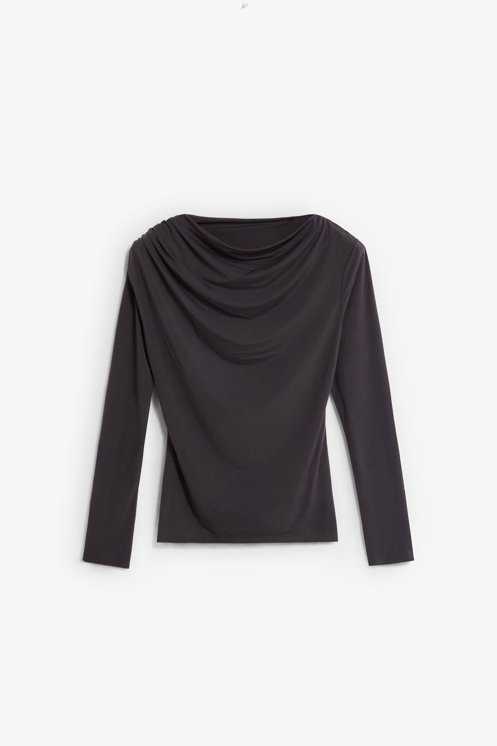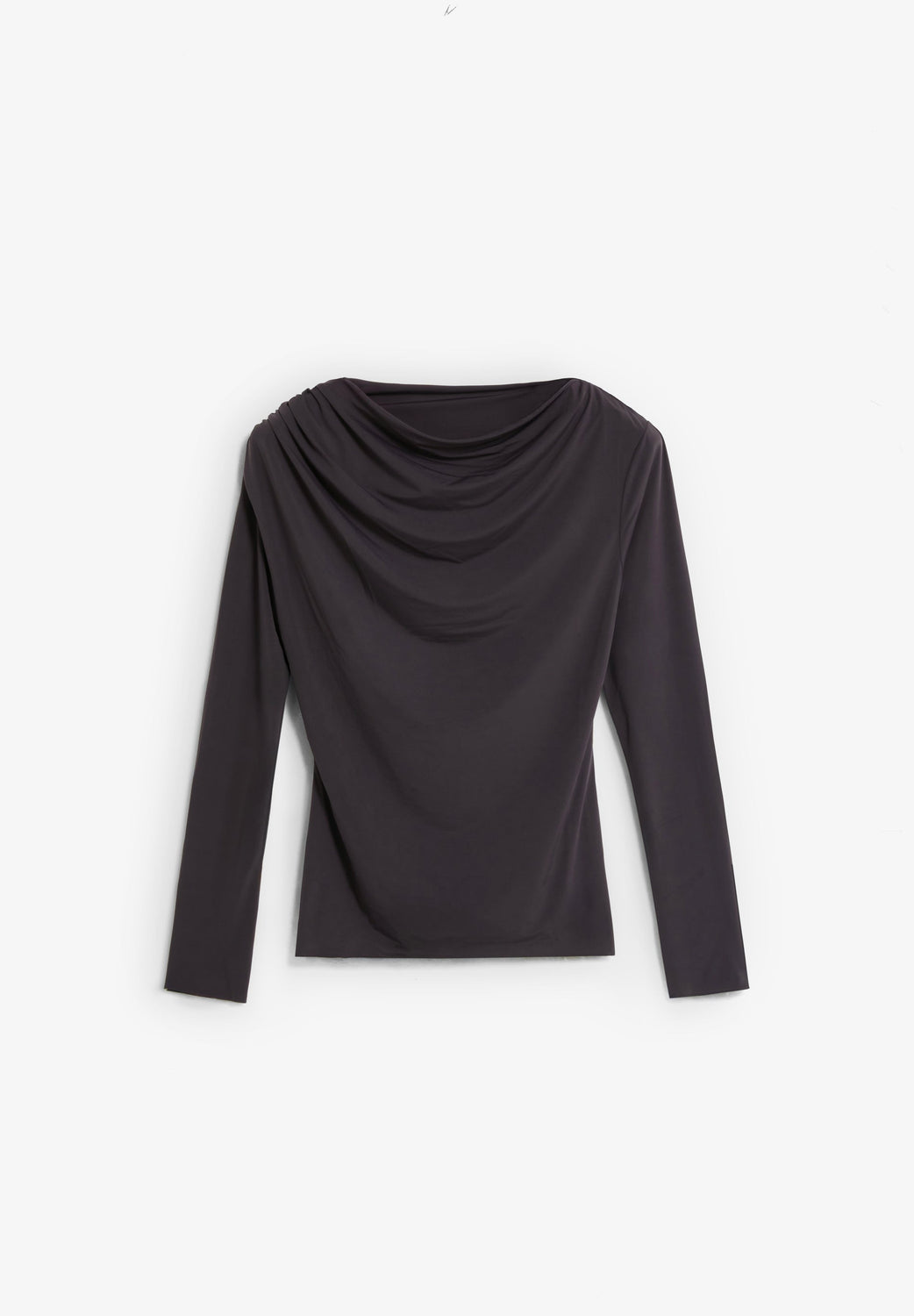 T-shirt de manga comprida com decote drapeado. Franzidos num ombro. Design ajustado.