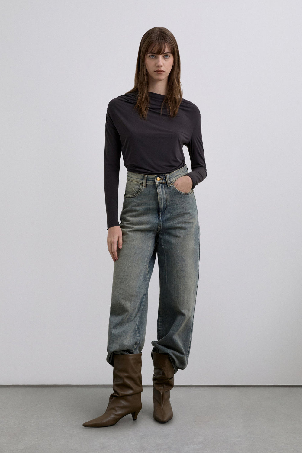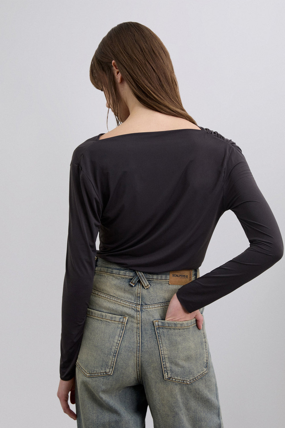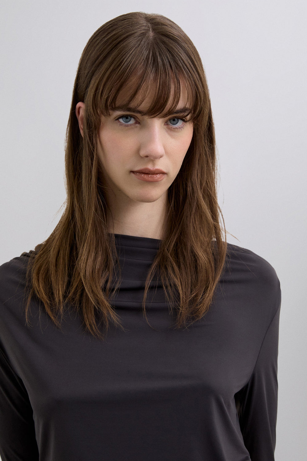 T-shirt de manga comprida com decote drapeado. Franzidos num ombro. Design ajustado.