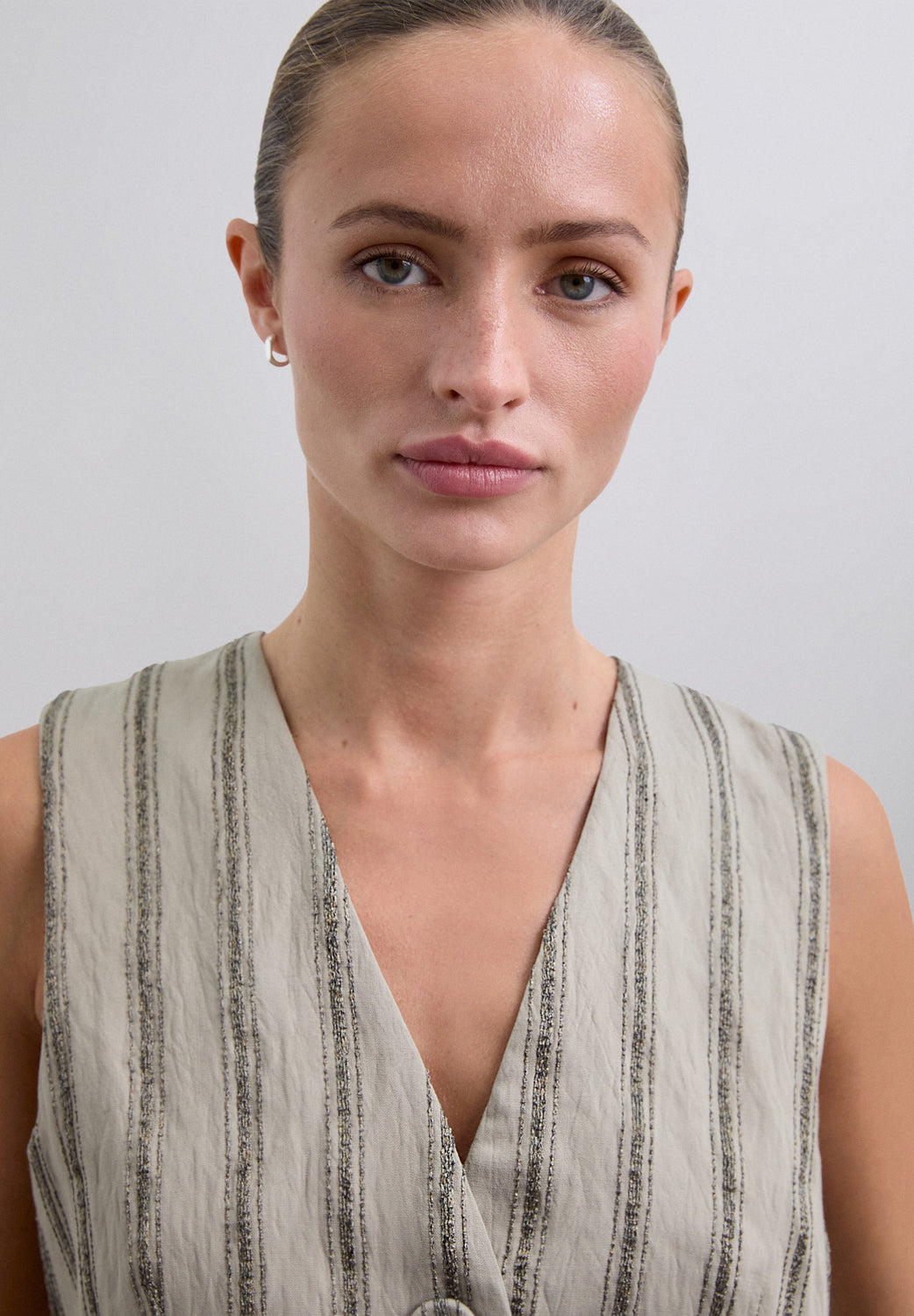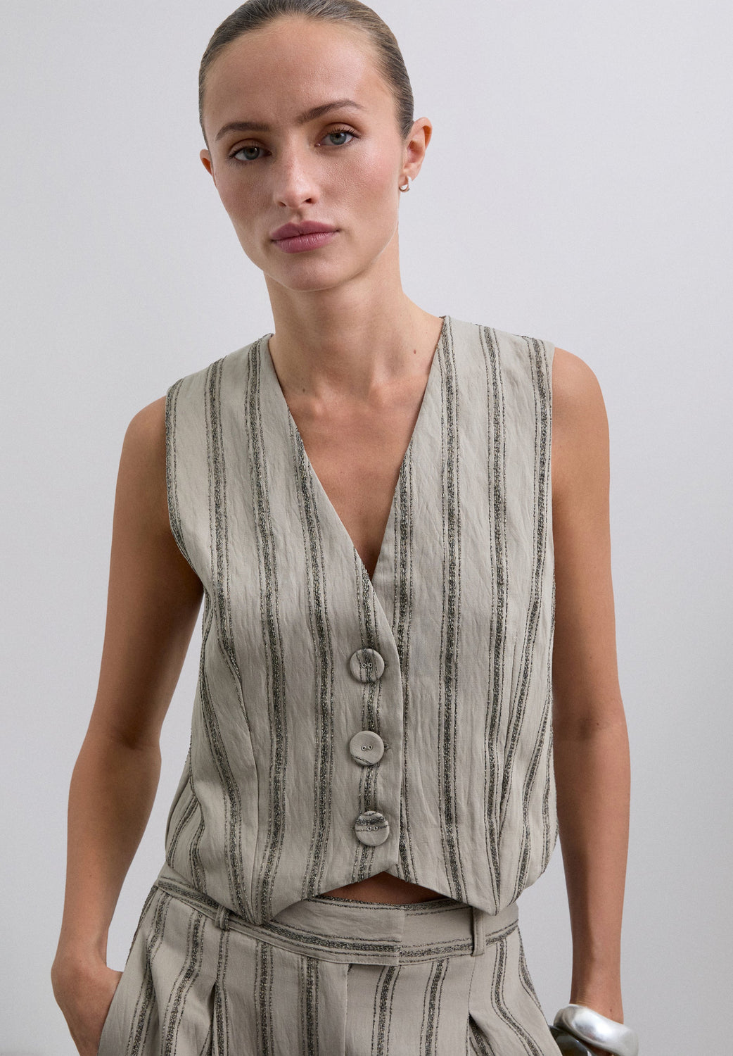 Colete às riscas com pormenores de fio metalizado. Confecionado em tecido fluido. Corte regular fit. Fecho com botões. Decote em bico. Manga cava.