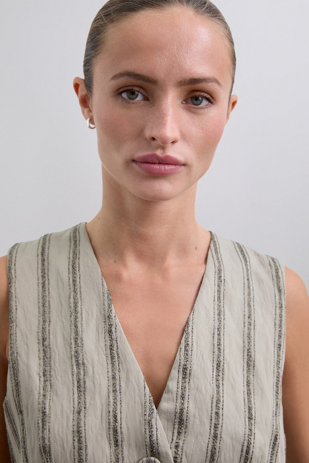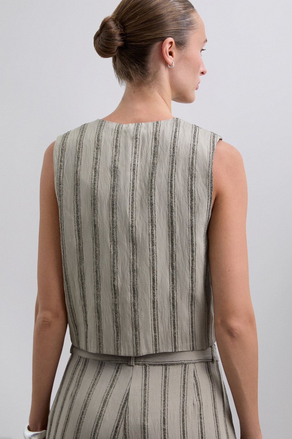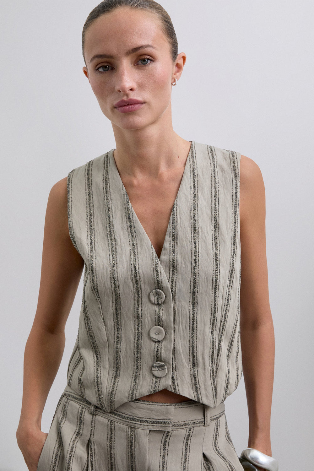 Colete às riscas com pormenores de fio metalizado. Confecionado em tecido fluido. Corte regular fit. Fecho com botões. Decote em bico. Manga cava.