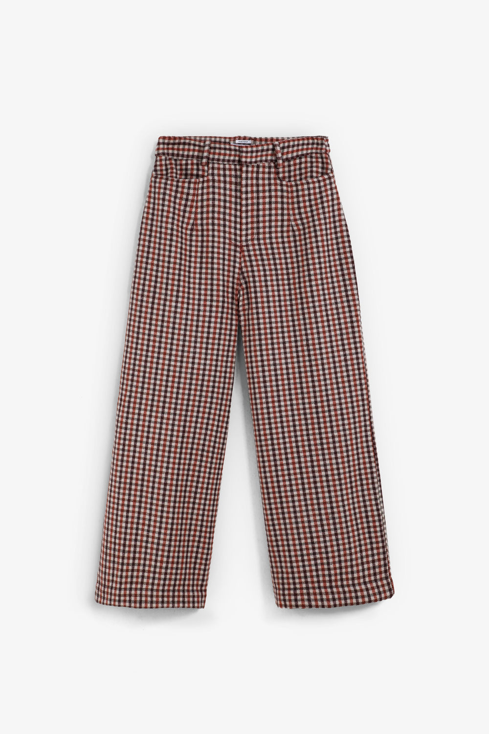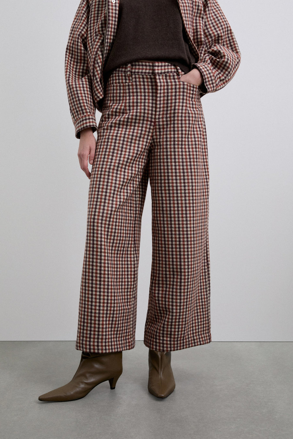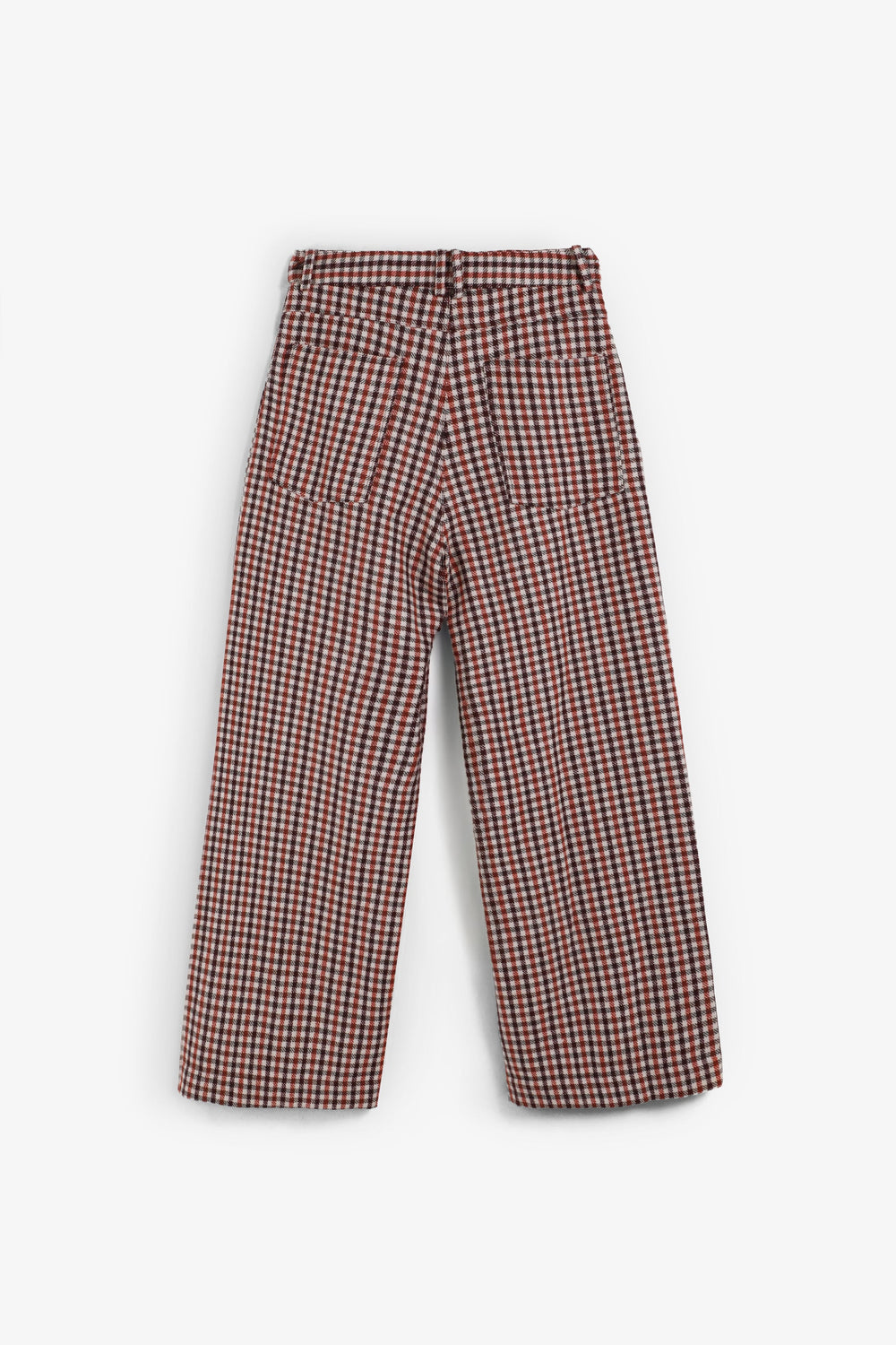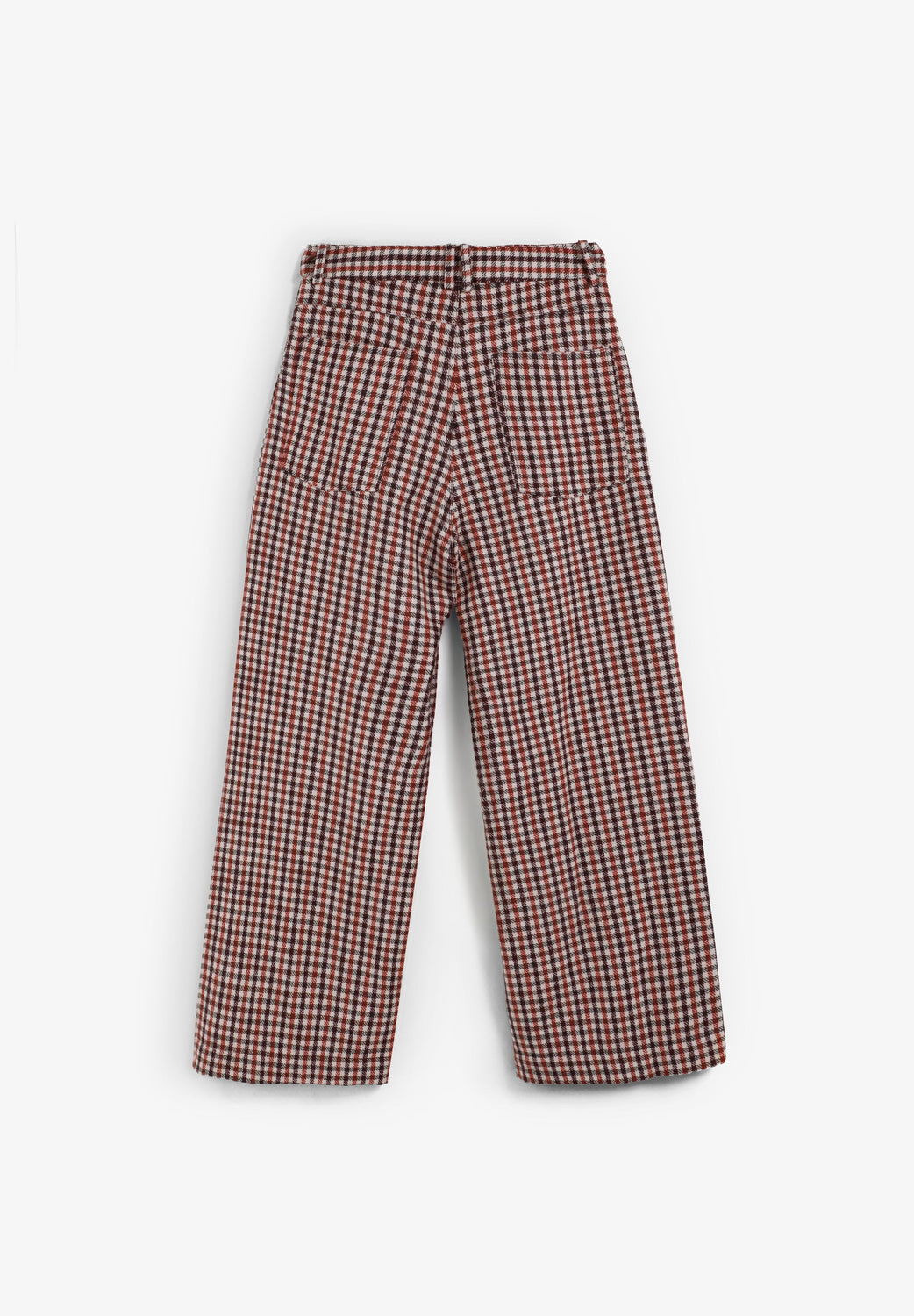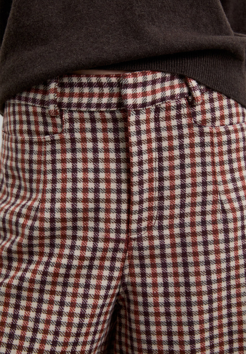 Calças culottes com padrão xadrez. Pormenor de pinça à frente. Quatro bolsos. Fecho de correr e botão.