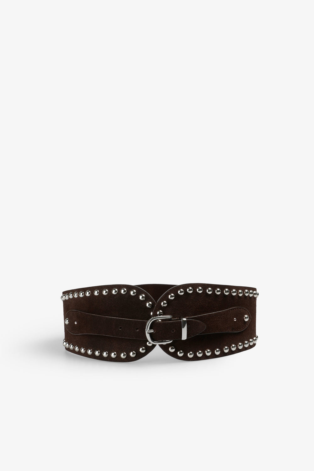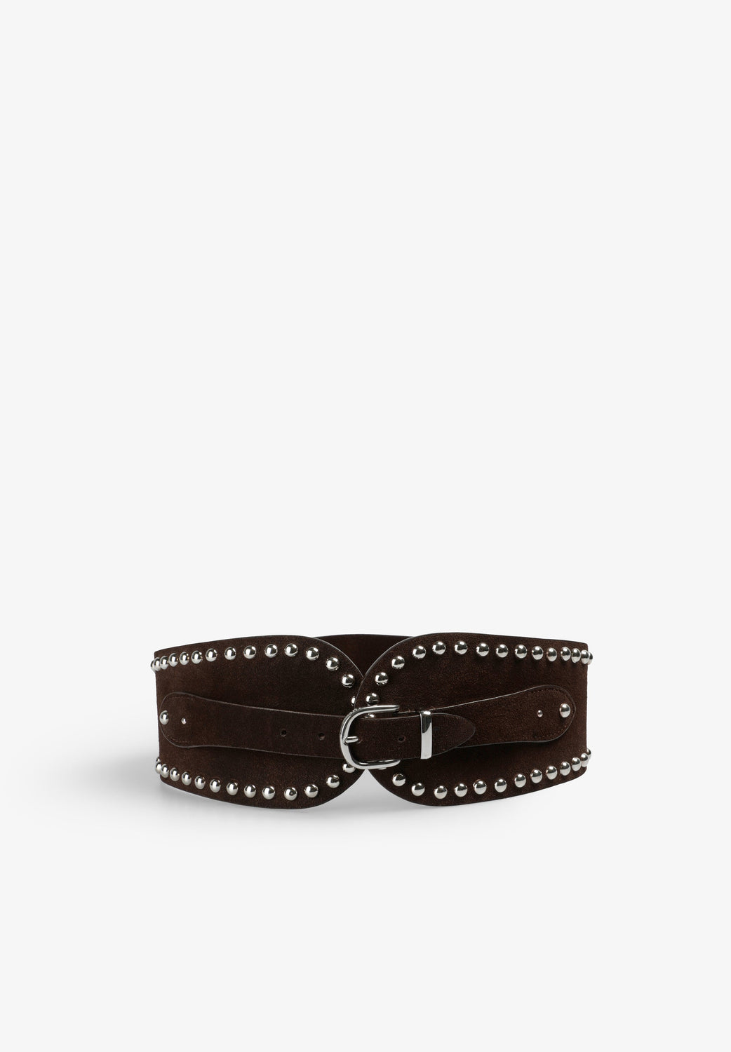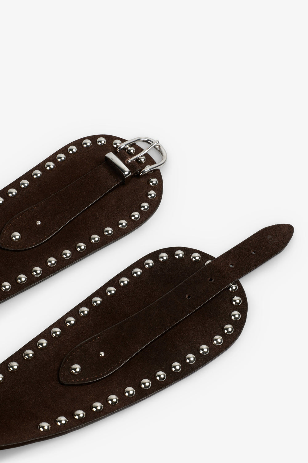 Cinto em faixa confecionado em 100% camurça bovina. Fivela metálica. Pormenor de tachas na parte superior e inferior. Ajustável.