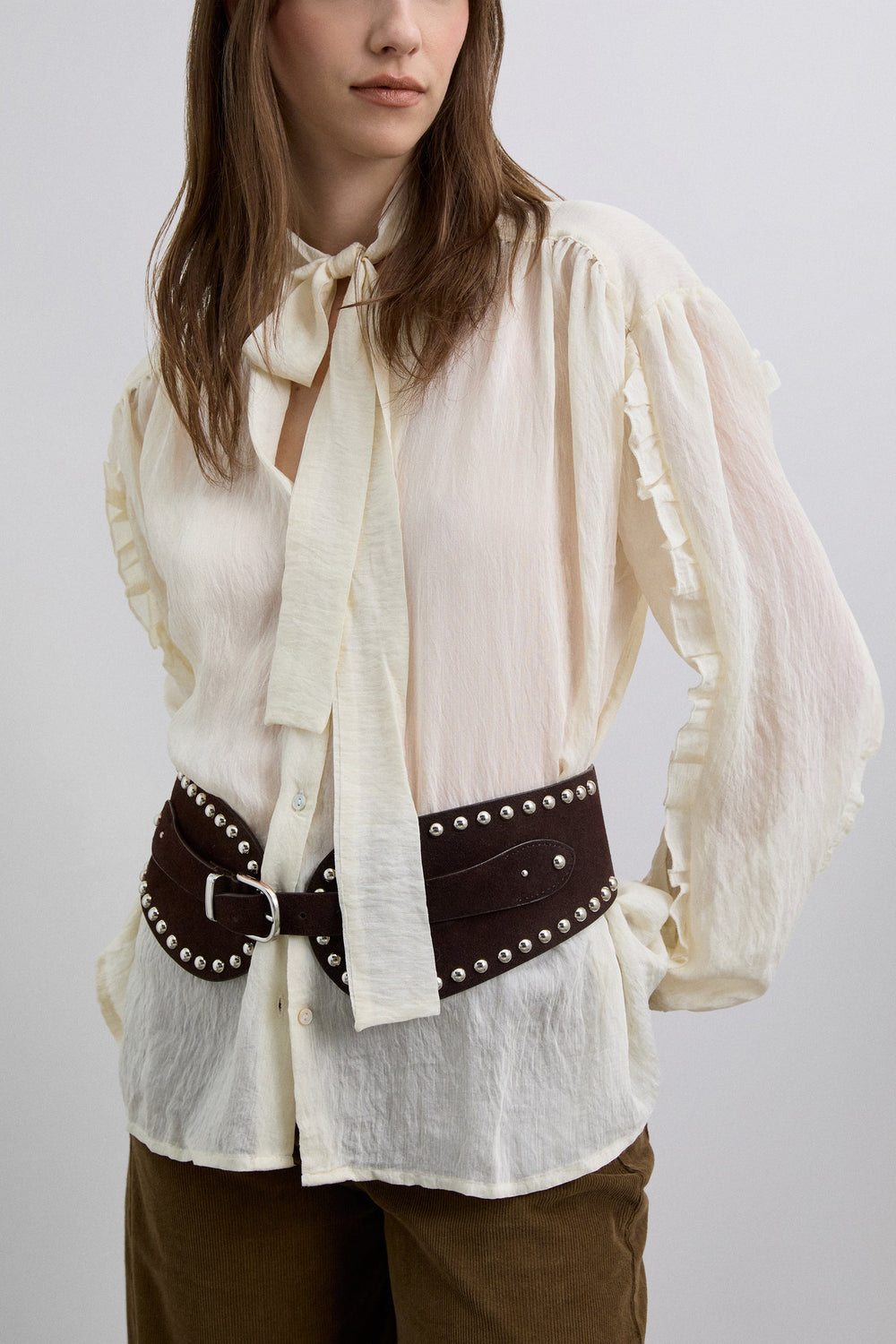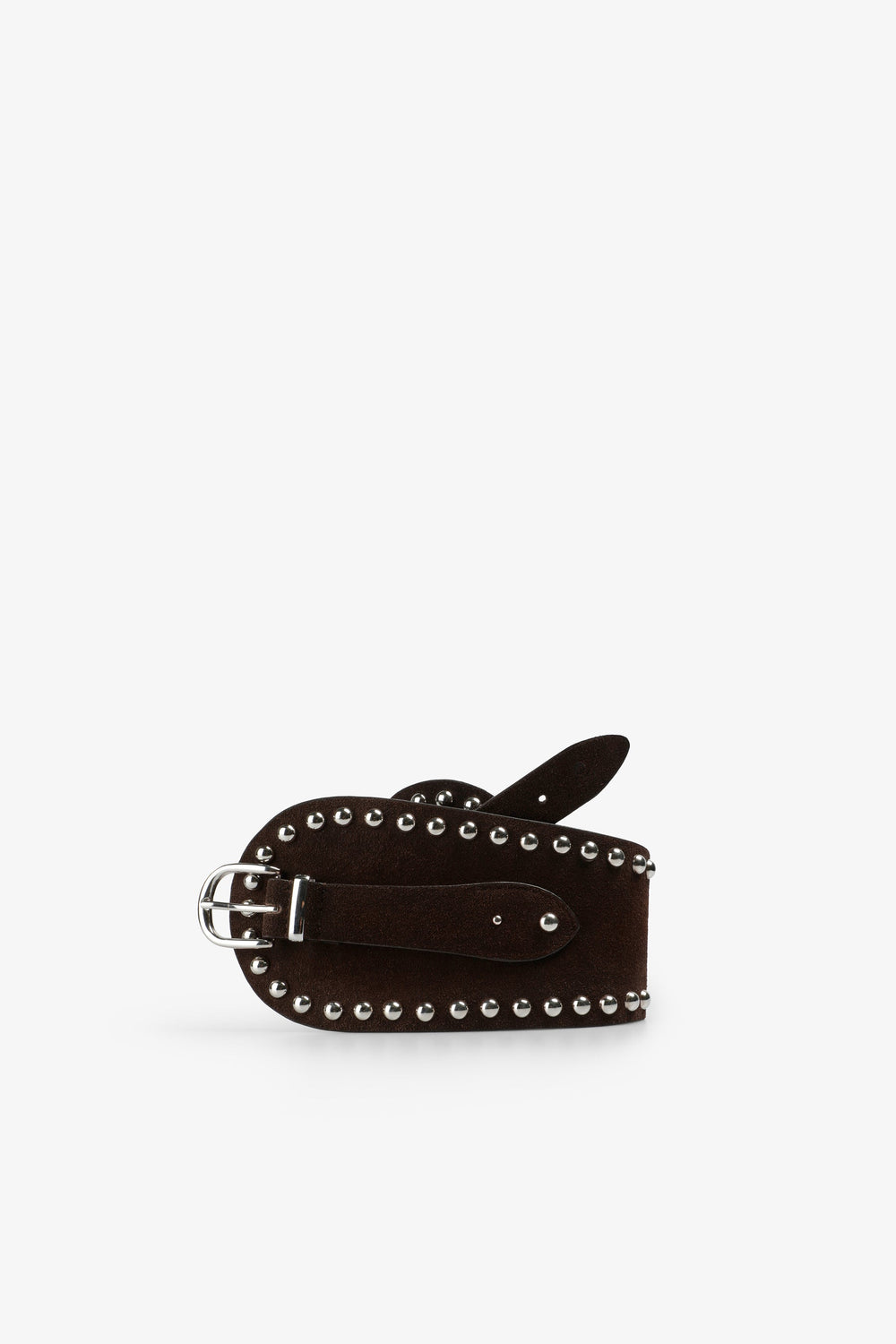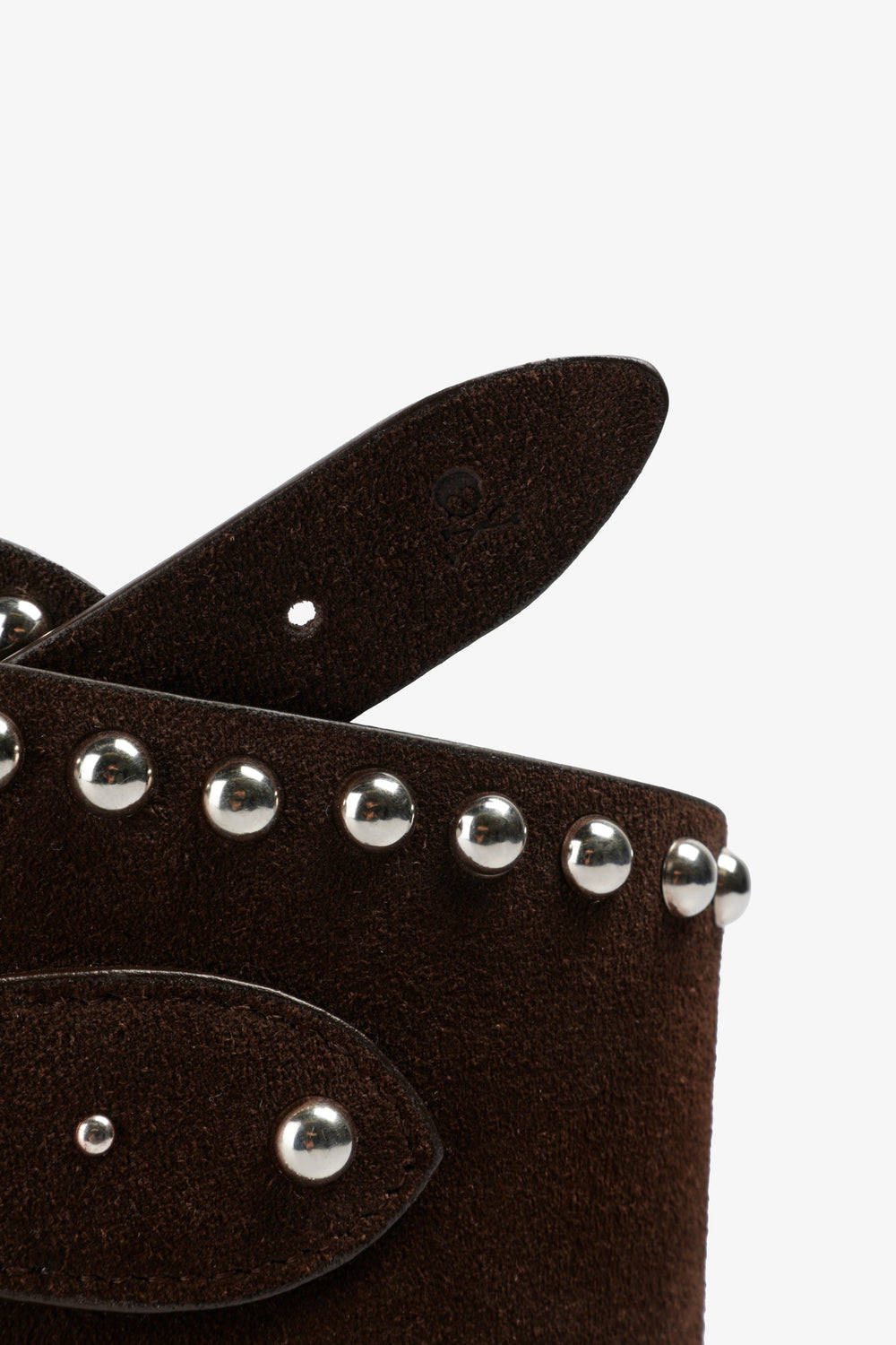 Cinto em faixa confecionado em 100% camurça bovina. Fivela metálica. Pormenor de tachas na parte superior e inferior. Ajustável.