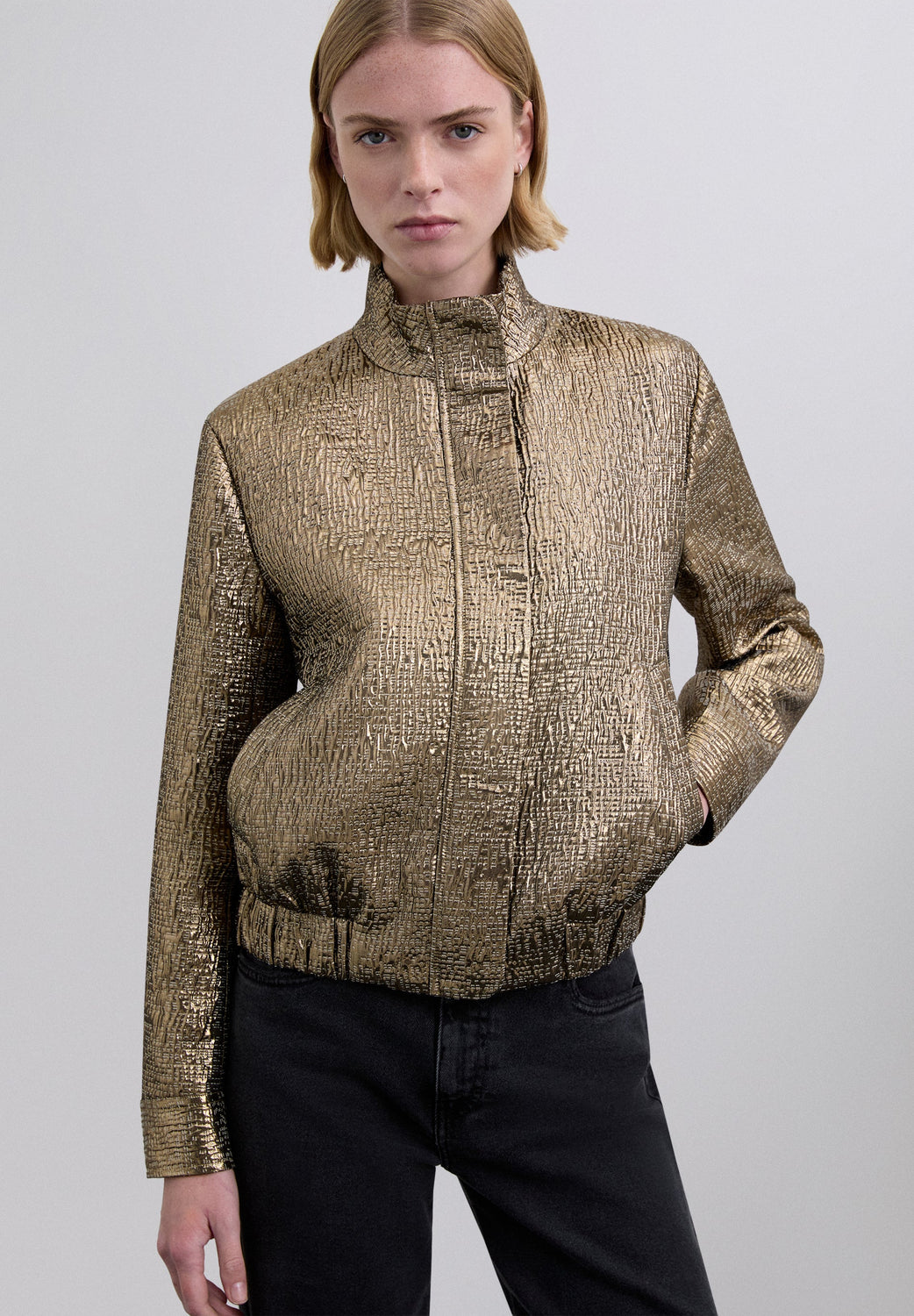 Casaco tipo bomber em jacquard com foil dourado. Manga comprida e fecho frontal com fecho de correr oculto. Gola alta, punhos de camisa e bolsos nas laterais. Bainha com cós elástica.