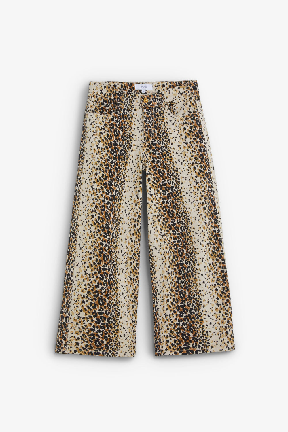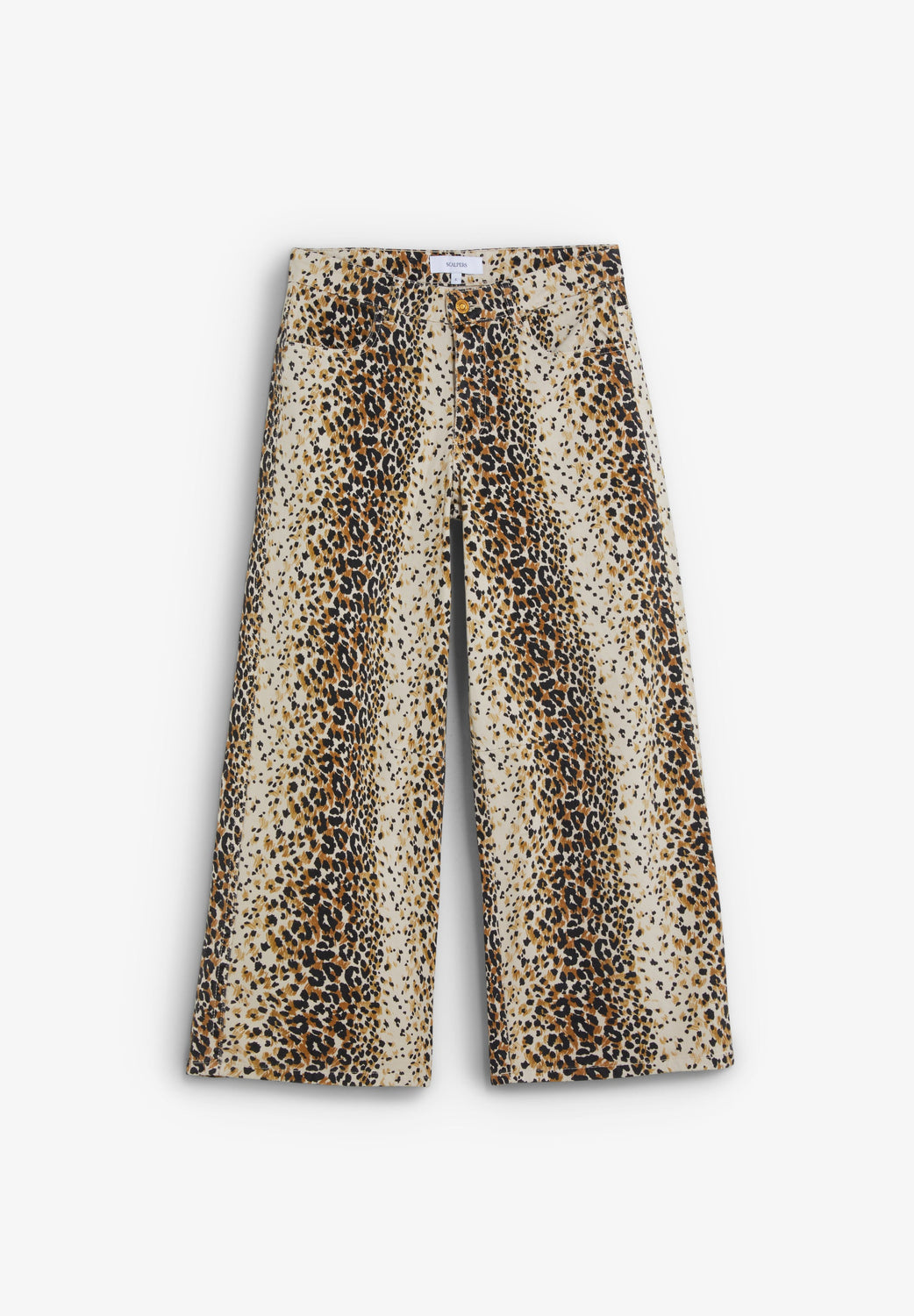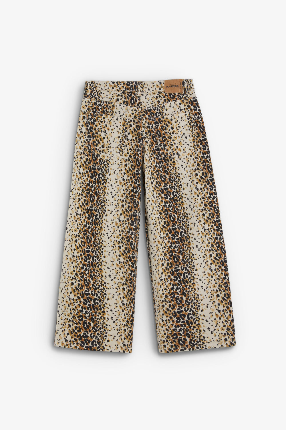 Calças confecionadas em algodão com padrão de estampado animal. Corte culottes. Pormenor de botão em dourado. Bolsos na parte da frente e de trás.