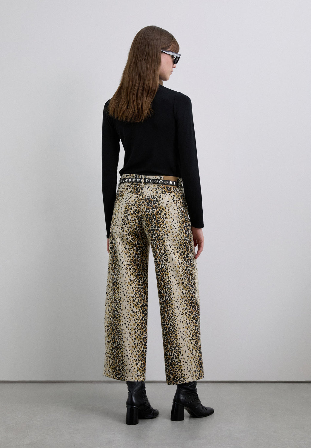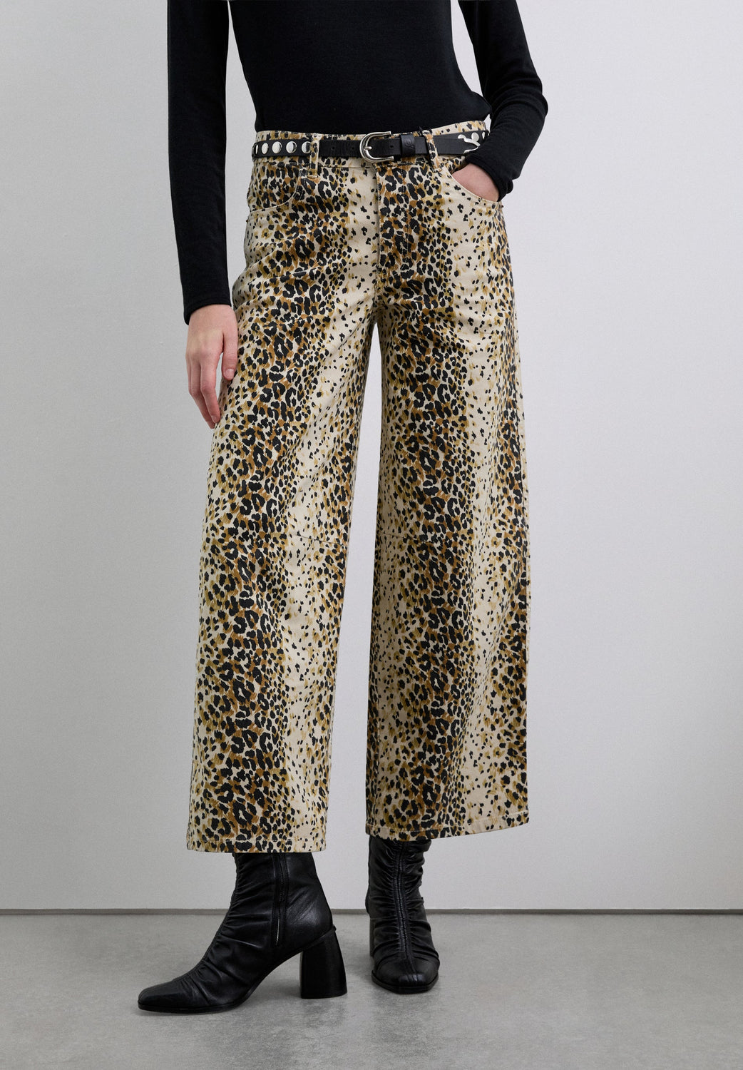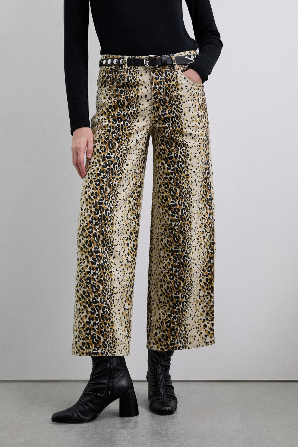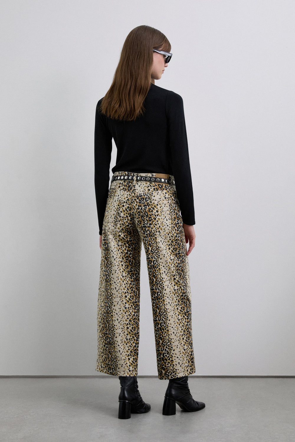 Calças confecionadas em algodão com padrão de estampado animal. Corte culottes. Pormenor de botão em dourado. Bolsos na parte da frente e de trás.