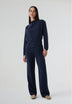 Calças Ramsos em cupro, de cor azul-marinho. Corte direito, mid waist e pormenor de fecho com botão duplo.