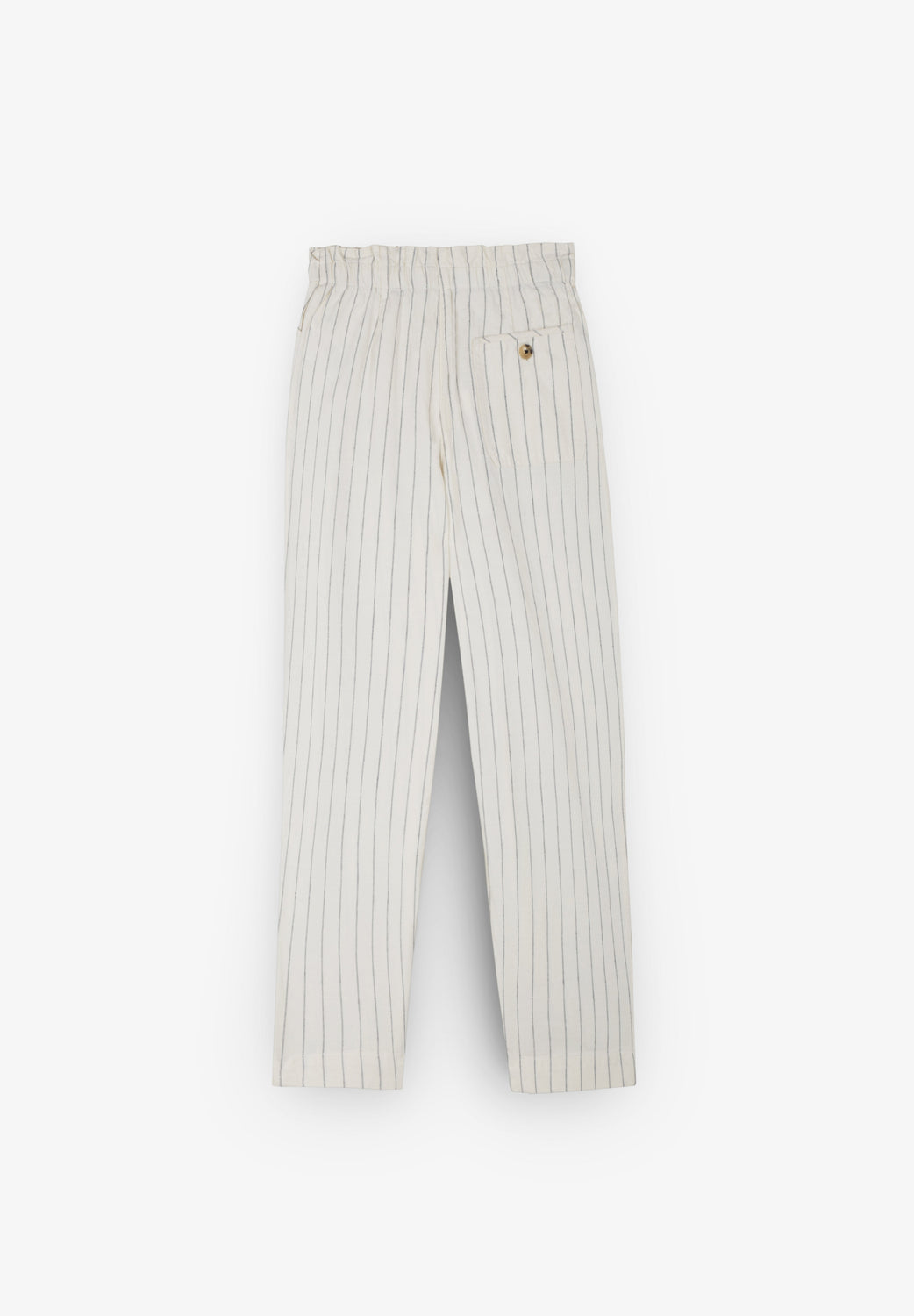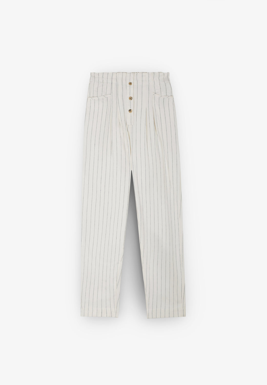 Calças Bellerose direitas. Confecionadas com cintura elástica. Abotoadura e bolso duplo à frente.