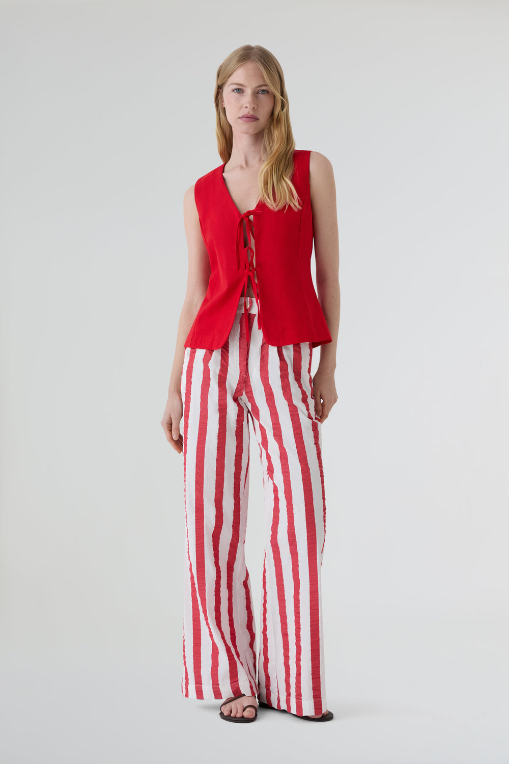 Top Thinking MU confecionado em tecido 100% algodão orgânico, com decote em V, sem mangas, fit justo e fecho frontal com laços.