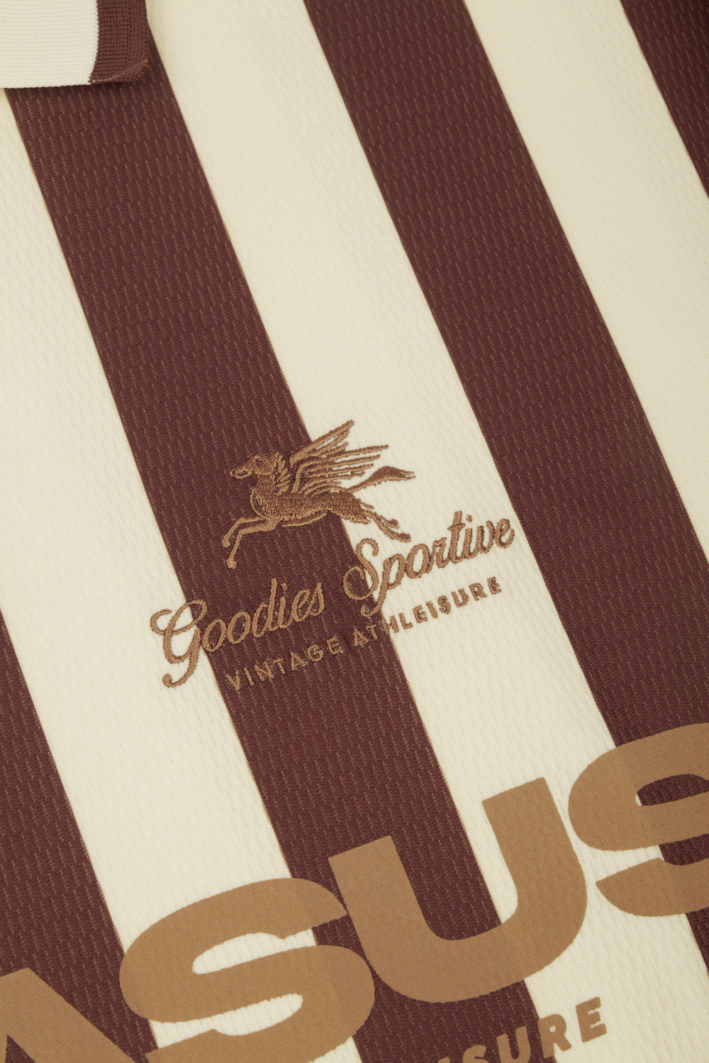T-shirt Goodies de futebol vintage confecionada em poliéster de 250 g, personalizada com padrão de pégaso, bordado castanho à esquerda e remendo com feltro à direita.