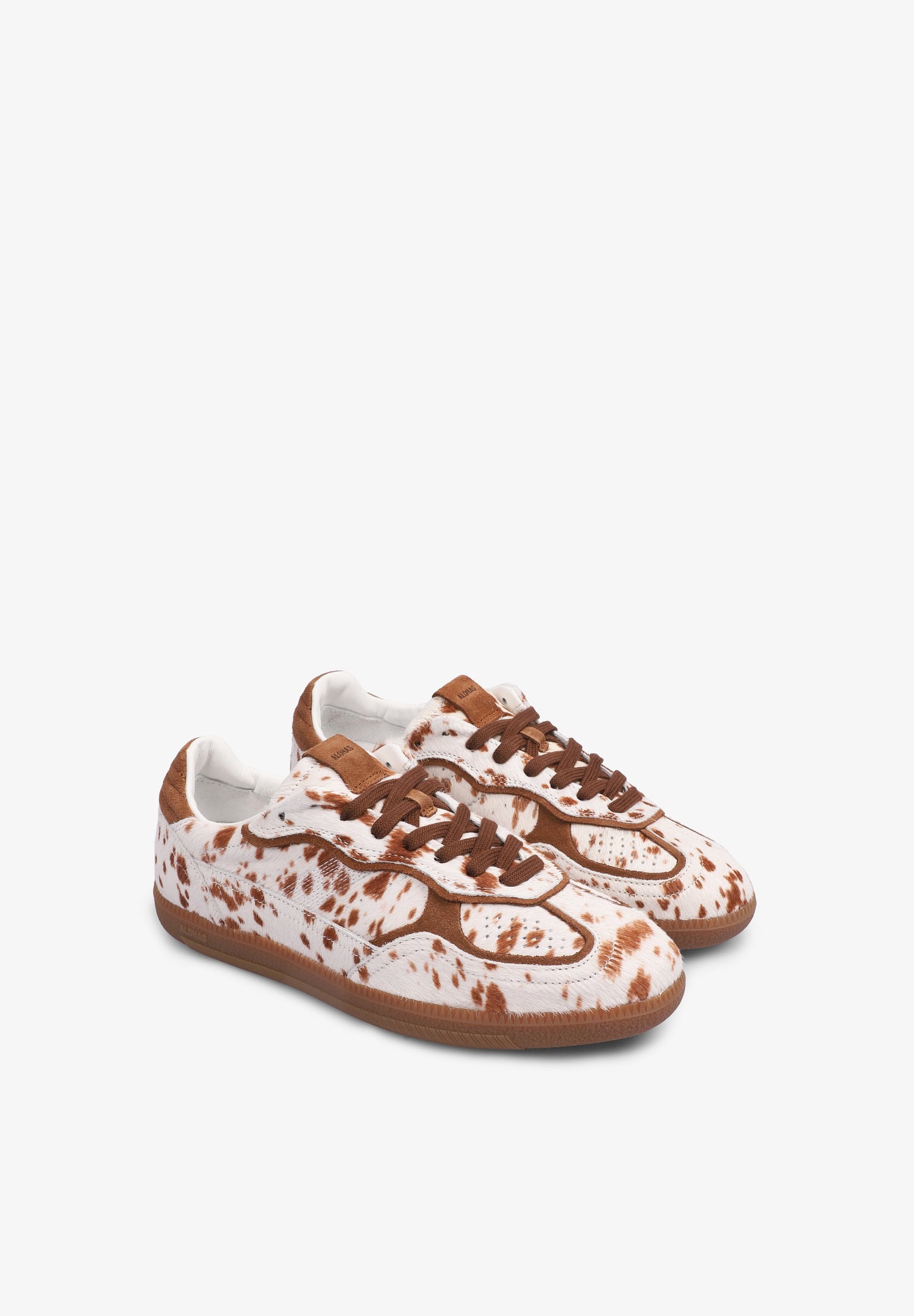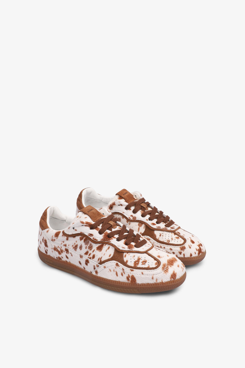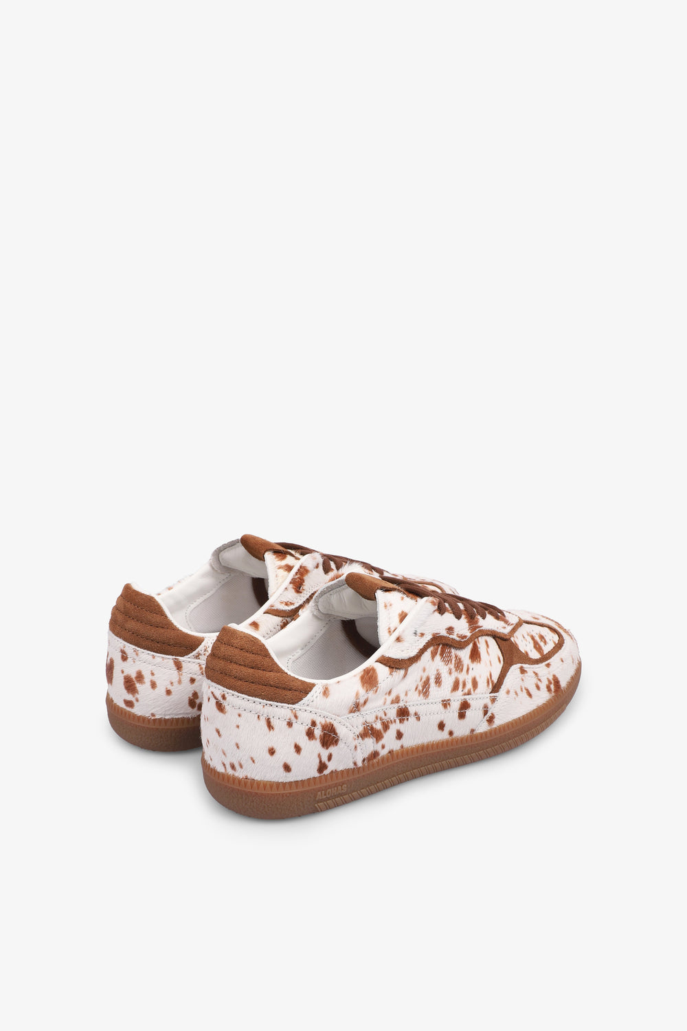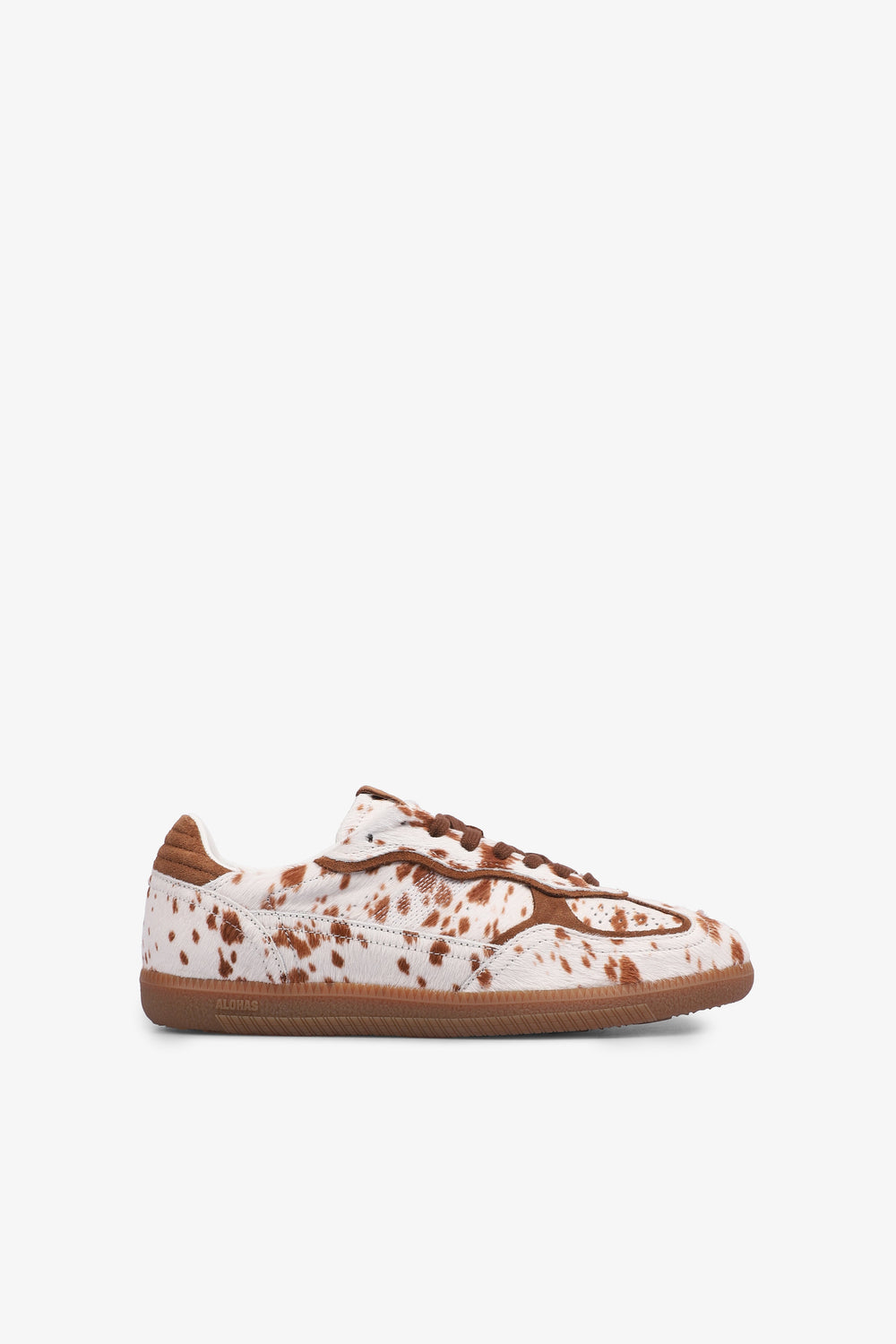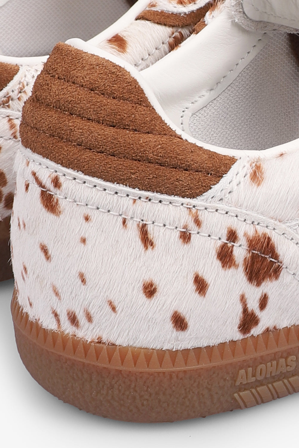Sapatilhas Alohas confecionadas em 100% pele de bovino. Uma versão das clássicas TB.490 Rife em pelo de pónei de cor creme com um padrão de pele de bovino camel. Sola de caucho rugosa e pormenor de língua na aba a contrastar, costuras exposta e carimbos de logótipo.