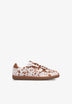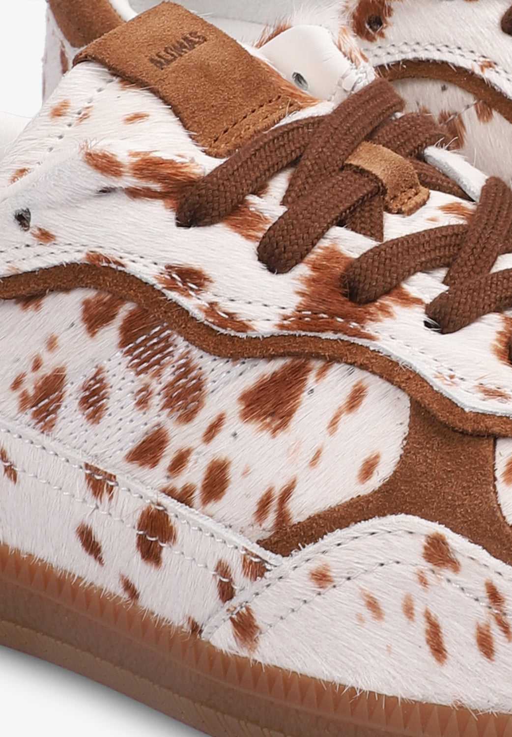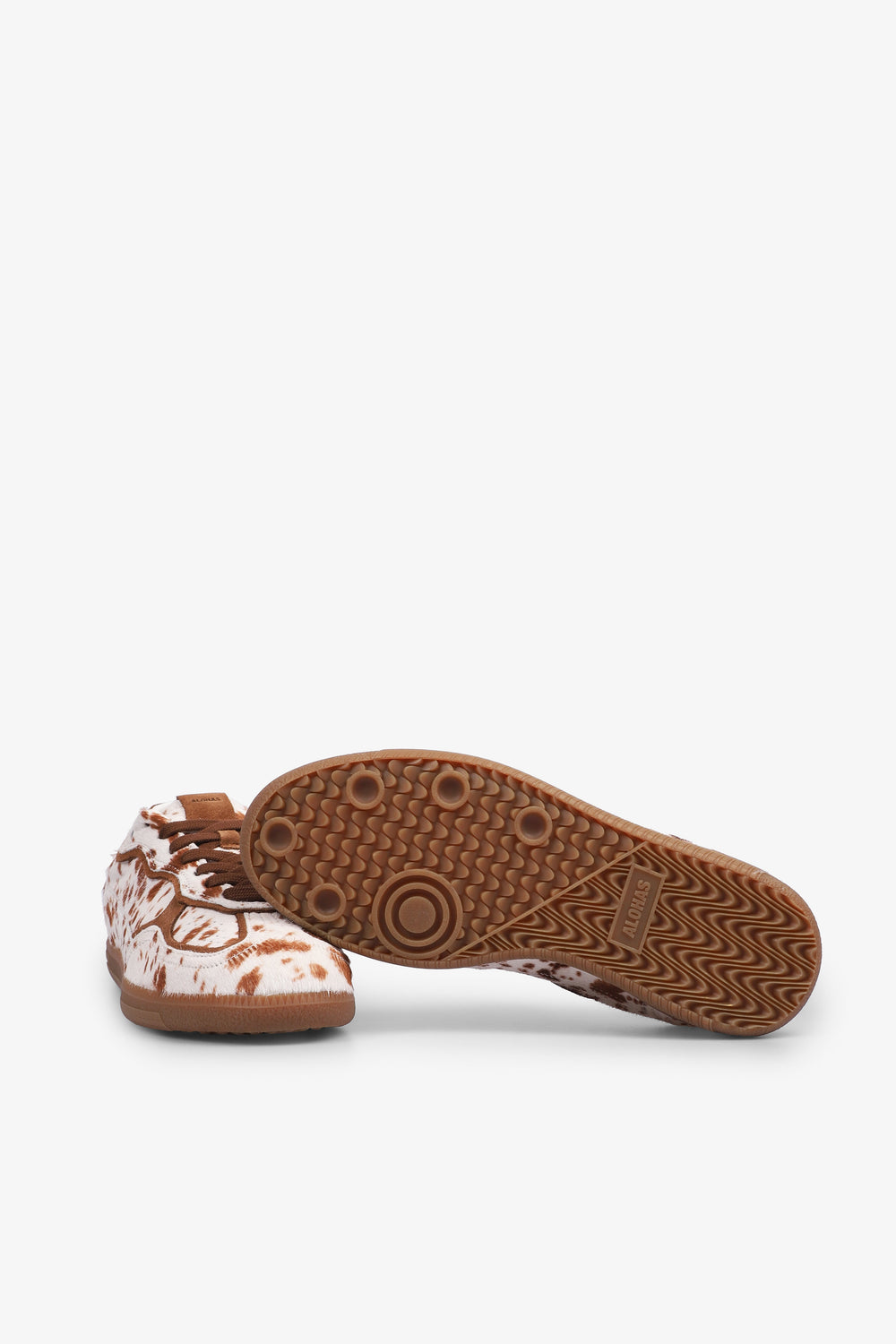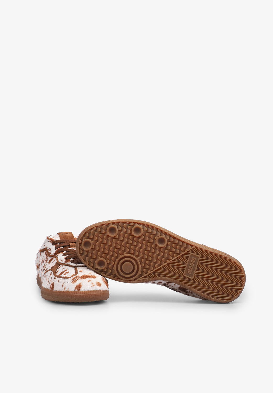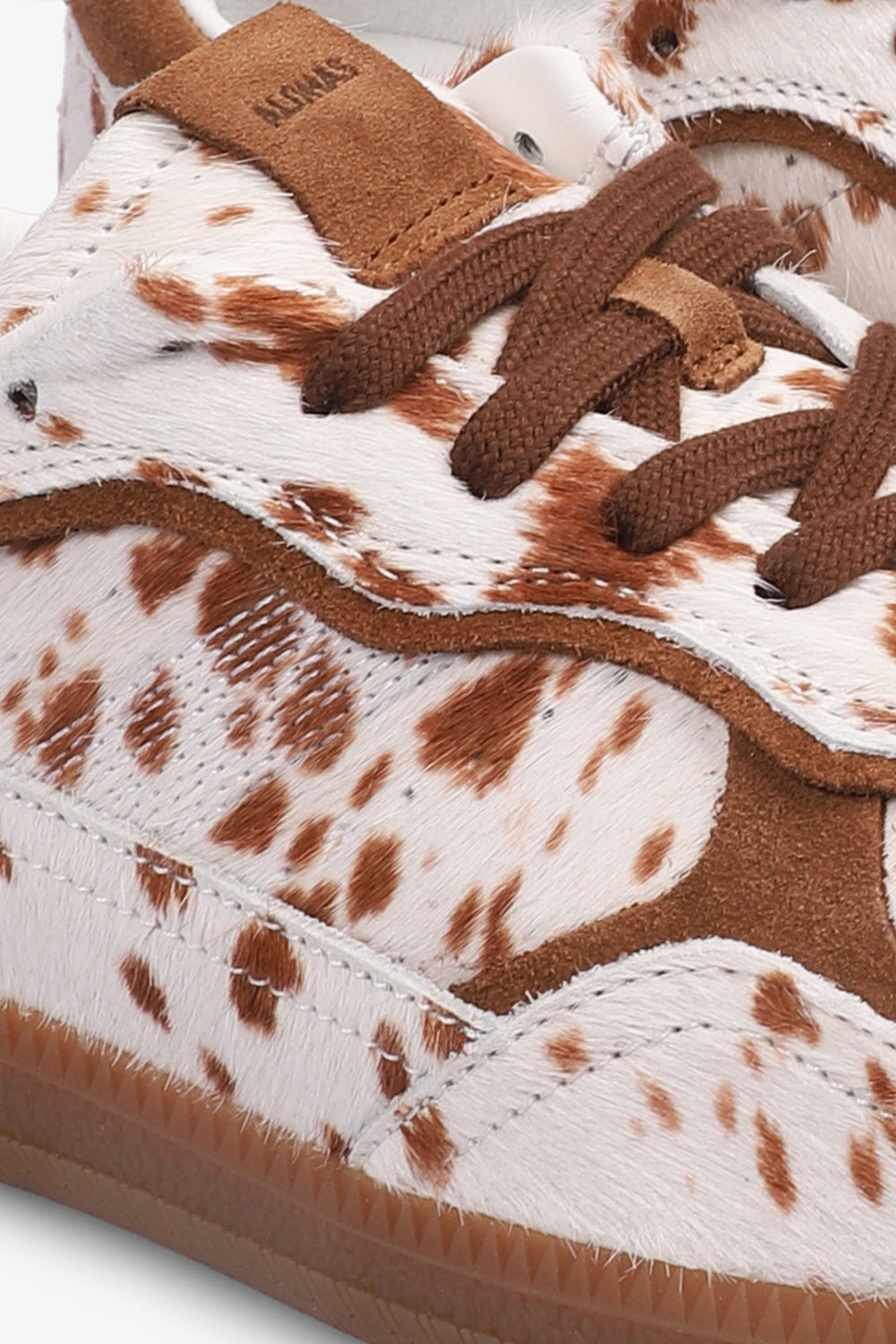 Sapatilhas Alohas confecionadas em 100% pele de bovino. Uma versão das clássicas TB.490 Rife em pelo de pónei de cor creme com um padrão de pele de bovino camel. Sola de caucho rugosa e pormenor de língua na aba a contrastar, costuras exposta e carimbos de logótipo.