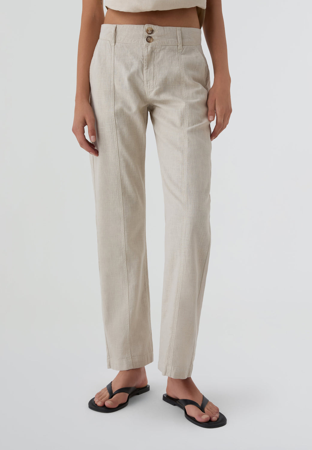 Calças de linho Ramsos em cor bege, confecionadas em 100% linho, de cintura baixa com corte direito, fecho de duplo botão na cintura e costuras nas perneiras.