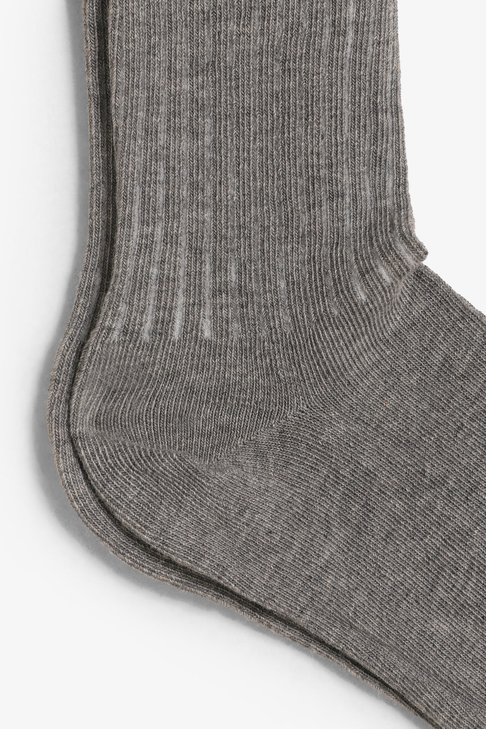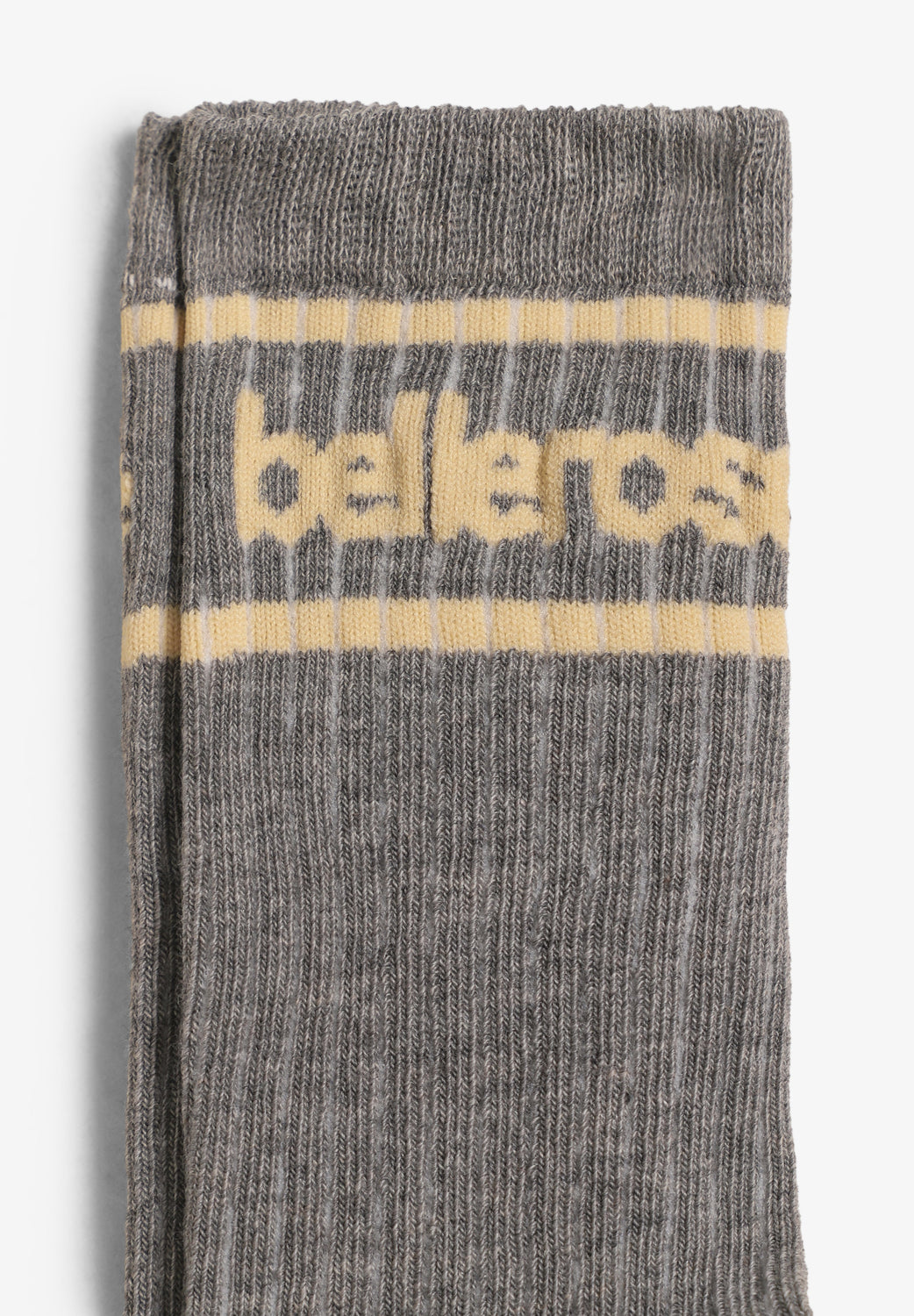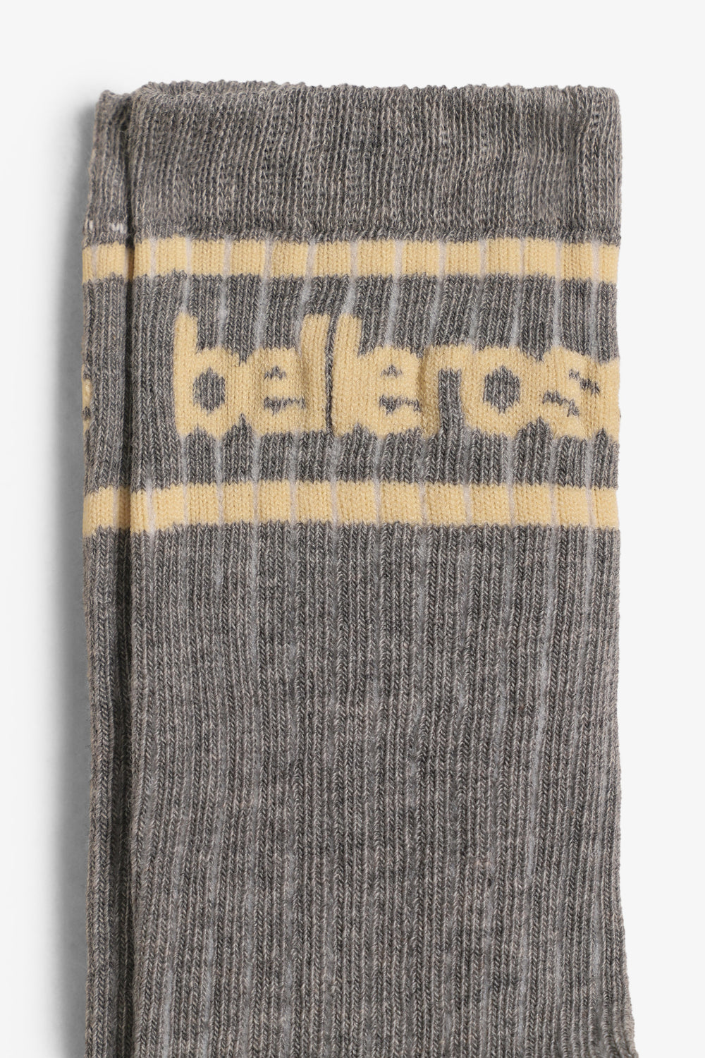 Meias Bellerose confecionadas em 70% algodão, 3% elastano, 27% poliamida. Pormenor de logótipo da marca na parte superior.