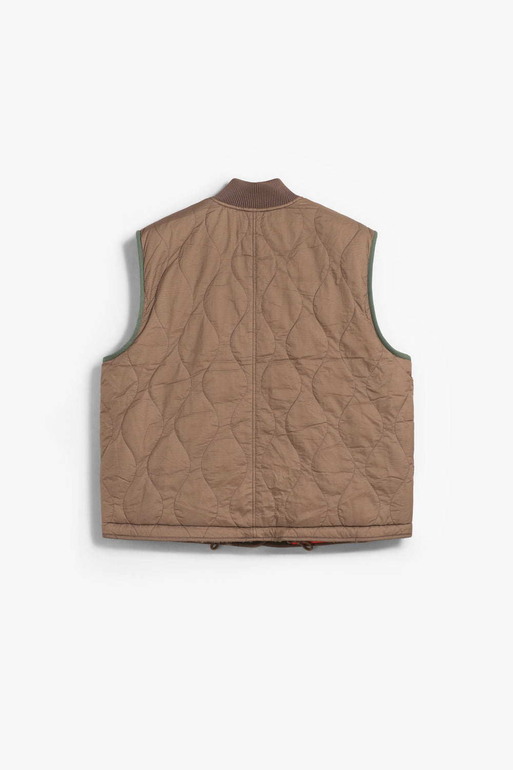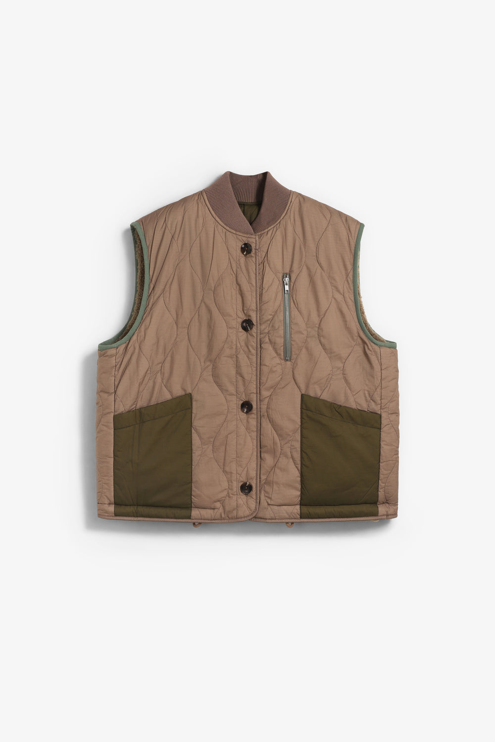 Colete reversível Bellerose confecionado em 100% poliamida e forro de poliéster. Com forro polar com bolsos de aba em contraste de um lado e tecido acolchoado com bolsos de aba em contraste no outro. Gola estilo bomber caneladas, pormenores de encaixe, bainha com cordão e fecho de botão.