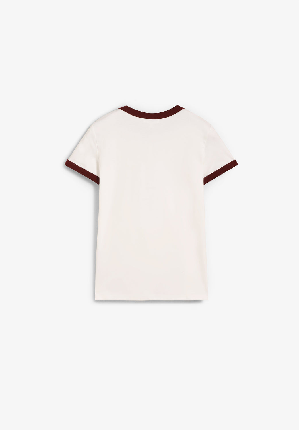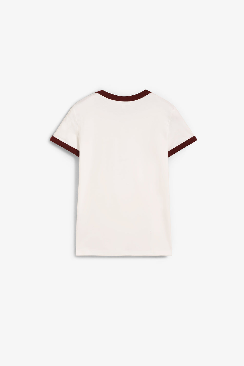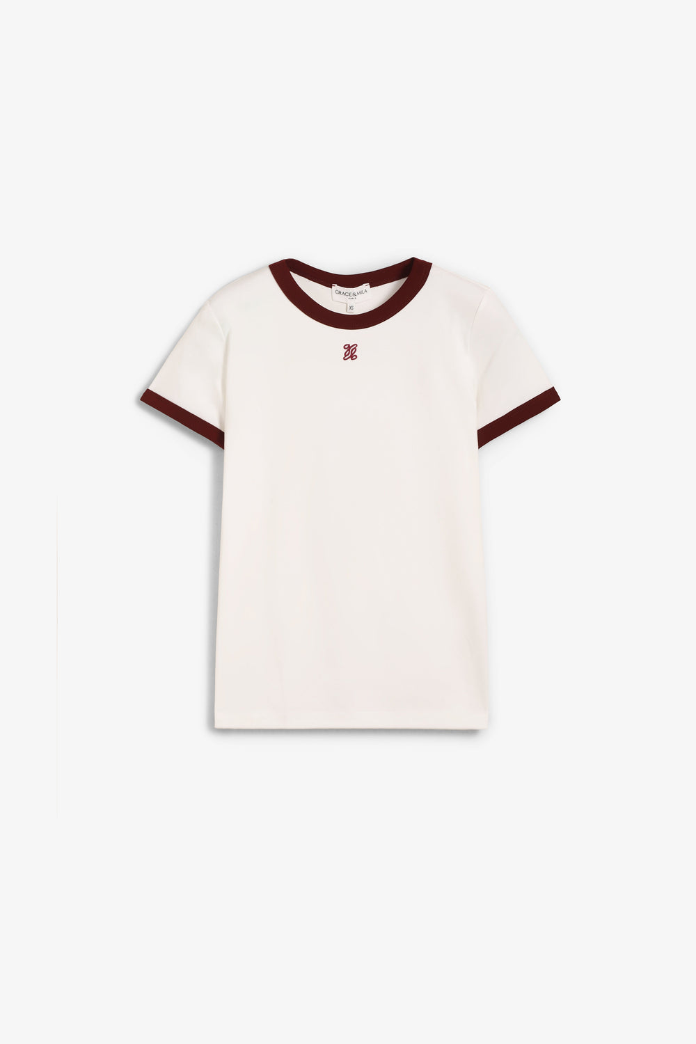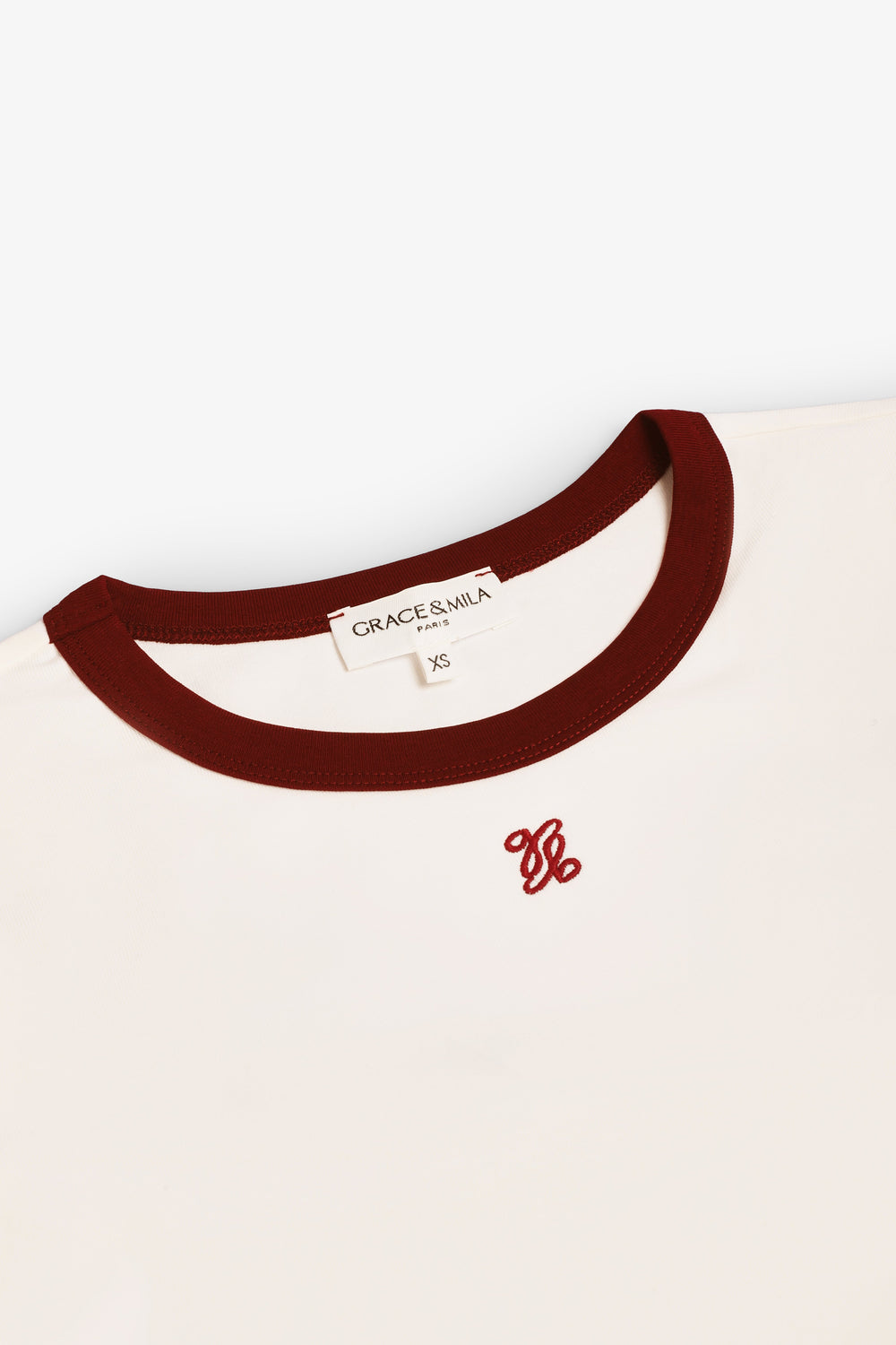 T-shirt Grace & Mila confecionada em 92% algodão e 8% elastano. Com manga curta, inspiração rétro e monograma G&M bordado à frente. Debruns coloridos em contraste na gola e nas mangas.