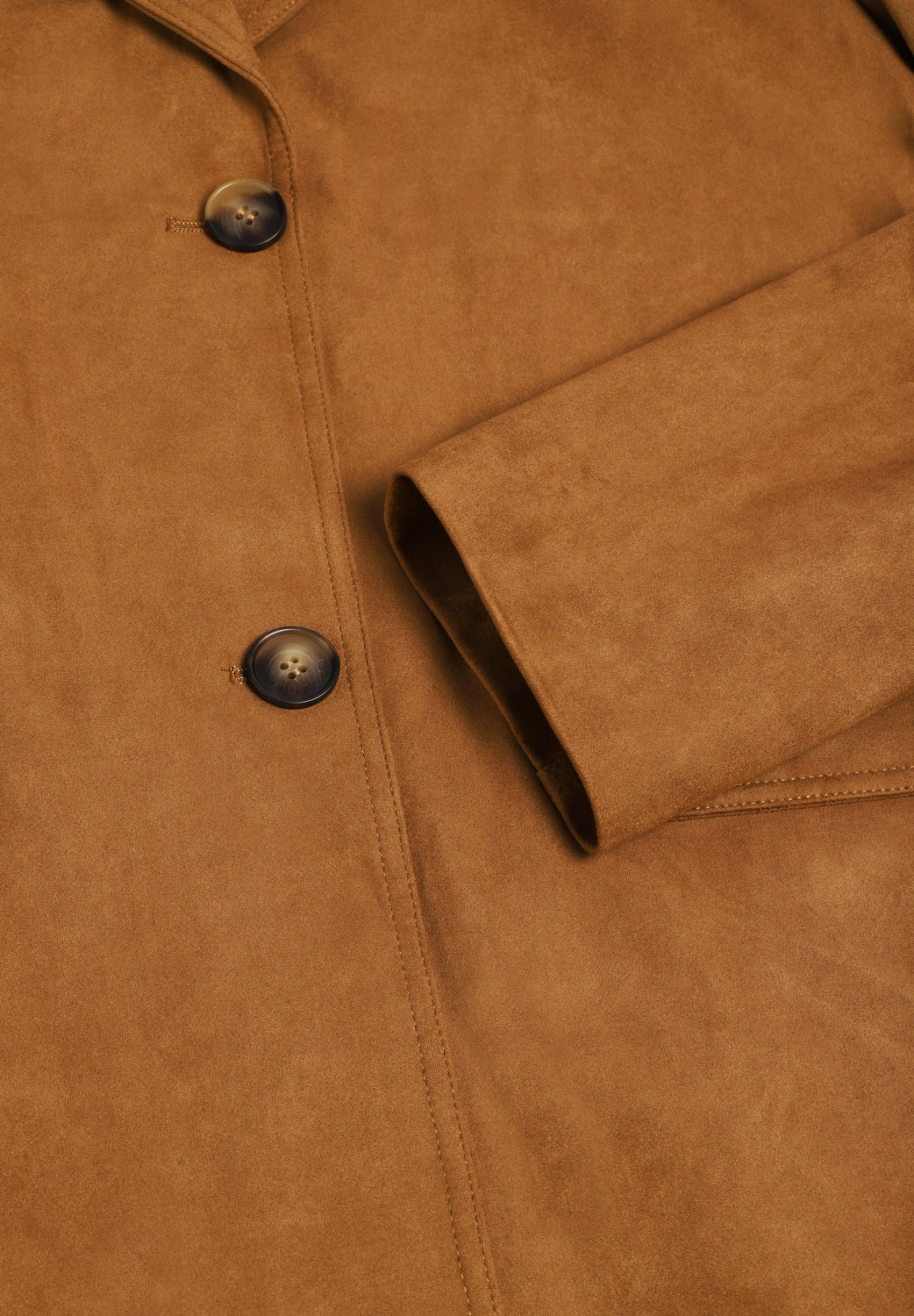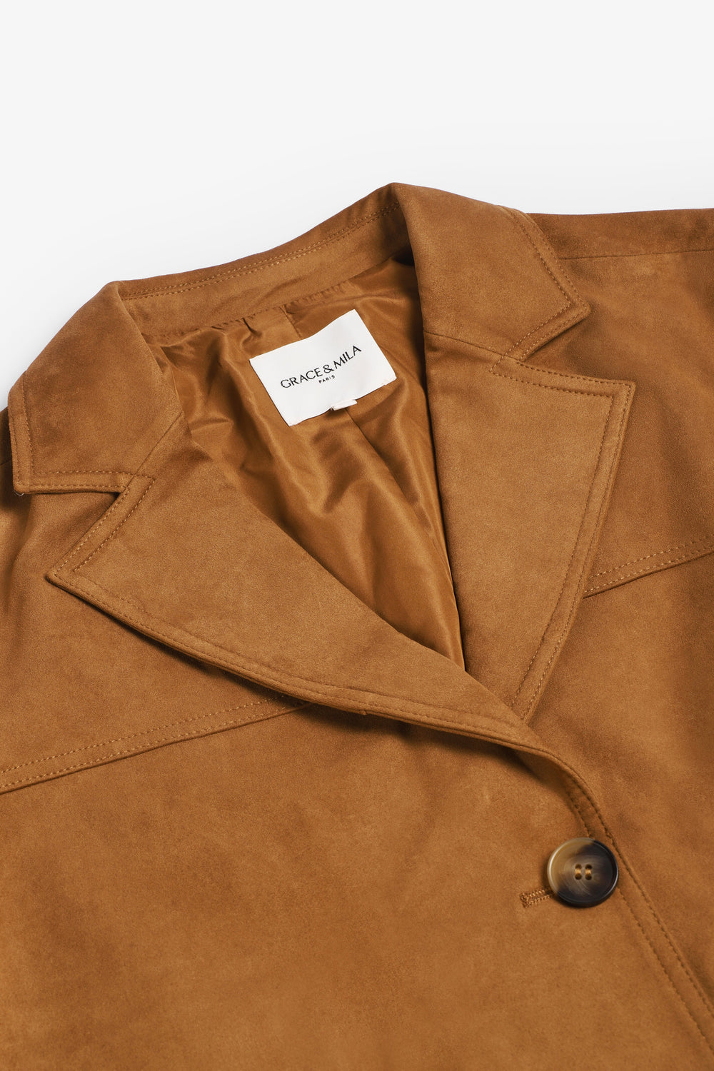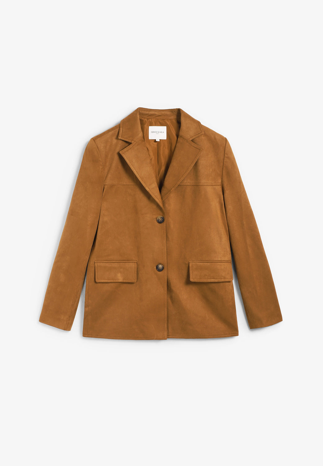 Blazer Grace & Mila confecionado em 90% poliéster e 10% elastano. Esta peça de roupa é inspirada na alfaiataria clássica com um toque contemporâneo. O tecido de camurça e o corte a direito criam uma silhueta estruturada. Com pormenores como uma gola lapela, bolsos com aba à frente e carcela de botões.