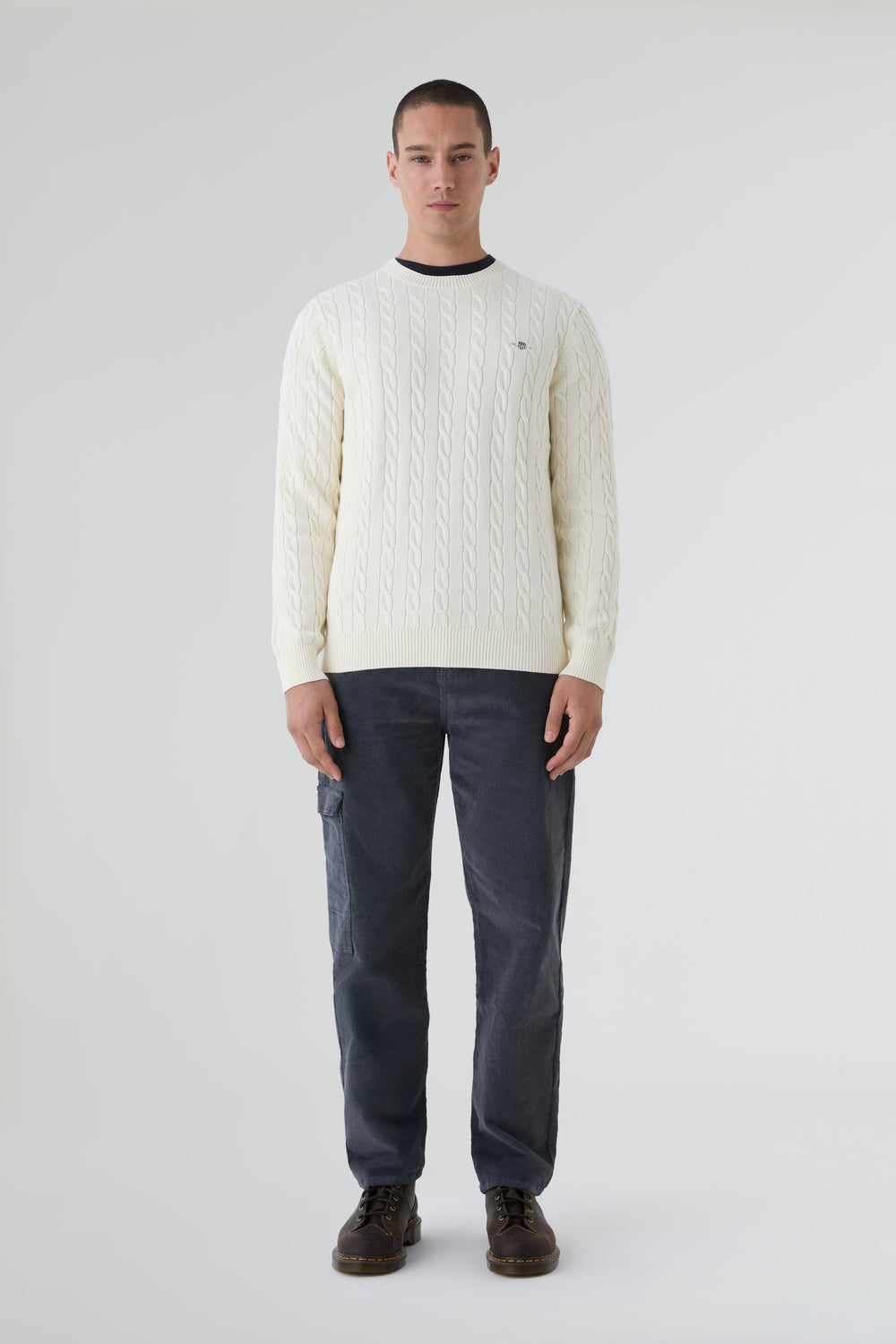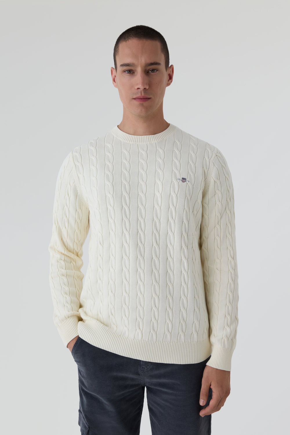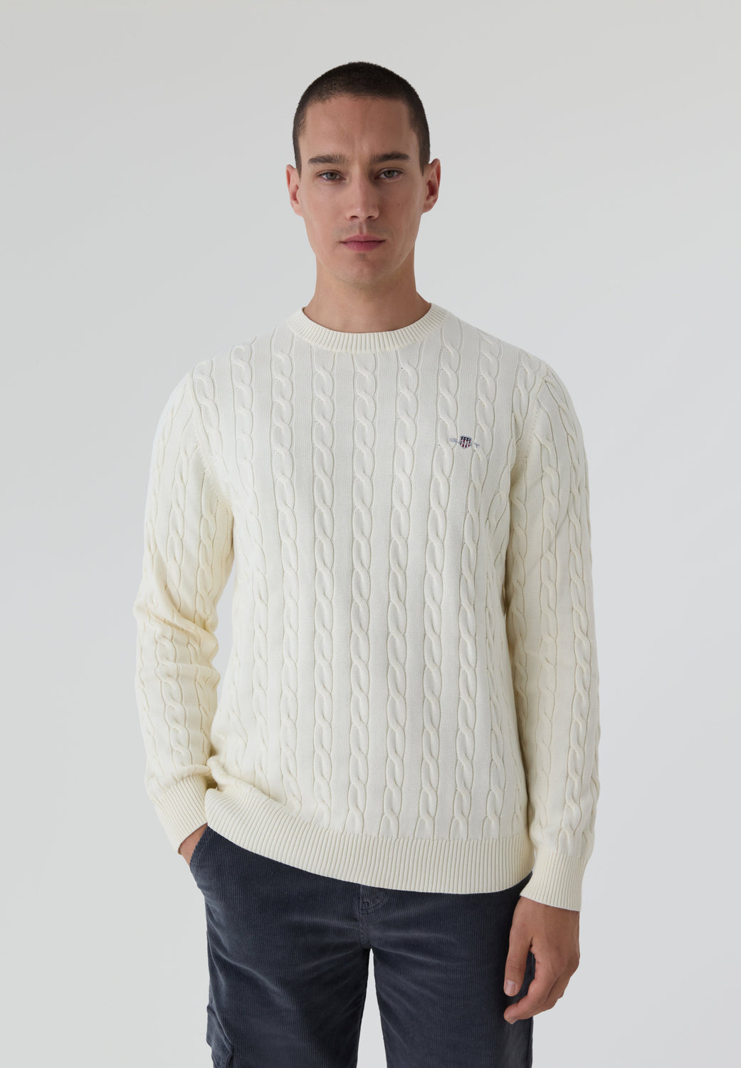Sweater Gant confecionada em 100% algodão com um design em malha de cabo, corte regular e decote redondo. Pormenor de insígnia Gant bordada no peito e terminações caneladas no decote, na bainha e nos punhos.