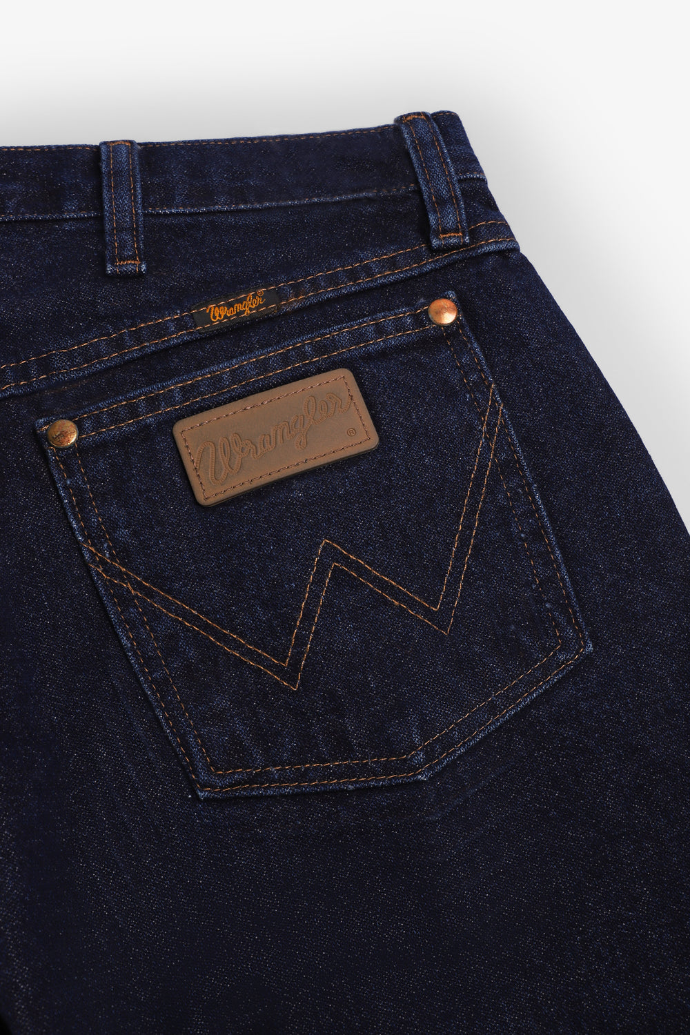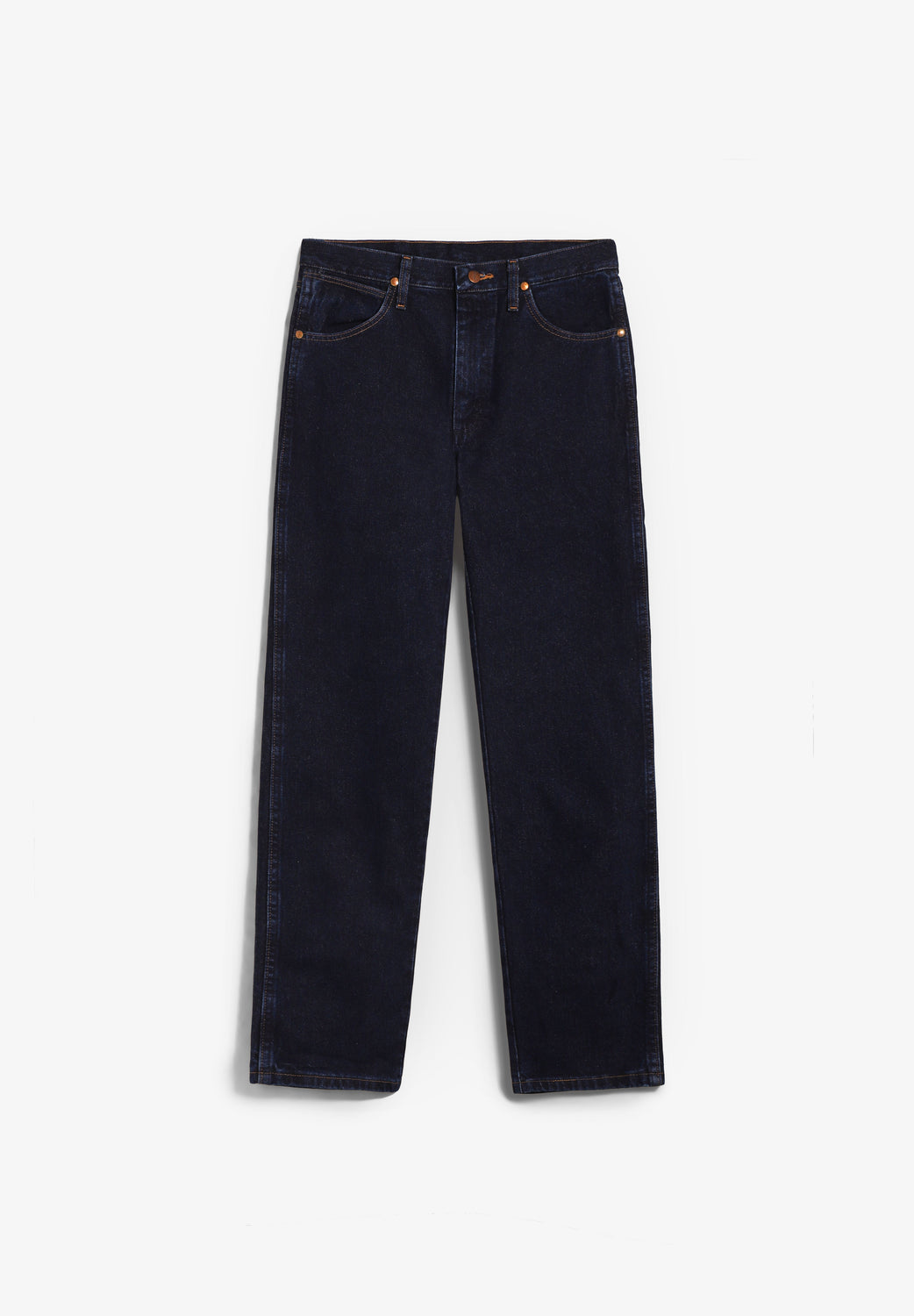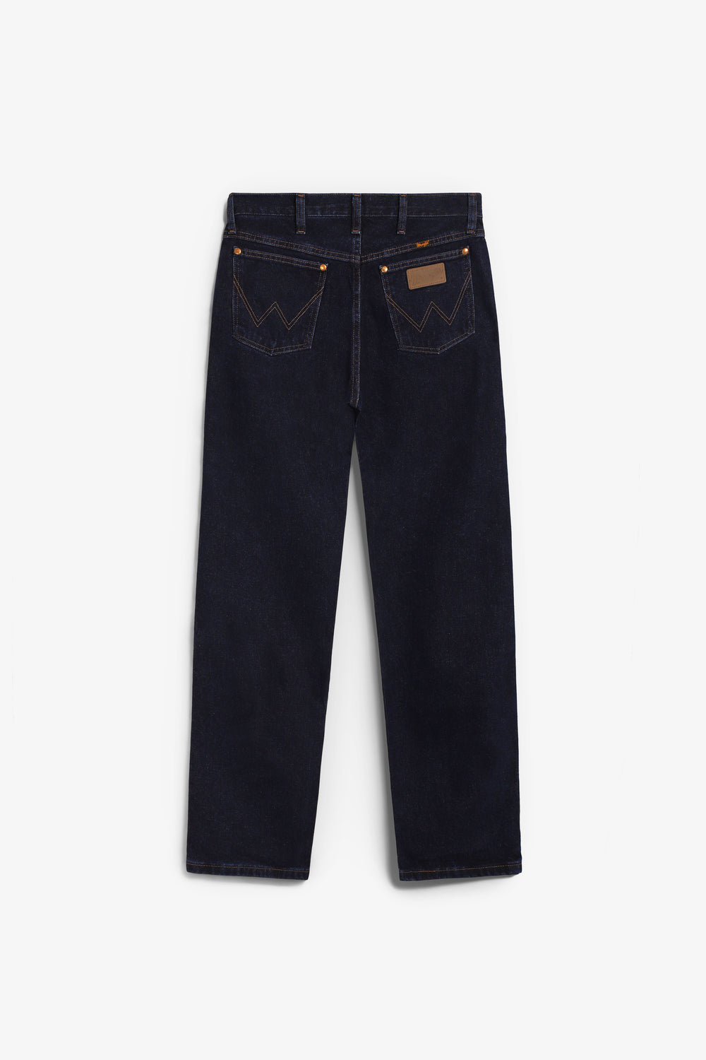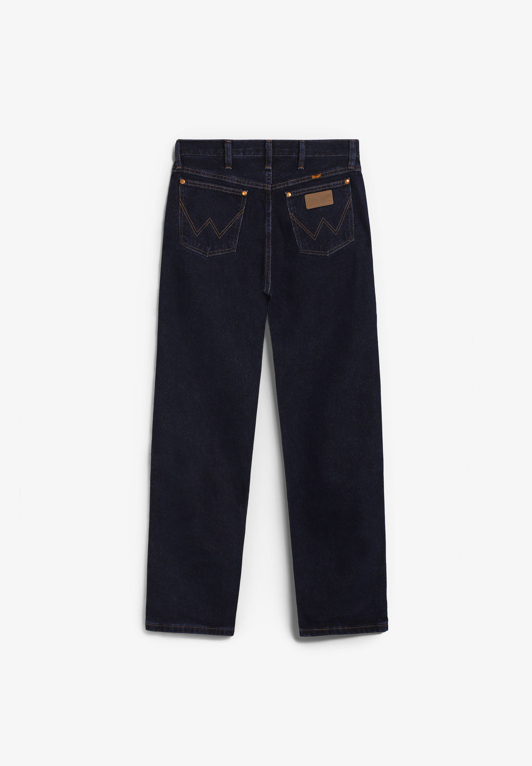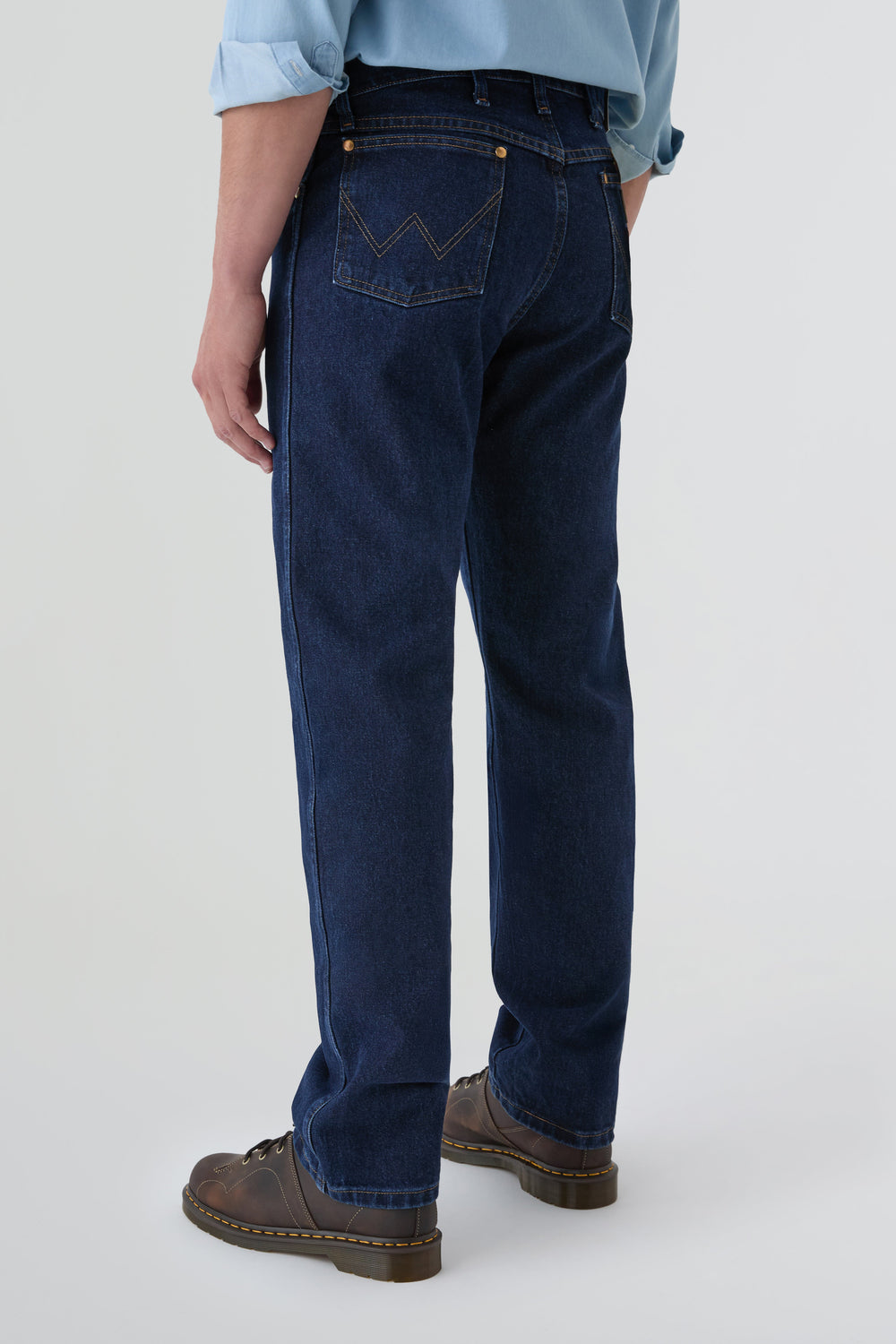 Jeans Wrangler confecionadas num resistente tecido denim de 13 onças (368 g) de 100% algodão sem elasticidade. Concebidas com cintura, coxa e joelho de corte regular e uma ligeira abertura para se ajustarem bem por cima do calçado. Pormenor de cinco bolsos, costura em forma de "W" e sete presilhas.