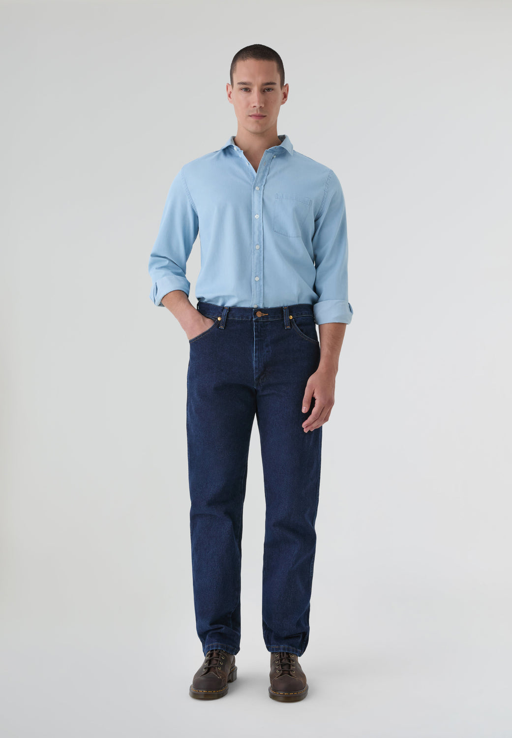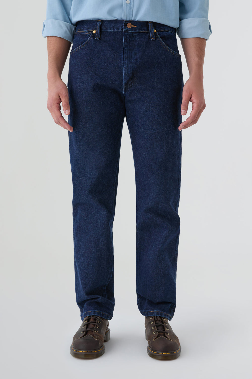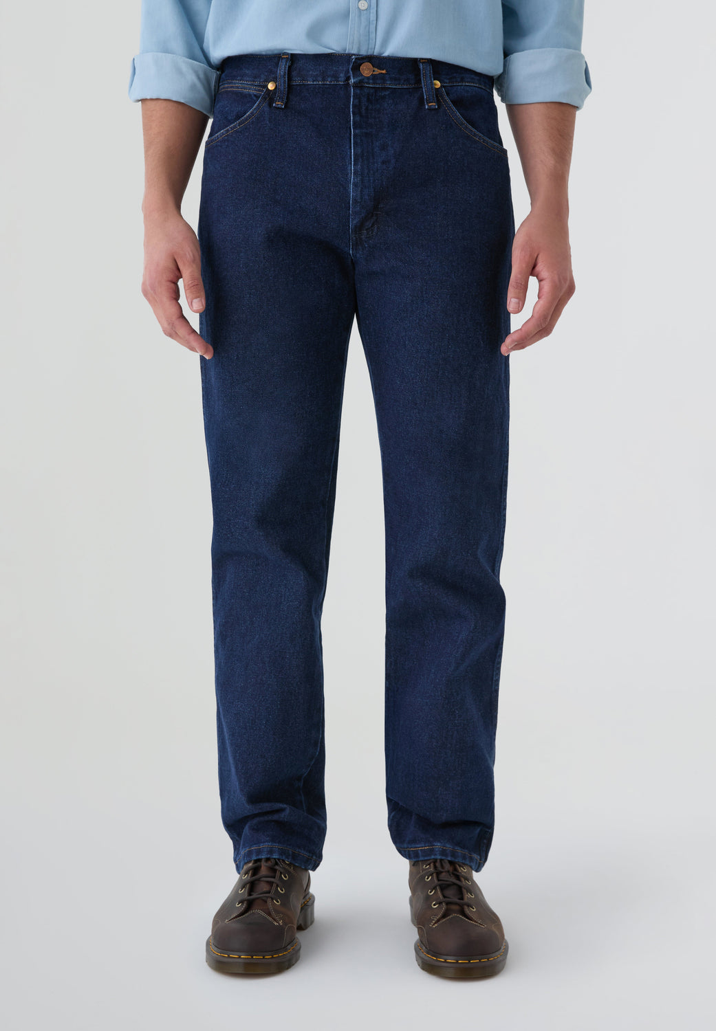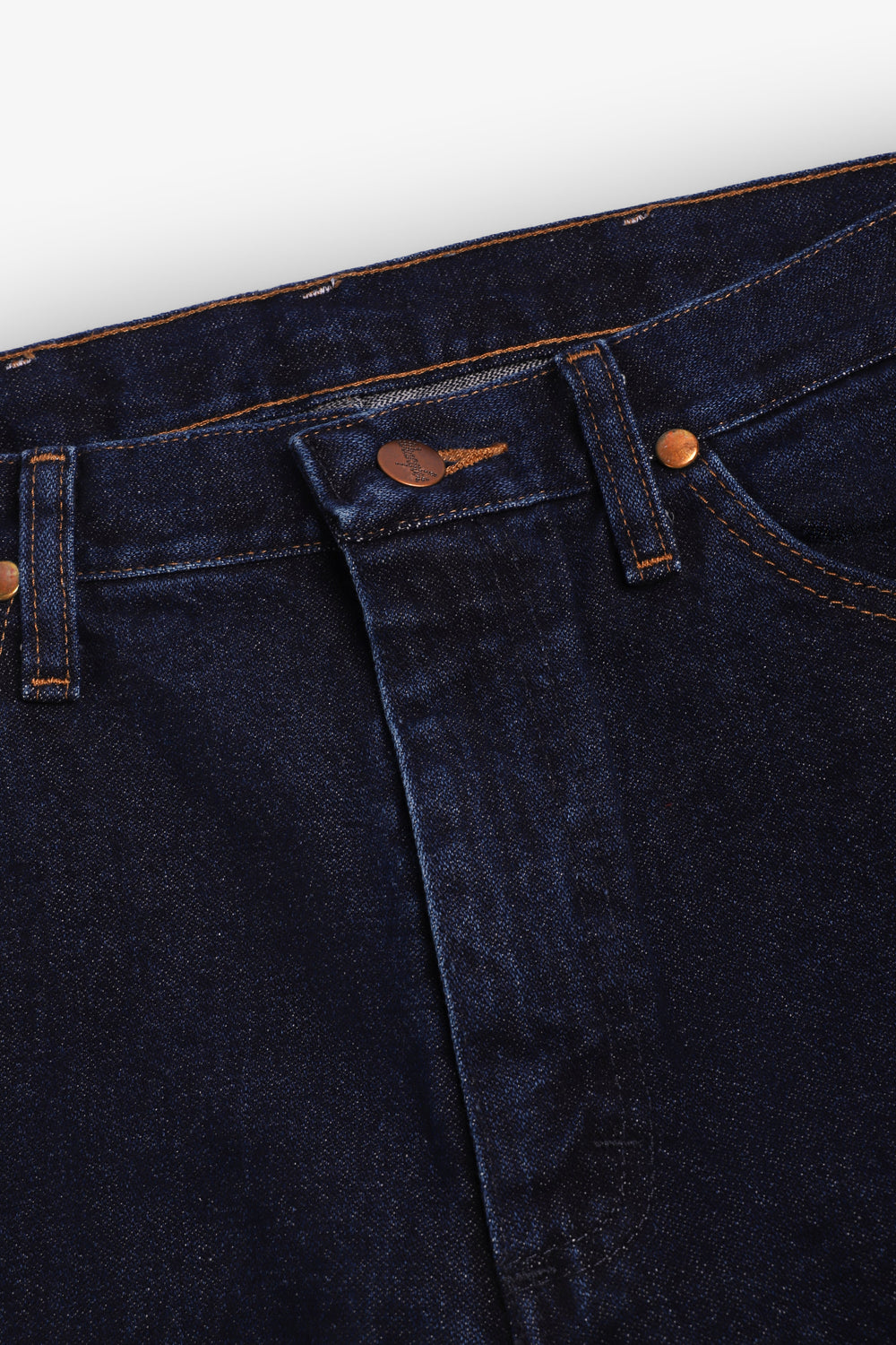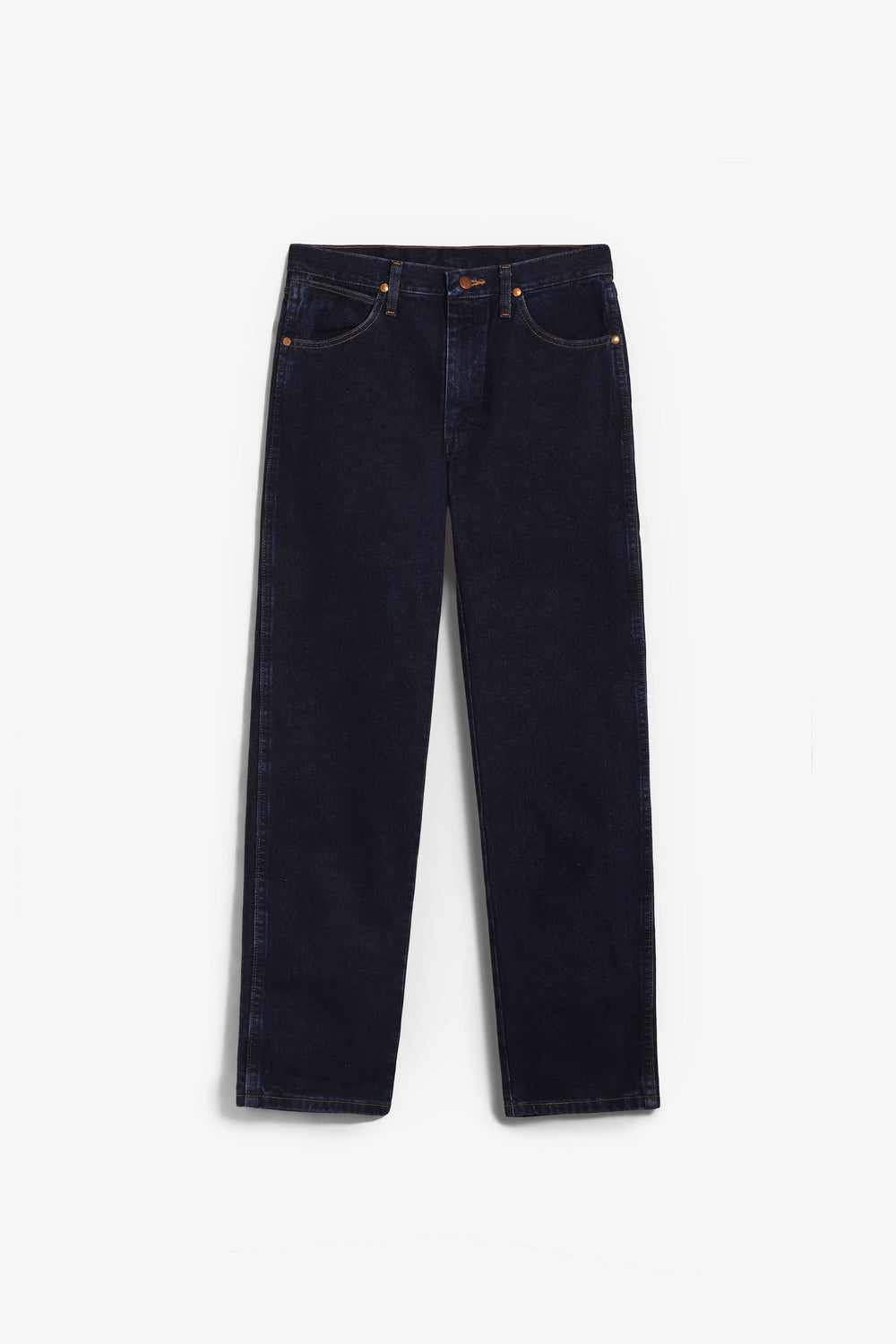 Jeans Wrangler confecionadas num resistente tecido denim de 13 onças (368 g) de 100% algodão sem elasticidade. Concebidas com cintura, coxa e joelho de corte regular e uma ligeira abertura para se ajustarem bem por cima do calçado. Pormenor de cinco bolsos, costura em forma de "W" e sete presilhas.