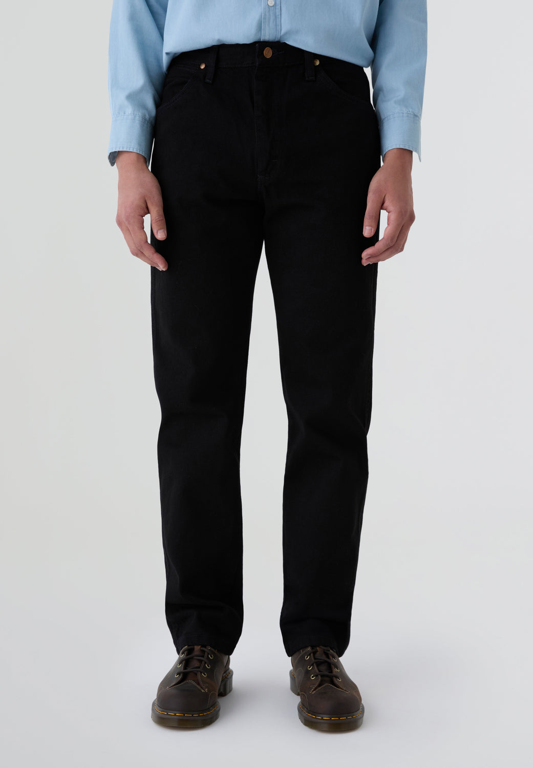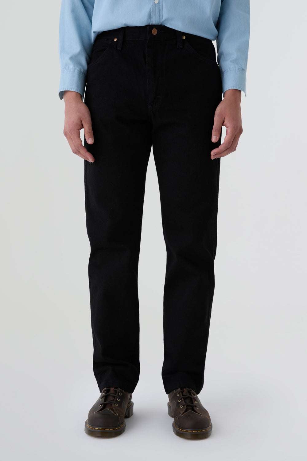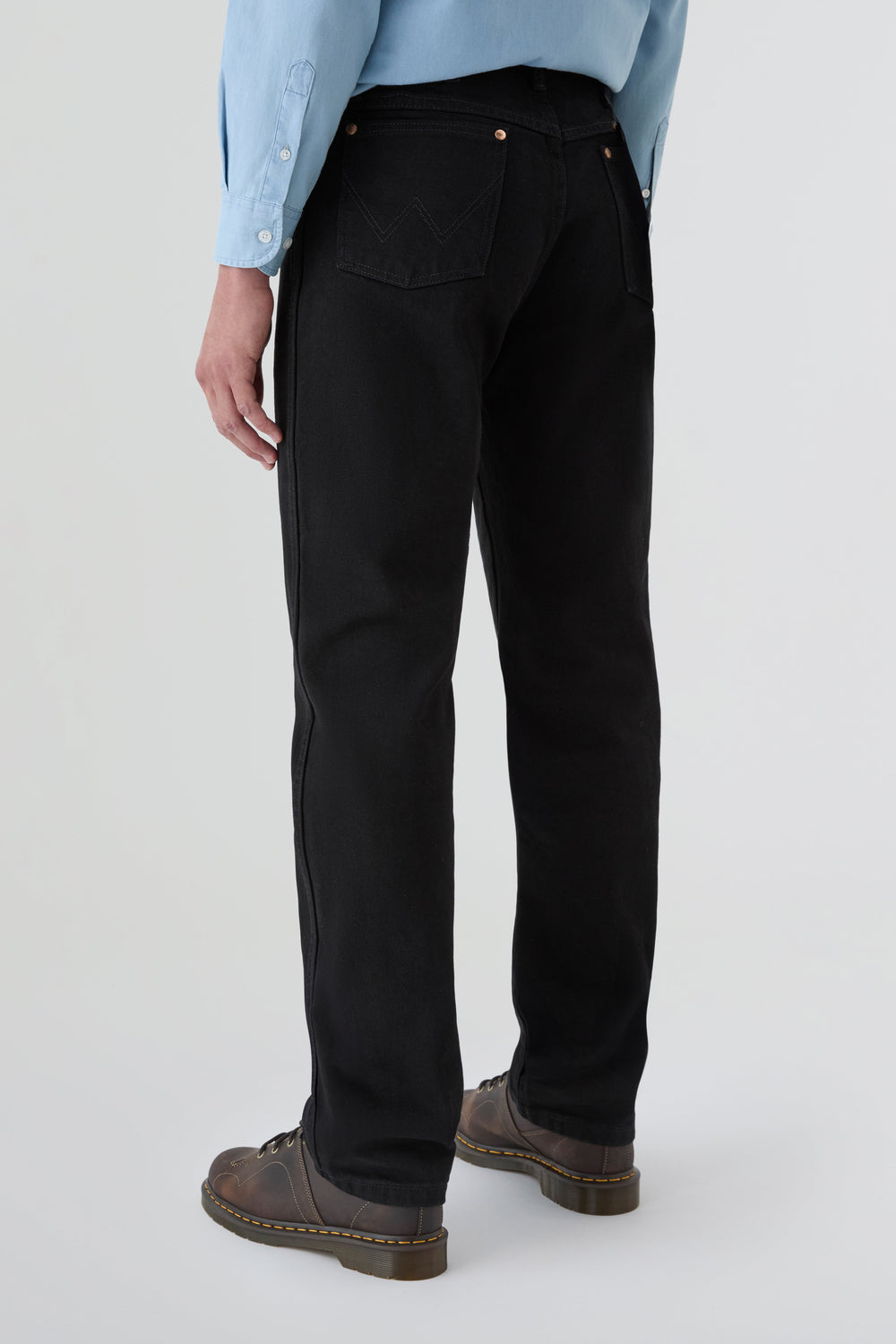 Jeans Wrangler confecionadas num resistente tecido denim de 13 onças (368 g) de 100% algodão sem elasticidade. Concebidas com cintura, coxa e joelho de corte regular e uma ligeira abertura para se ajustarem bem por cima do calçado. Pormenor de cinco bolsos, costura em forma de "W" e sete presilhas.
