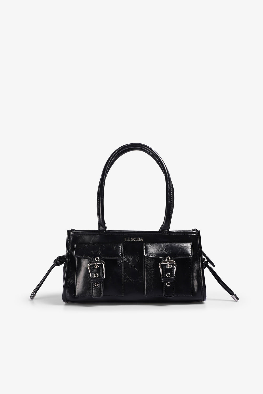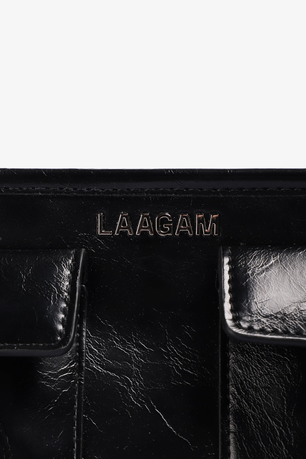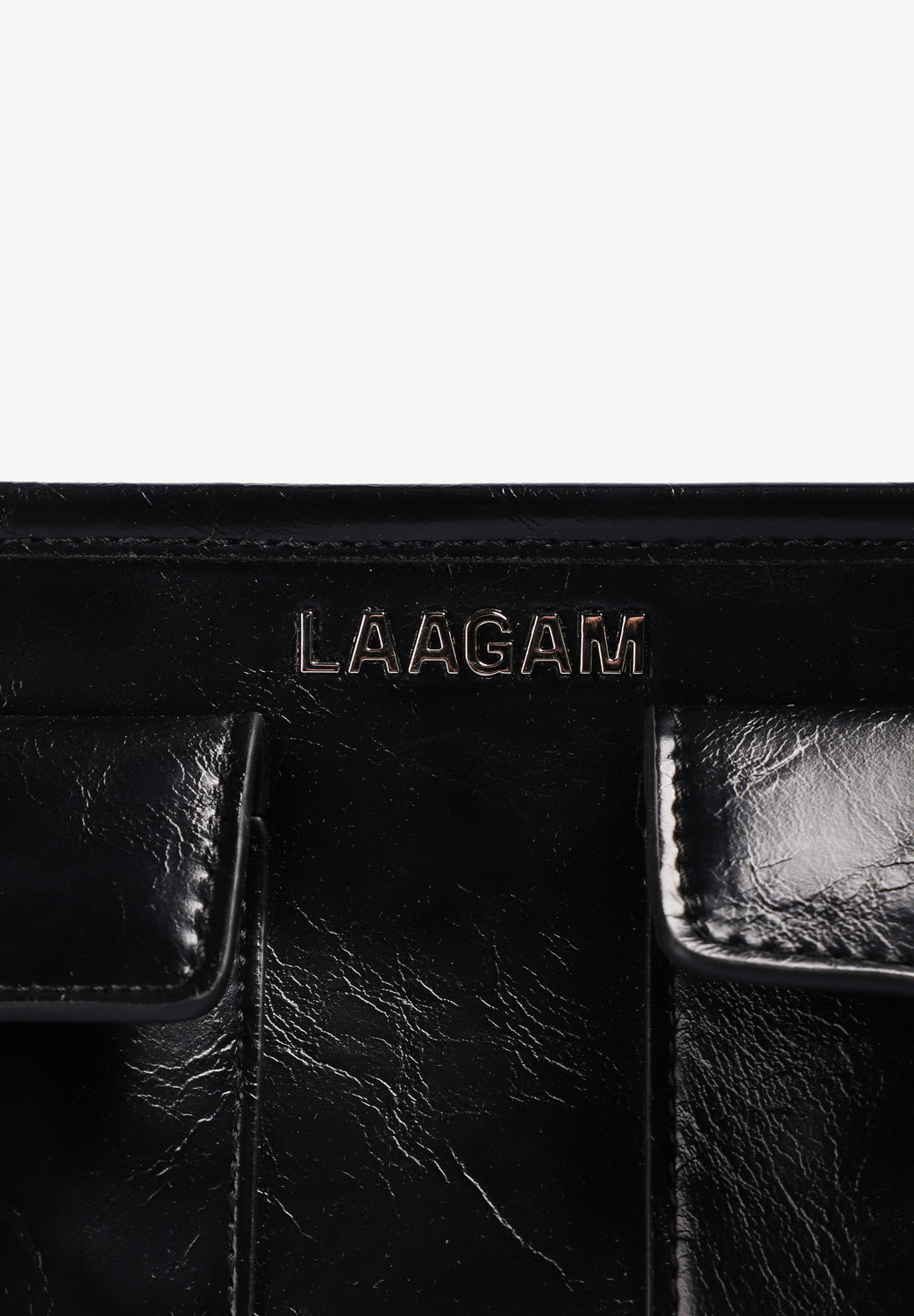 Bolsa Laagam confecionada em 100% poliuretano e forro 100% algodão. Com um efeito de pele de cor preta, vários bolsos e pormenor do logótipo e fivelas de metal na parte frontal. Alças de ombro, fecho de correr metálico e bolso interior.