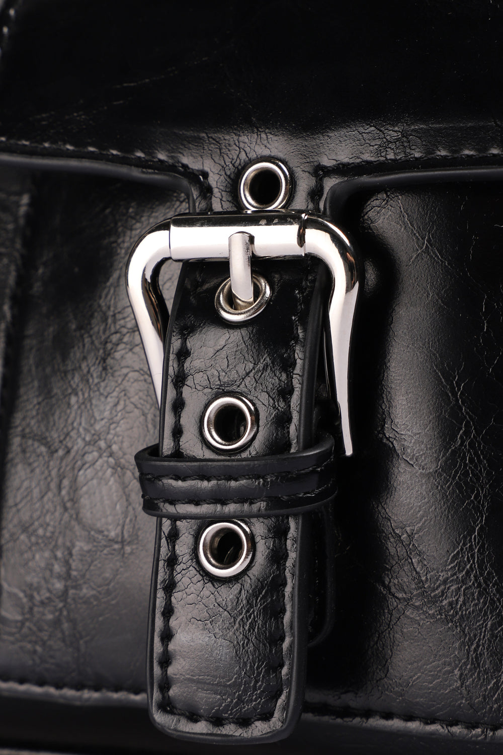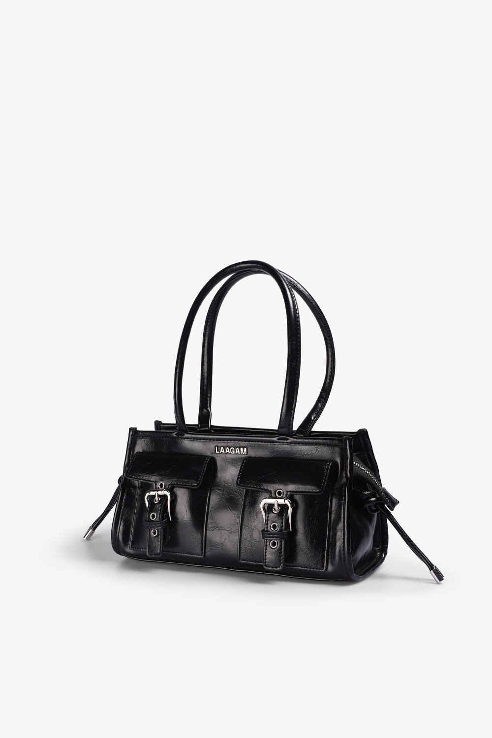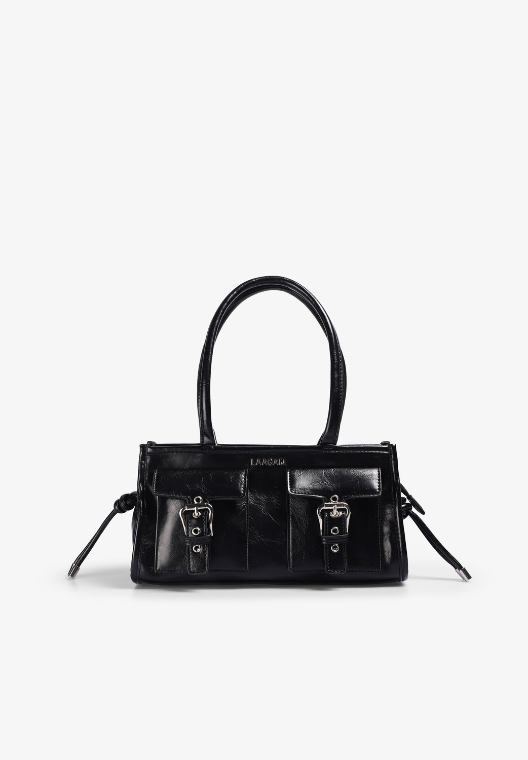 Bolsa Laagam confecionada em 100% poliuretano e forro 100% algodão. Com um efeito de pele de cor preta, vários bolsos e pormenor do logótipo e fivelas de metal na parte frontal. Alças de ombro, fecho de correr metálico e bolso interior.