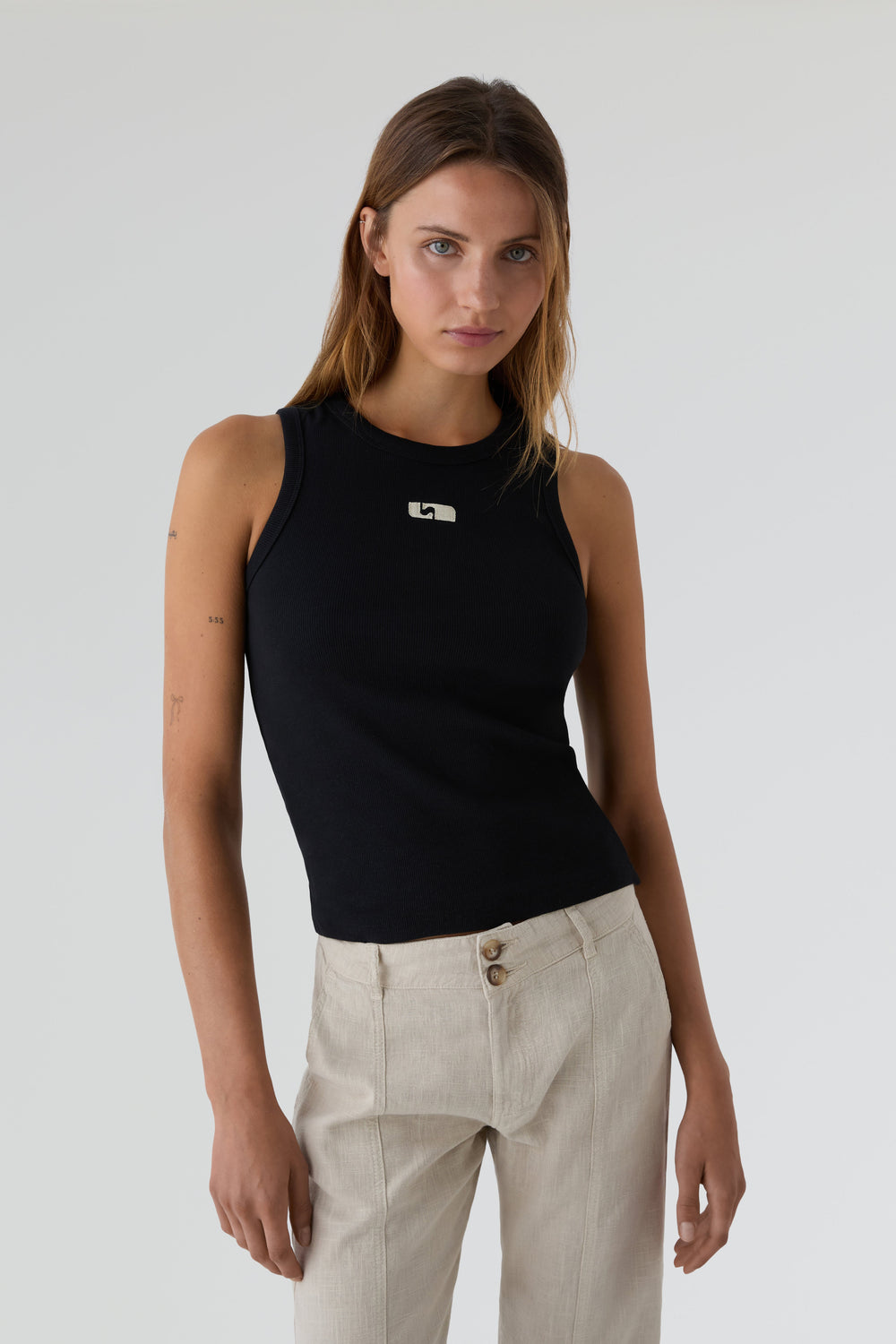 Top Laagam confecionado em tecido 100% algodão leve canelado. Design justo, sem mangas, com decote redondo e logótipo bordado à frente.