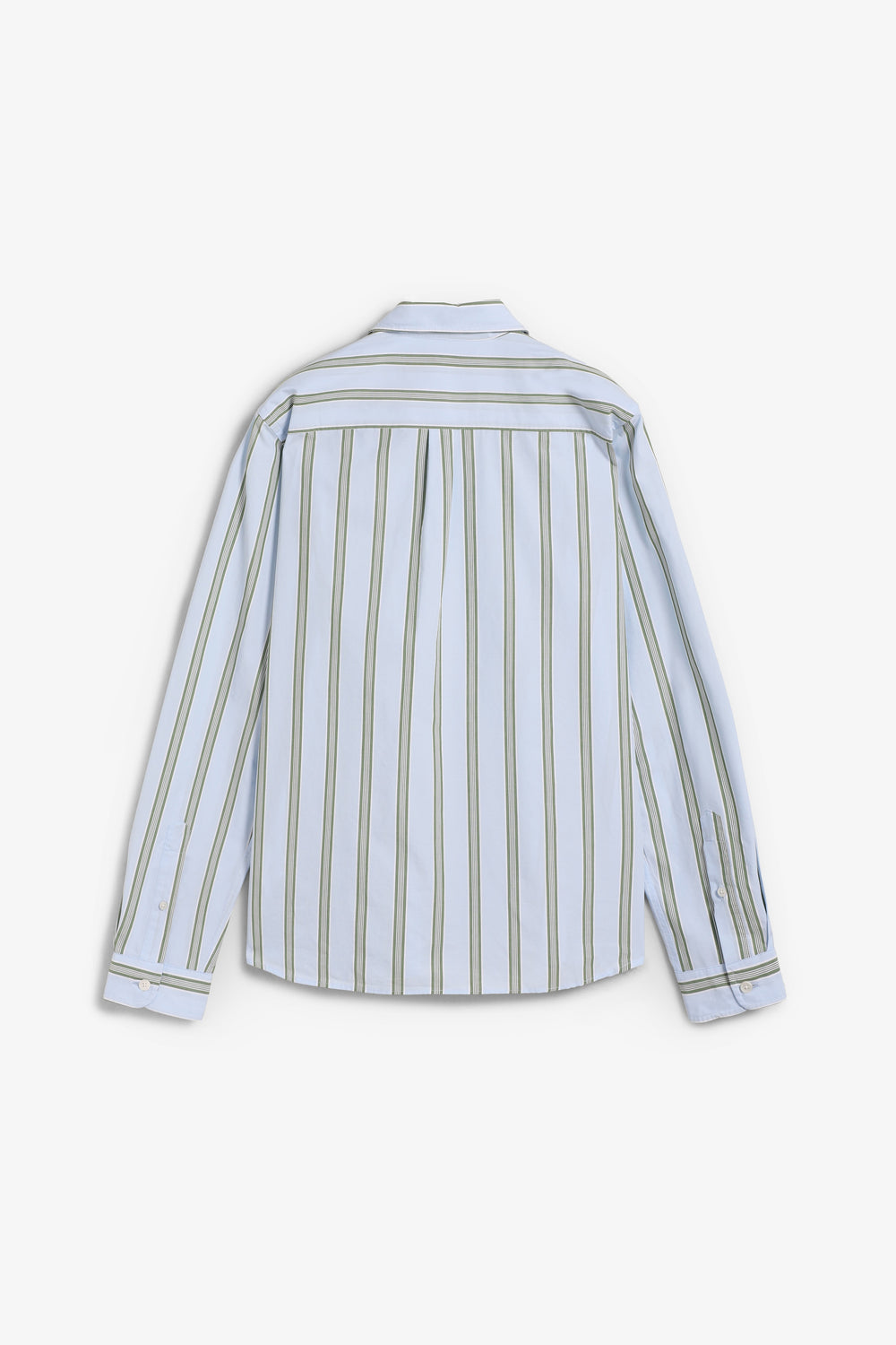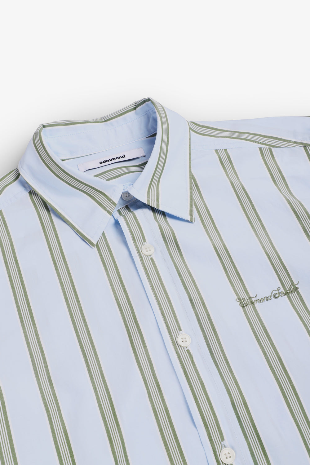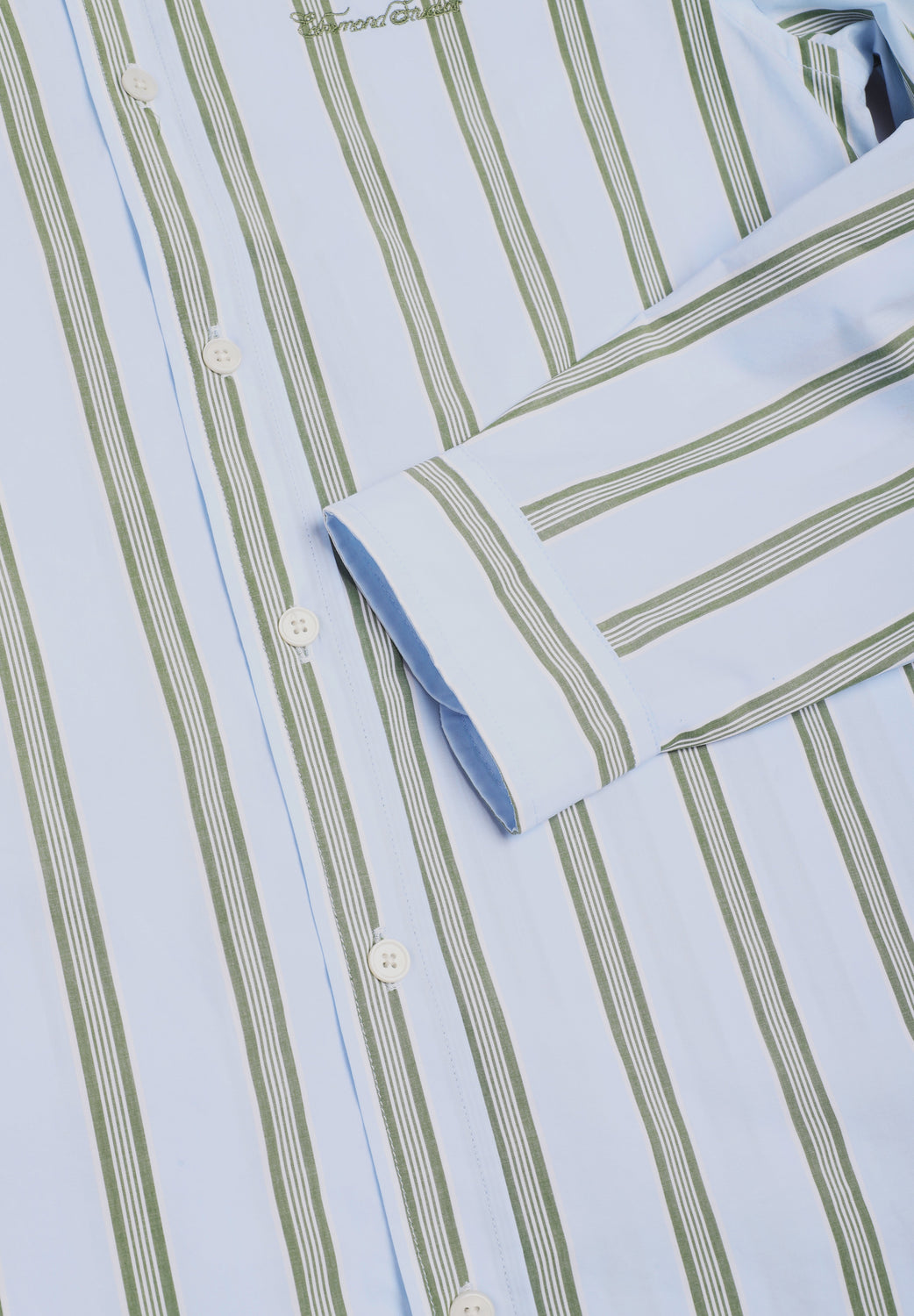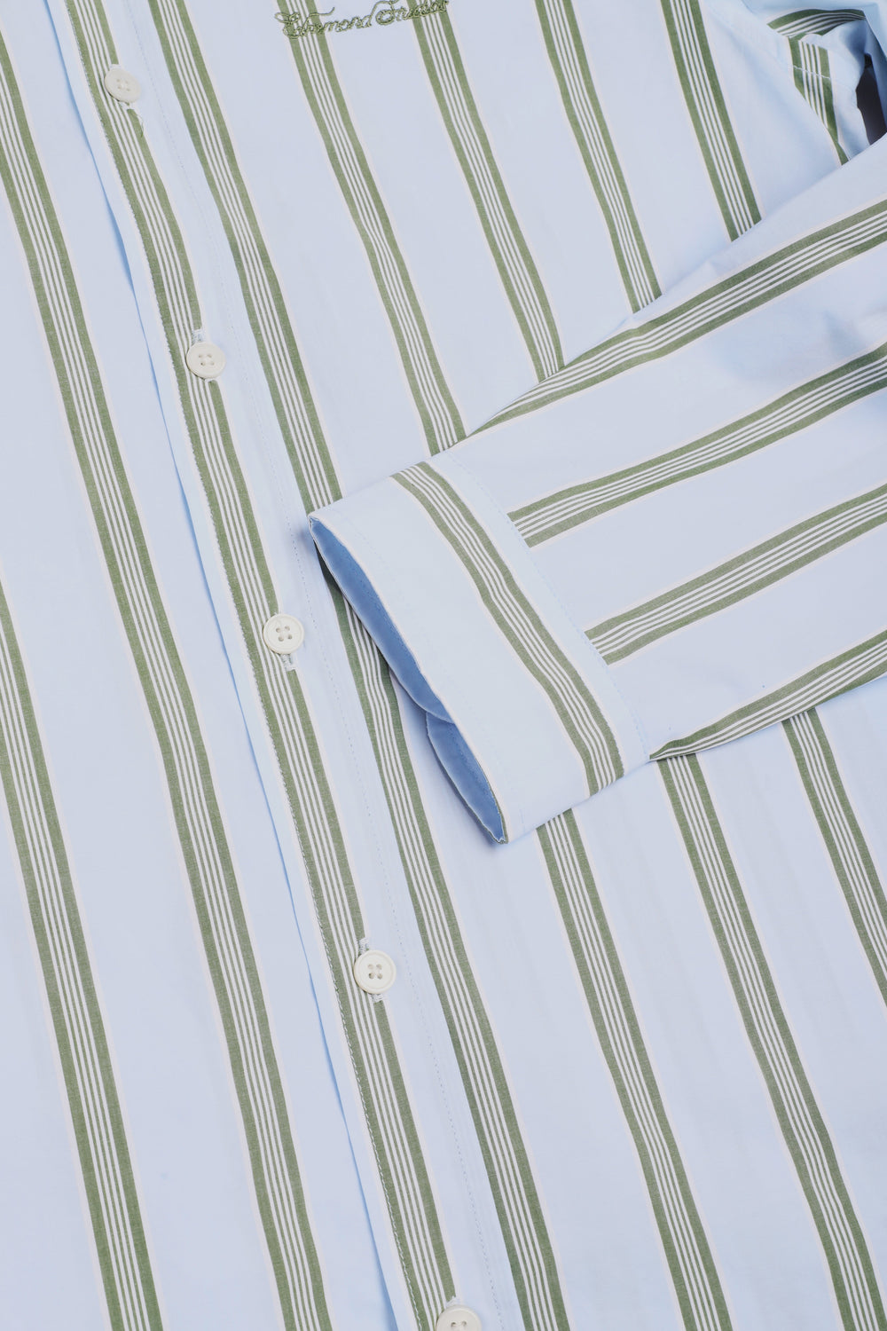 Camisa Edmmond Studios confecionada em 100% algodão. Concebida em popeline de algodão com padrão às riscas azul-claro e verde, conta com uma gola button down, manga comprida com punhos abotoados, bolso no peito, fecho com botões à frente e logótipo da marca bordado no peito.
