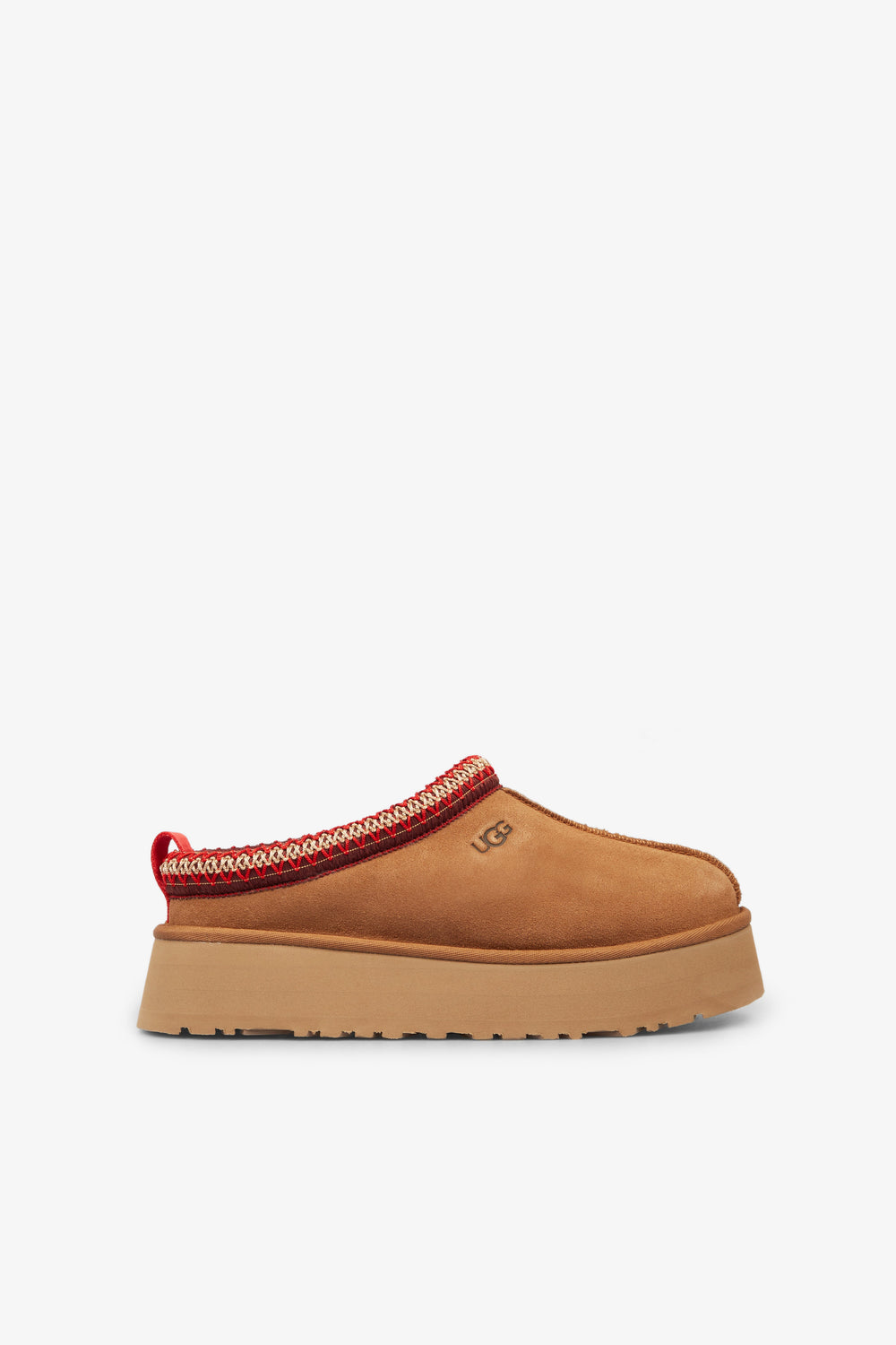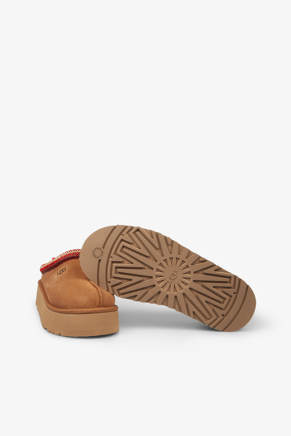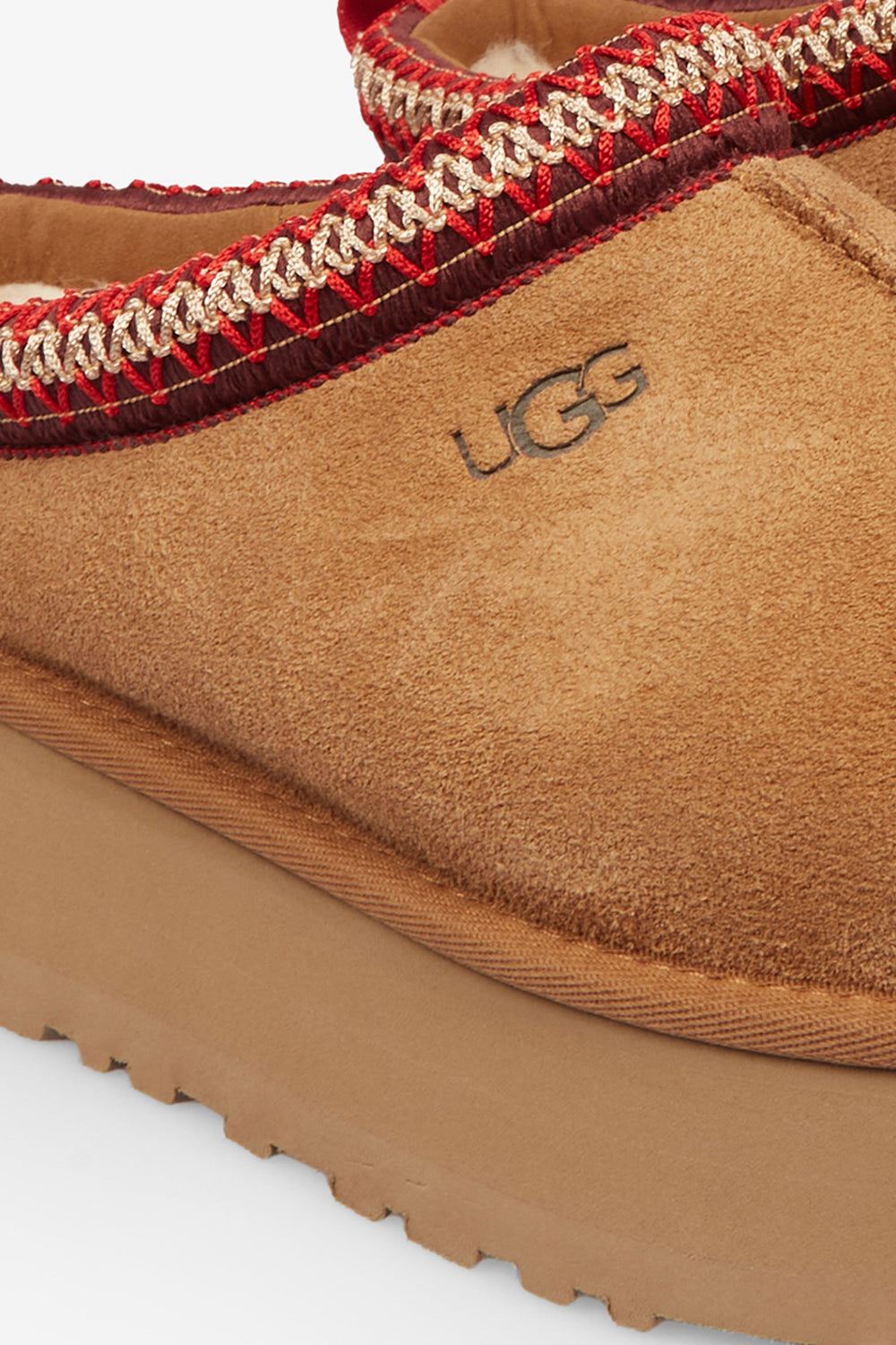 Pantufa UGG confecionada em camurça macia forrada com tecido de pele de ovelha e a sola de EVA de cana-de-açúcar com forma balançada para facilitar os movimentos. Pormenor trançado UGGbraid feito com fibras de poliéster 100% recycled e presilha na parte de trás. Logótipo termogravado e etiqueta cosida na palmilha.