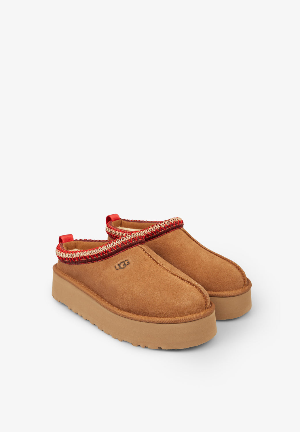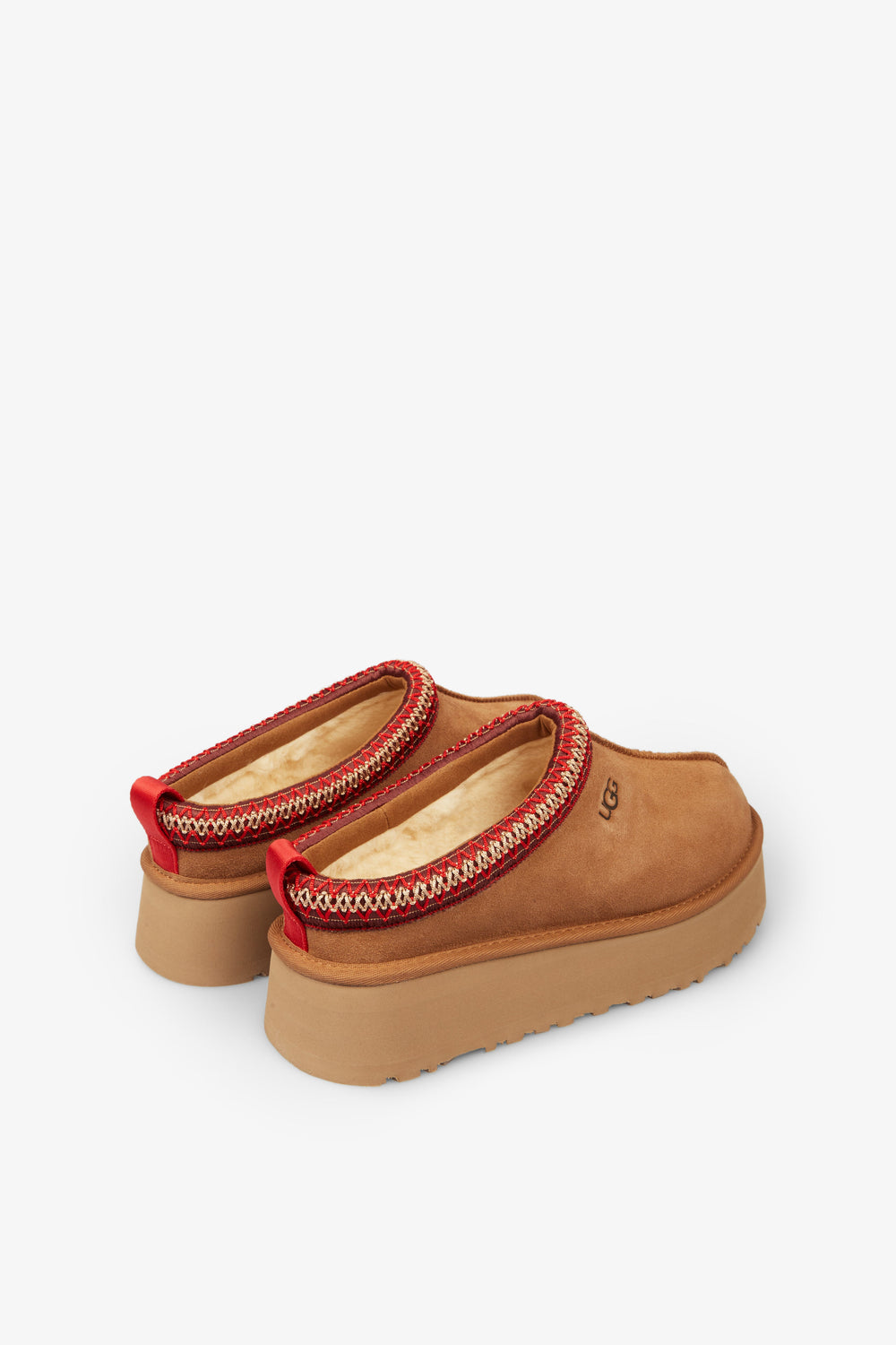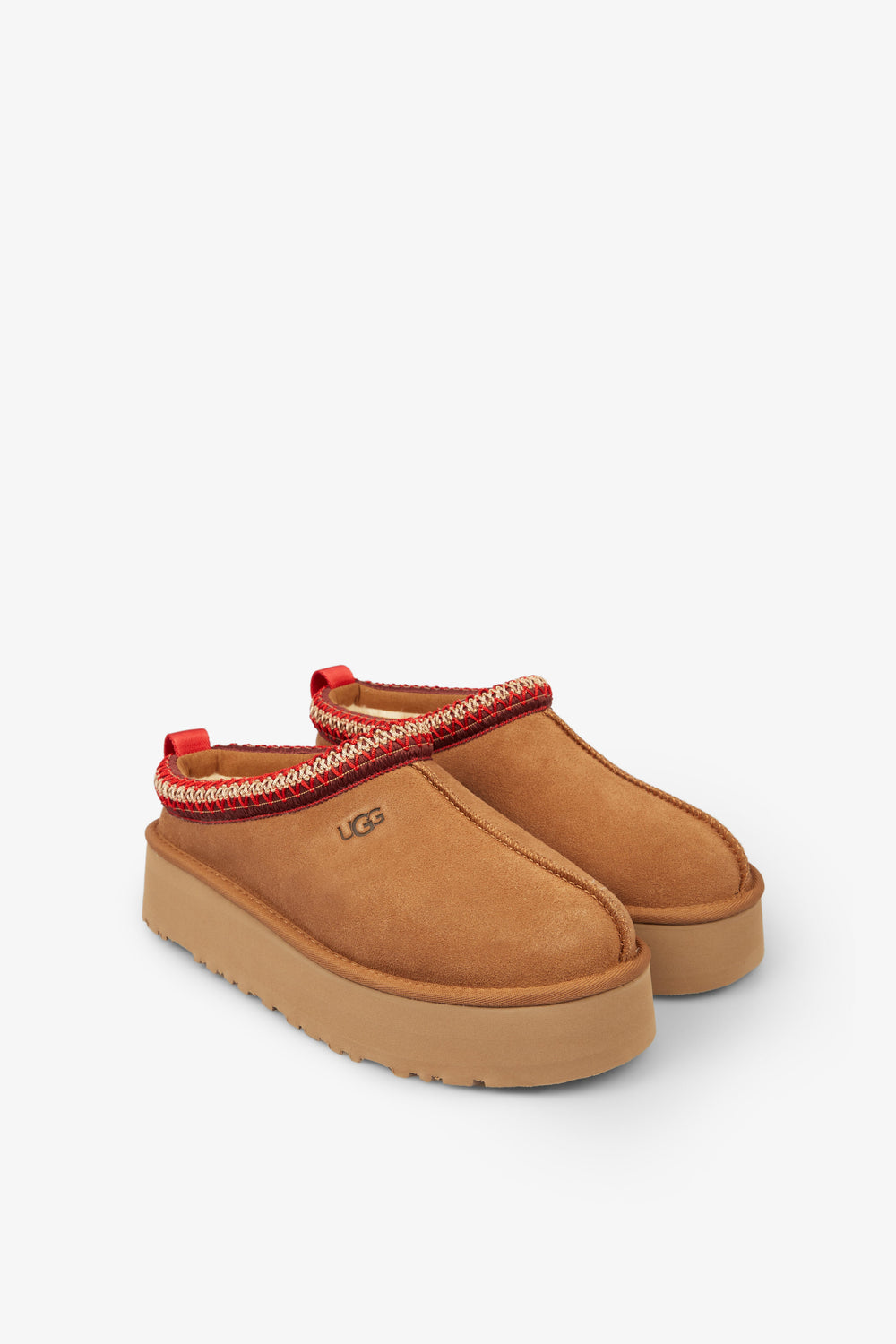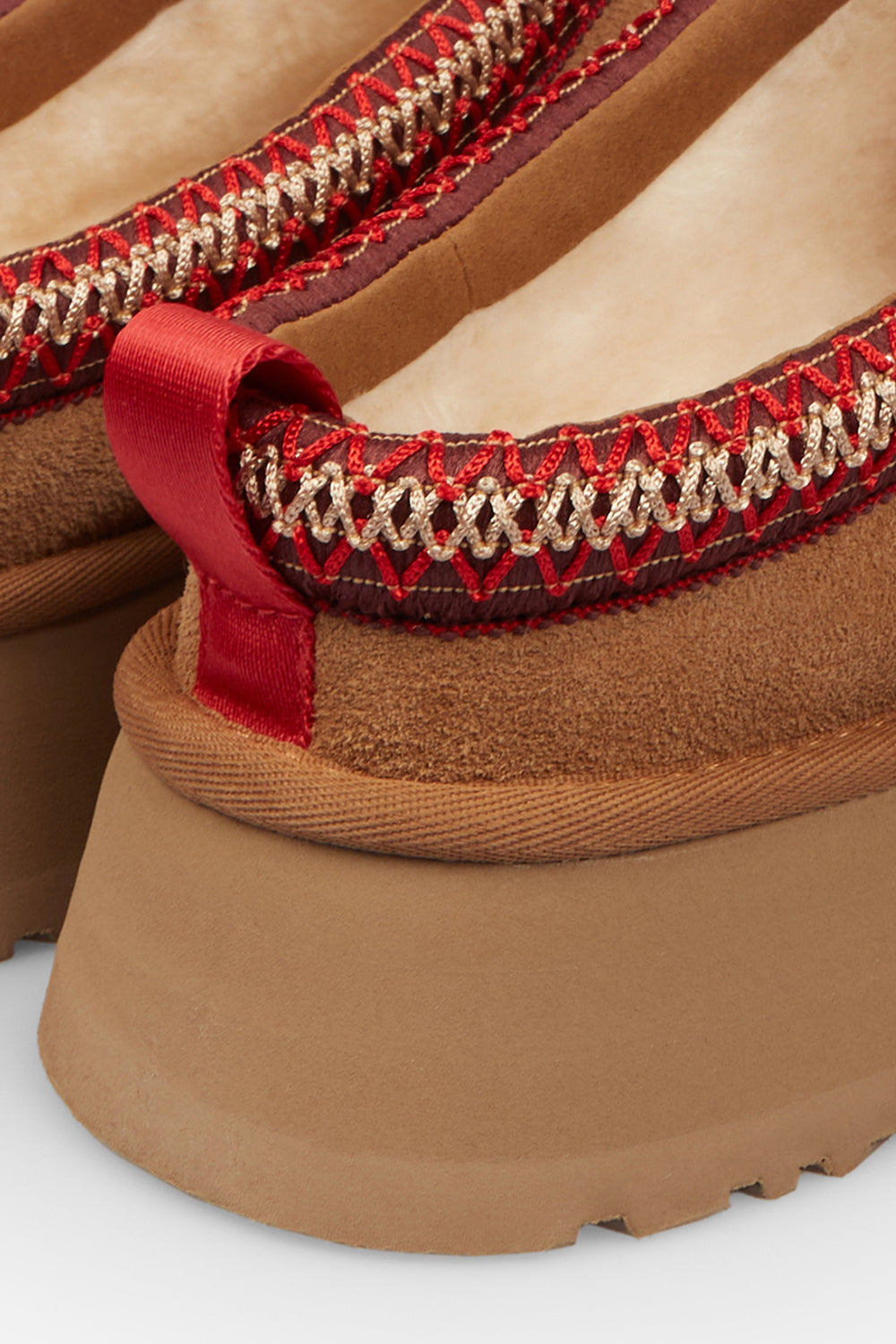 Pantufa UGG confecionada em camurça macia forrada com tecido de pele de ovelha e a sola de EVA de cana-de-açúcar com forma balançada para facilitar os movimentos. Pormenor trançado UGGbraid feito com fibras de poliéster 100% recycled e presilha na parte de trás. Logótipo termogravado e etiqueta cosida na palmilha.