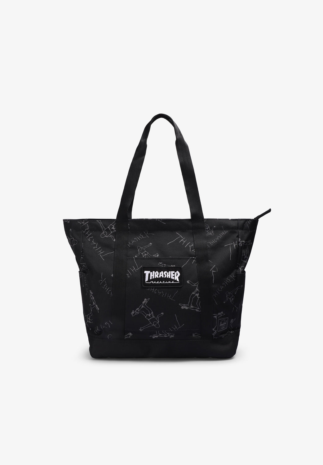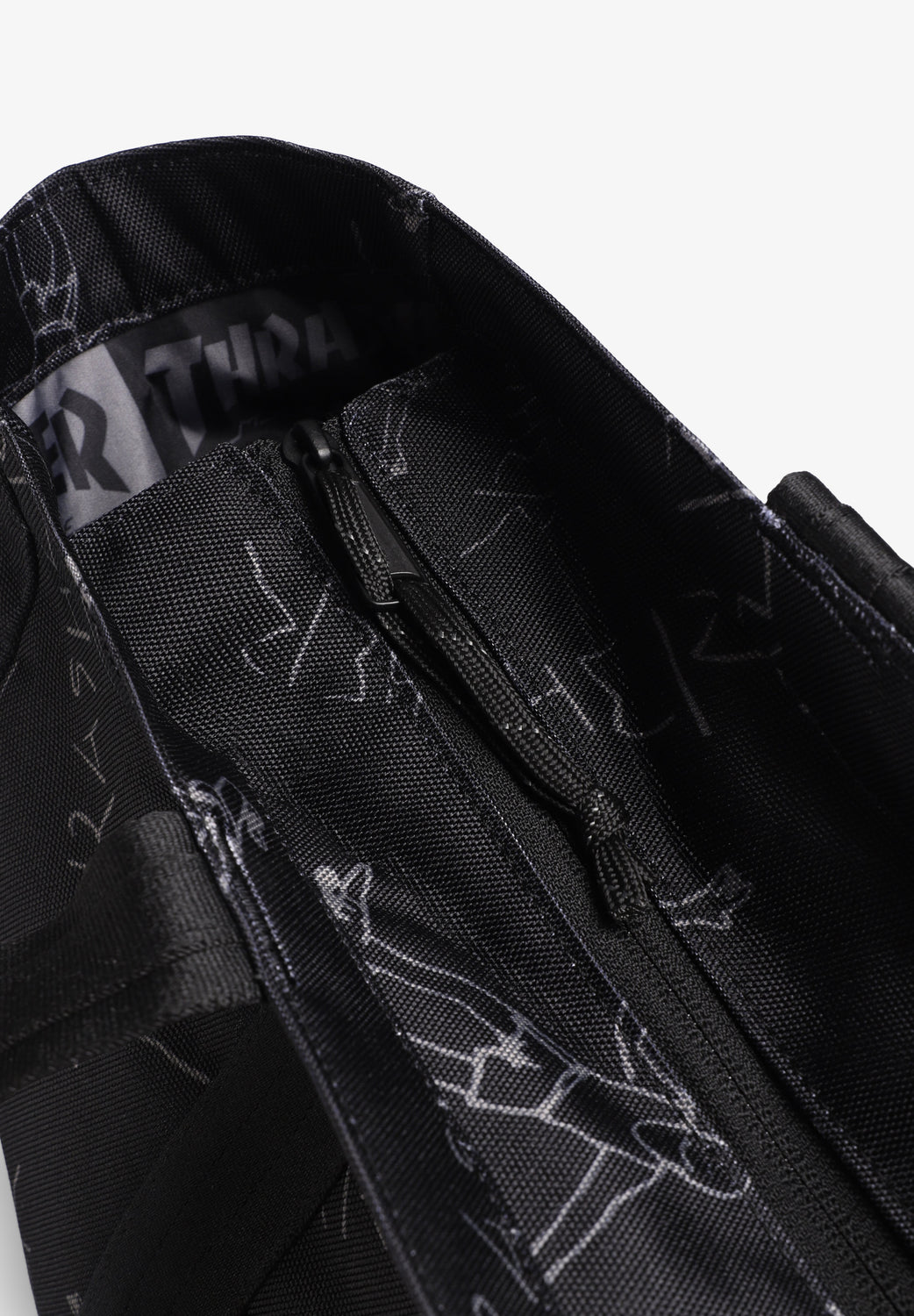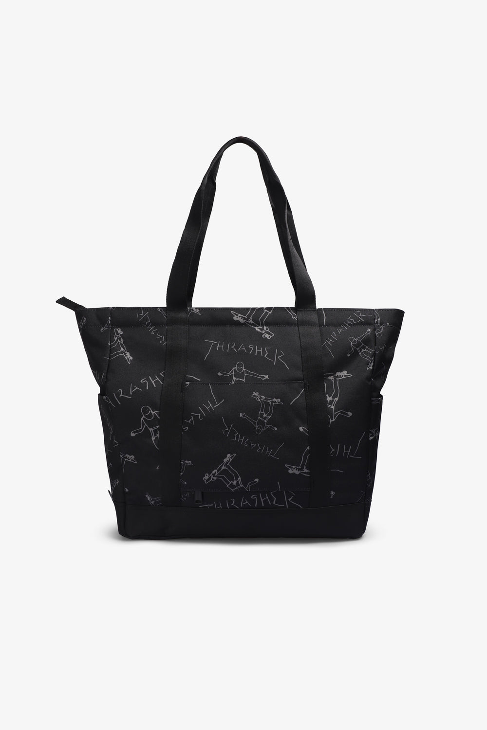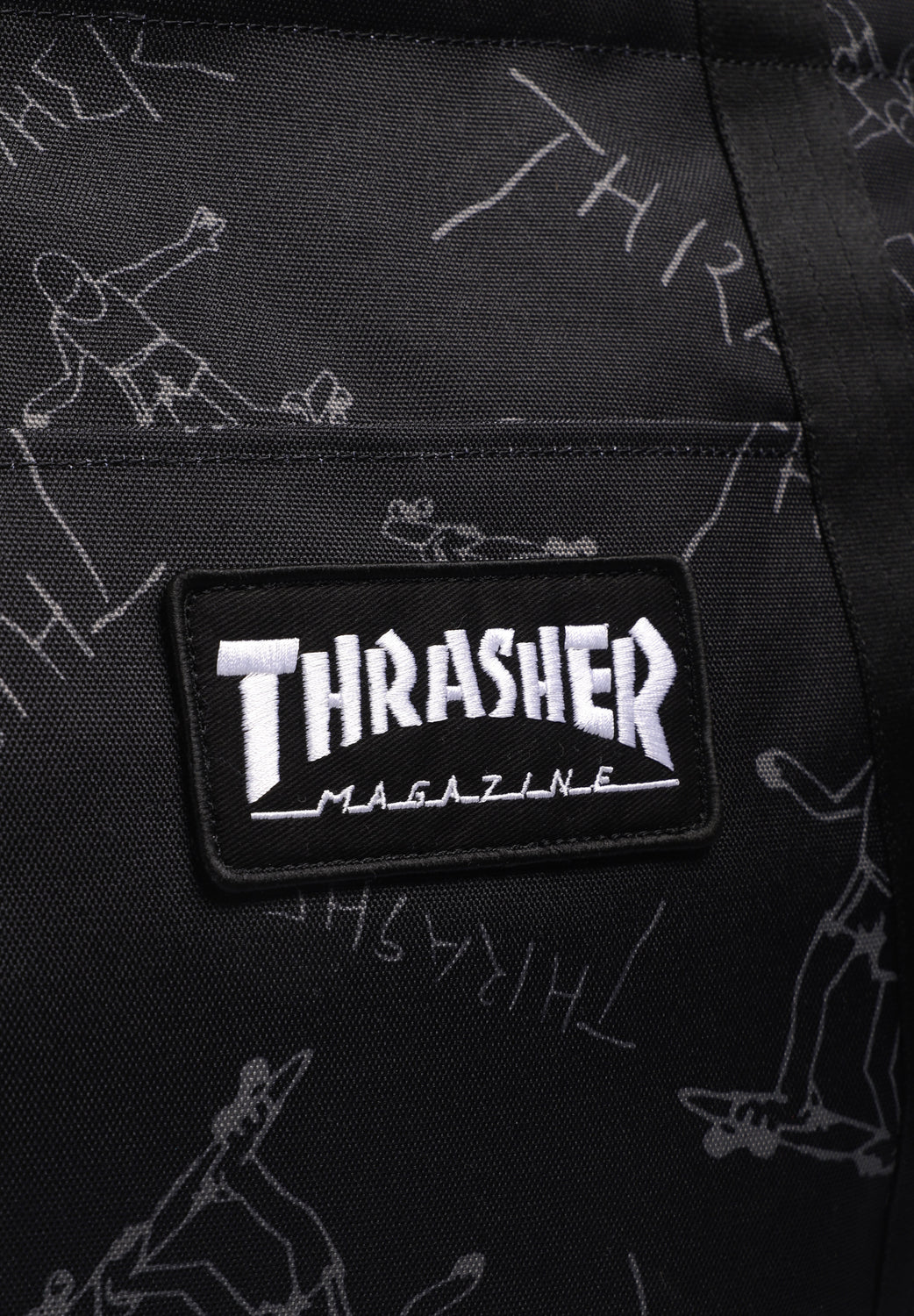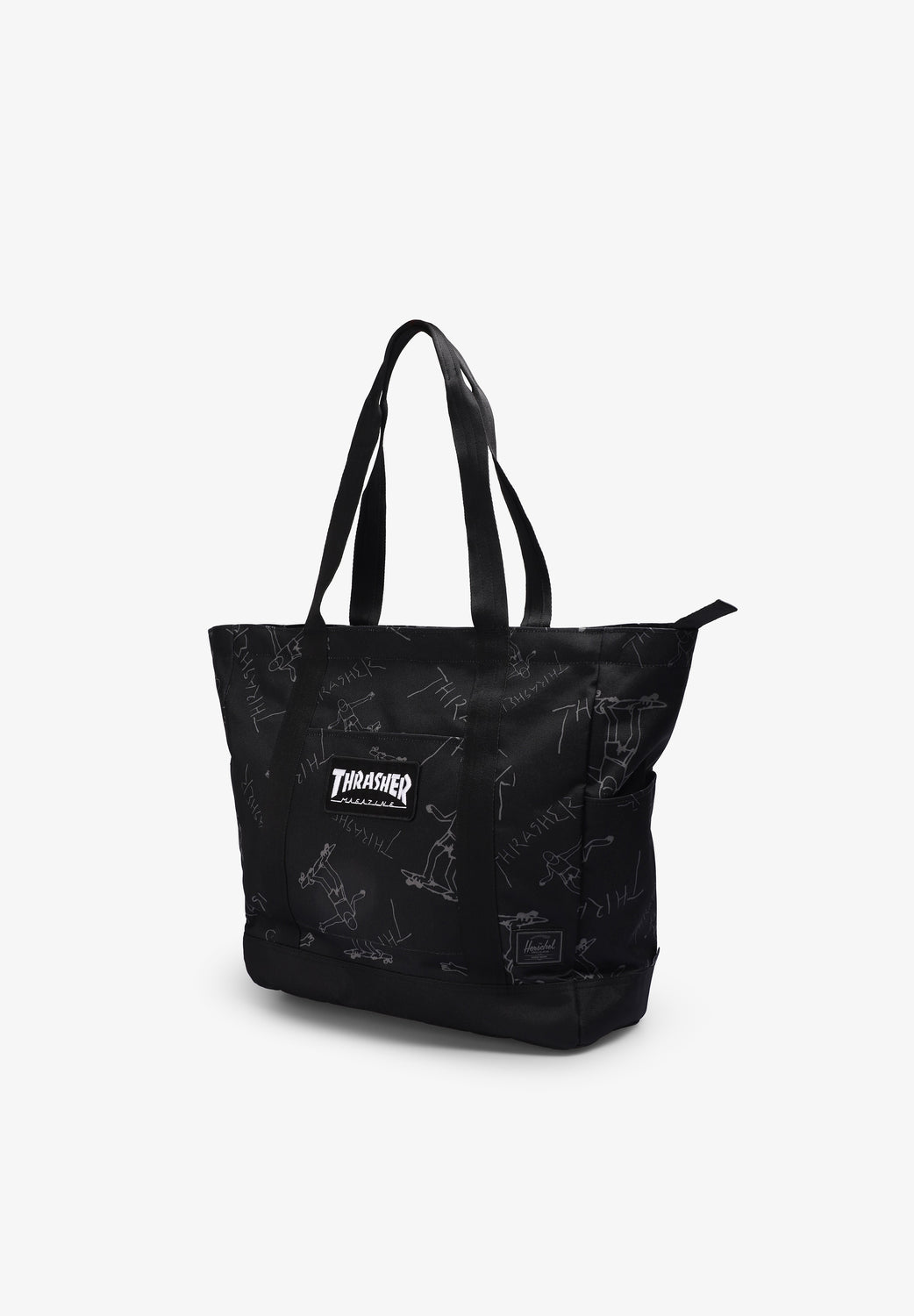 Bolsa estilo tote Herschel fabricada em 100% poliéster 600D recycled. Com um forro com padrão Thrasher, capa flutuante acolchoada e forrada a tecido polar que se adapta a um computador portátil de 15"/16", fecho de correr com puxadores de cordões, correia interna de velcro, alças de transporte macias, bolso frontal, dois bolsos para garrafas de água, clipe para chaves e logótipo bordado Thrasher.