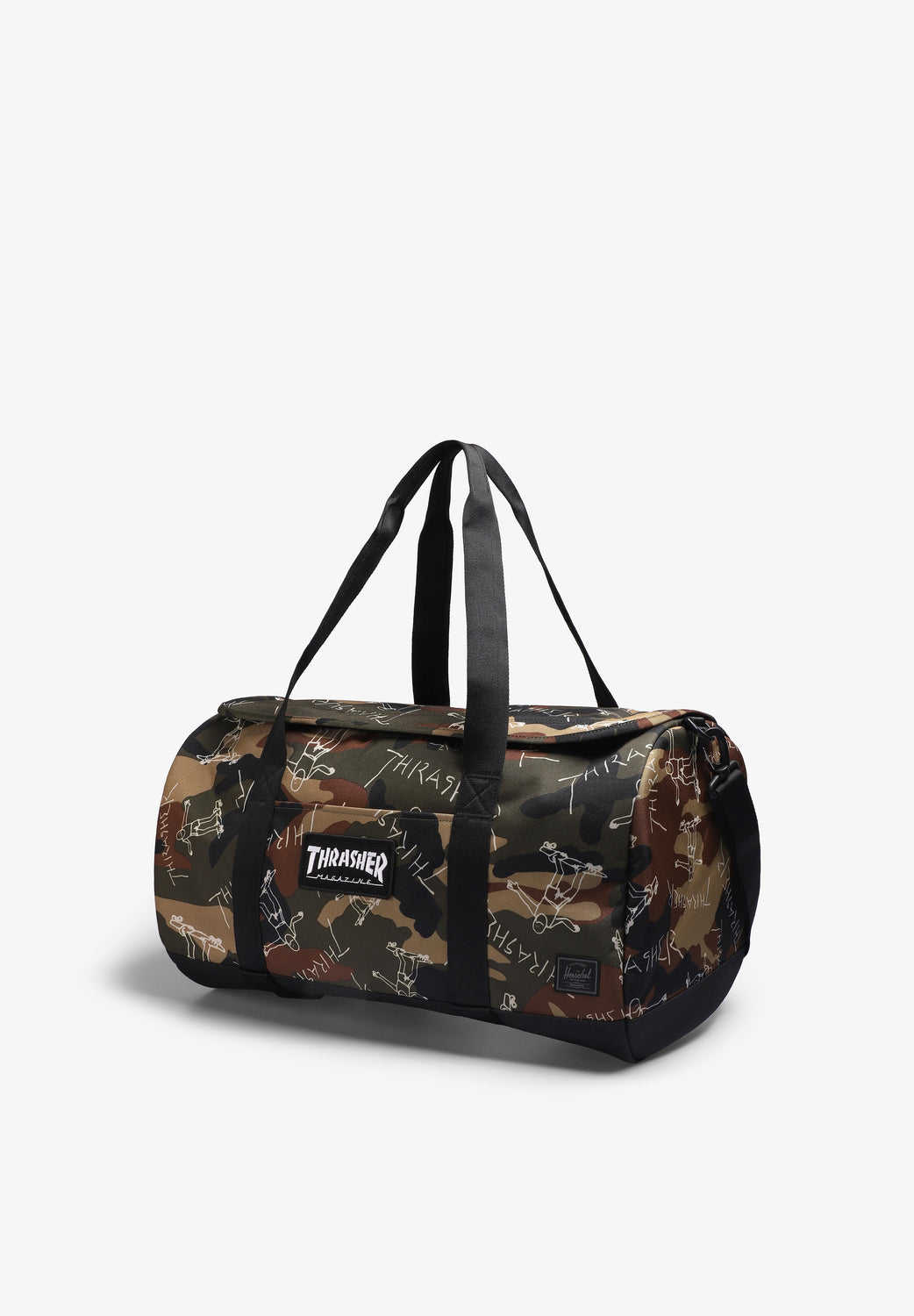 Bolsa de viagem Herschel confecionada em 100% poliéster 600D recycled. Com um forro com padrão Thrasher, abertura em forma de U com fecho de correr e puxadores de cordão, correias de patins com fecho automático, alças de transporte superiores macias, correia de ombro amovível de cintura lisa, bolso interior de malha com fecho de correr, remendo com o logótipo da Thrasher e etiqueta tecida Skate and Destroy.