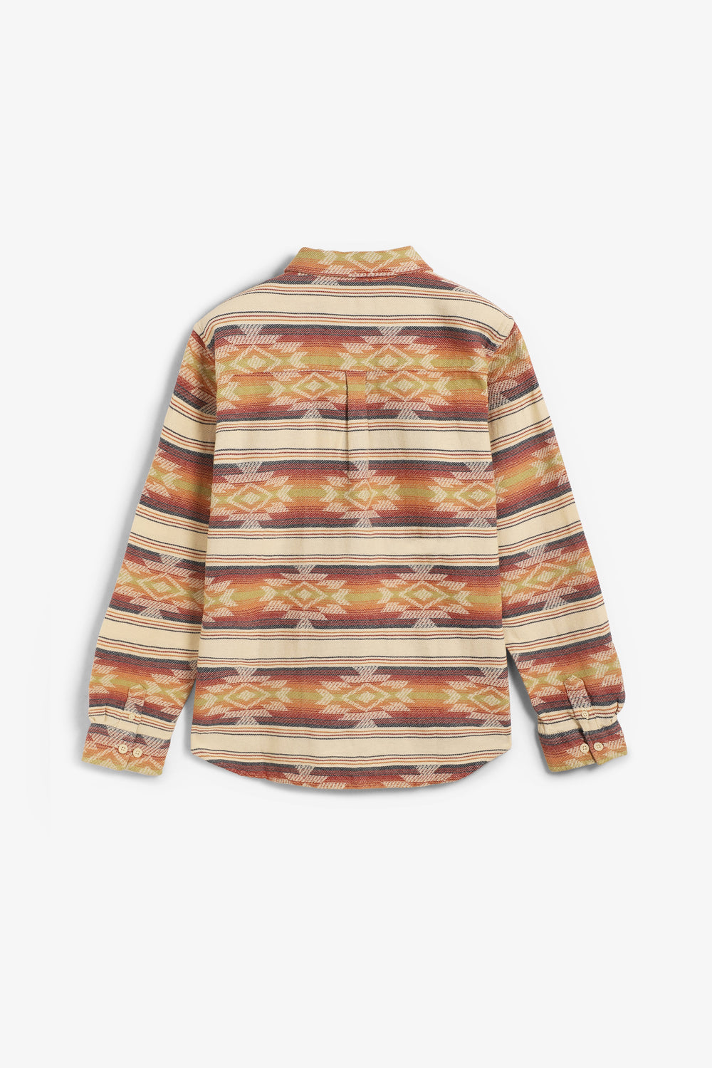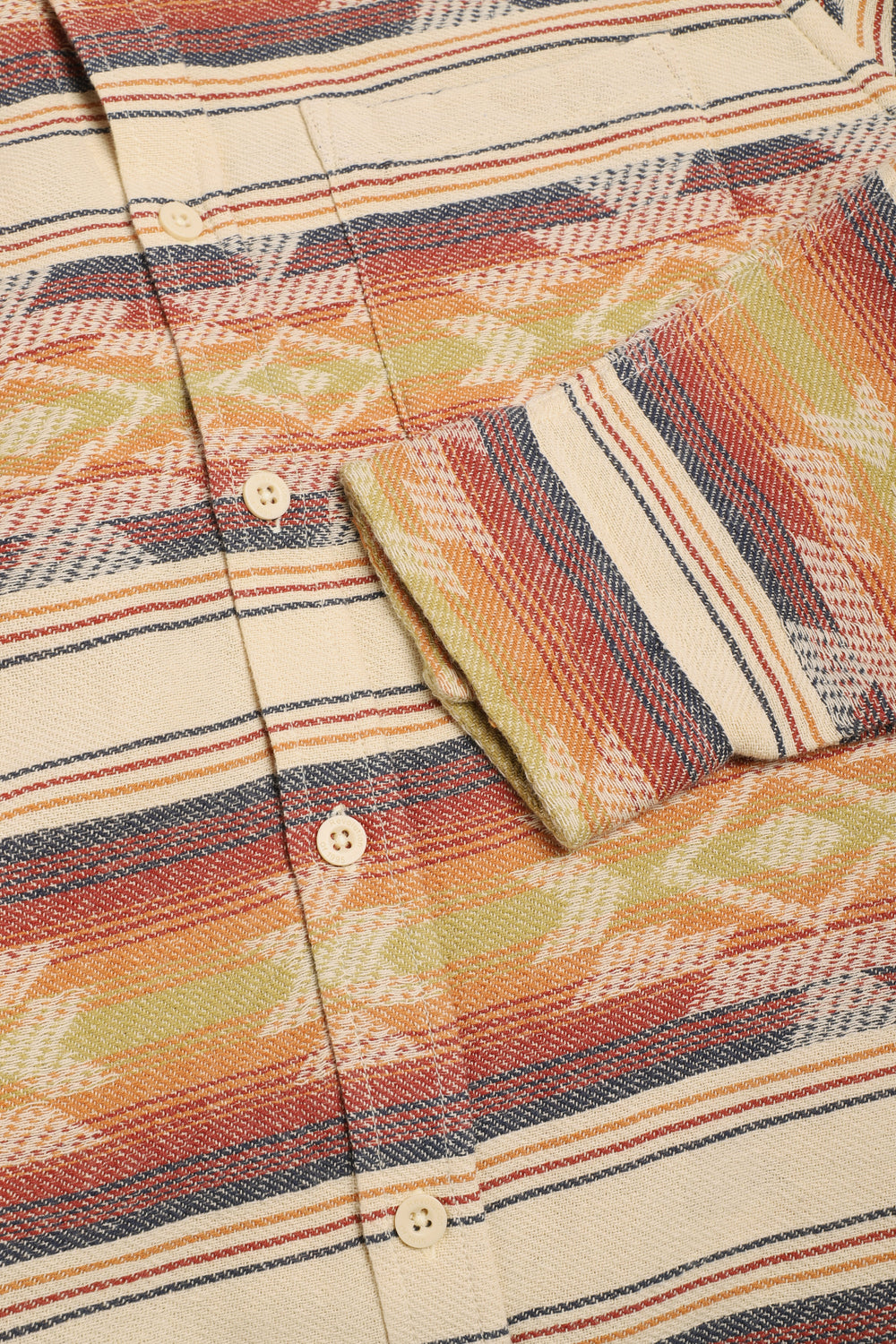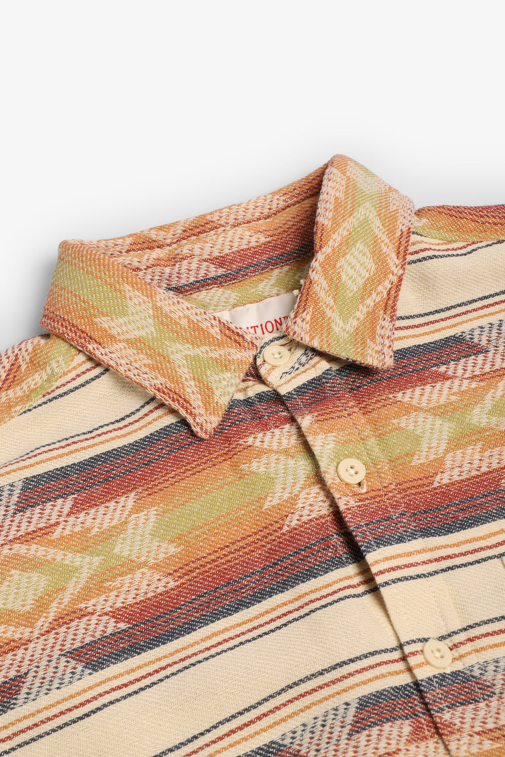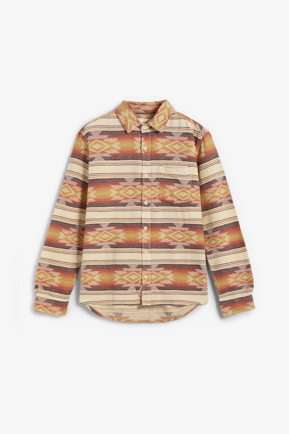 Camisa Revolution confecionada em 100% algodão orgânico. Com um bolso no peito de corte a direito e um fecho frontal com botões de quatro furos. Punhos ajustáveis, parte superior de dupla camada e pregas atrás com formas geométricas inspiradas nas antigas tradições aztecas e tecida com a técnica jacquard.