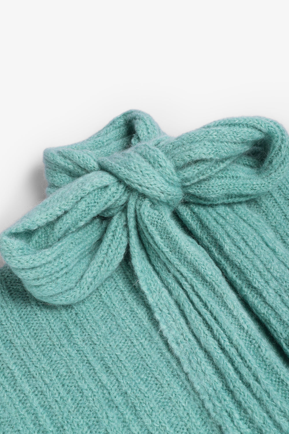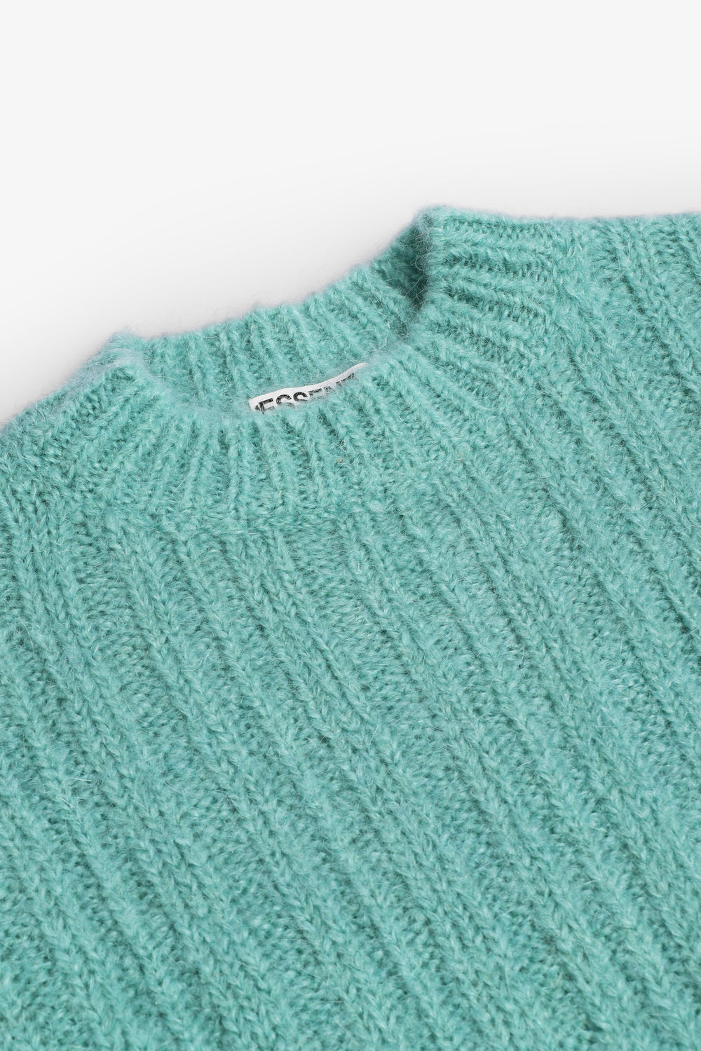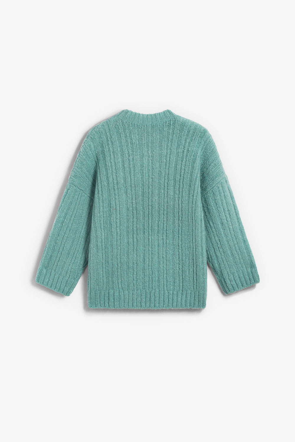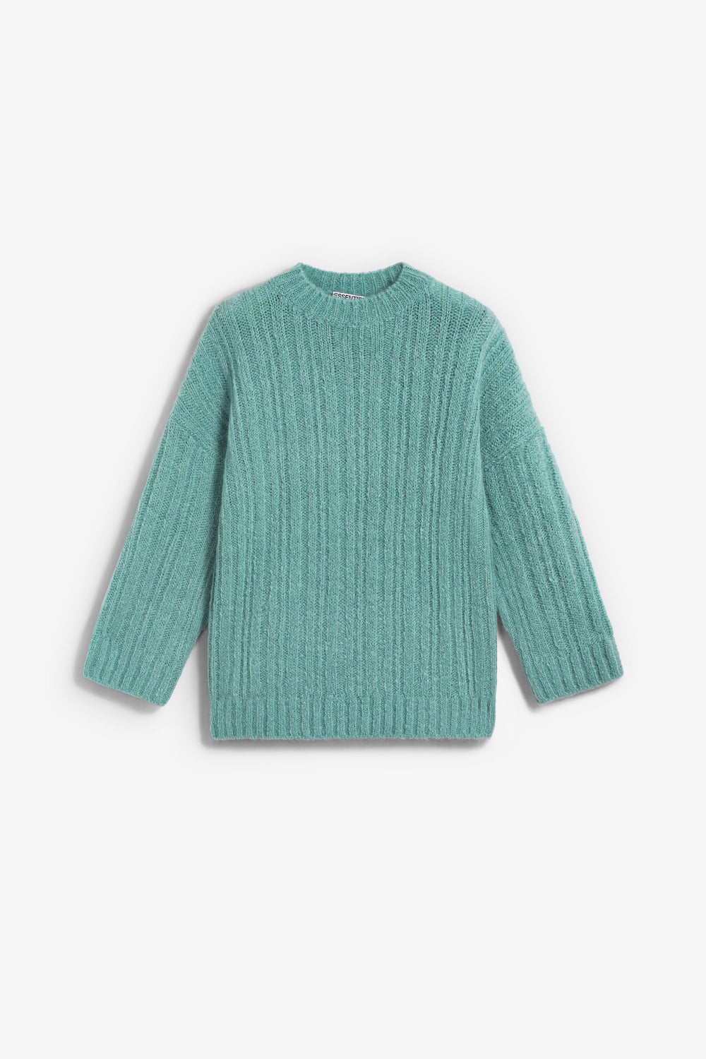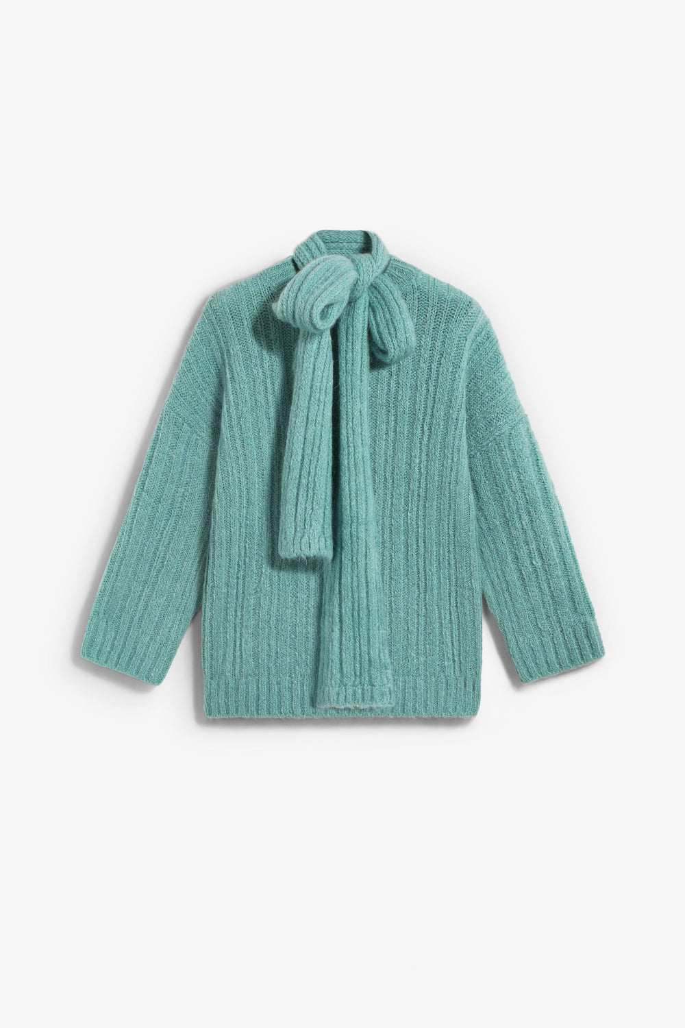 Sweater Essentiel confecionada em 50% mohair, 37% acrílico, 11% poliamida e 2% elastano. Com silhueta descontraída, ombros descaídos, aberturas das mangas ligeiramente mais amplas e elegantes acabamentos canelados. Pormenor de laço de tecido.