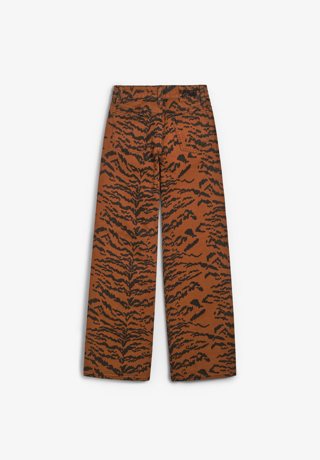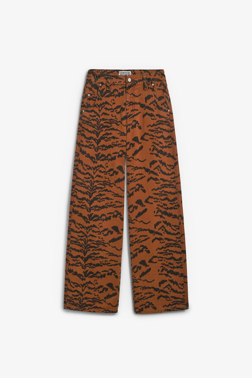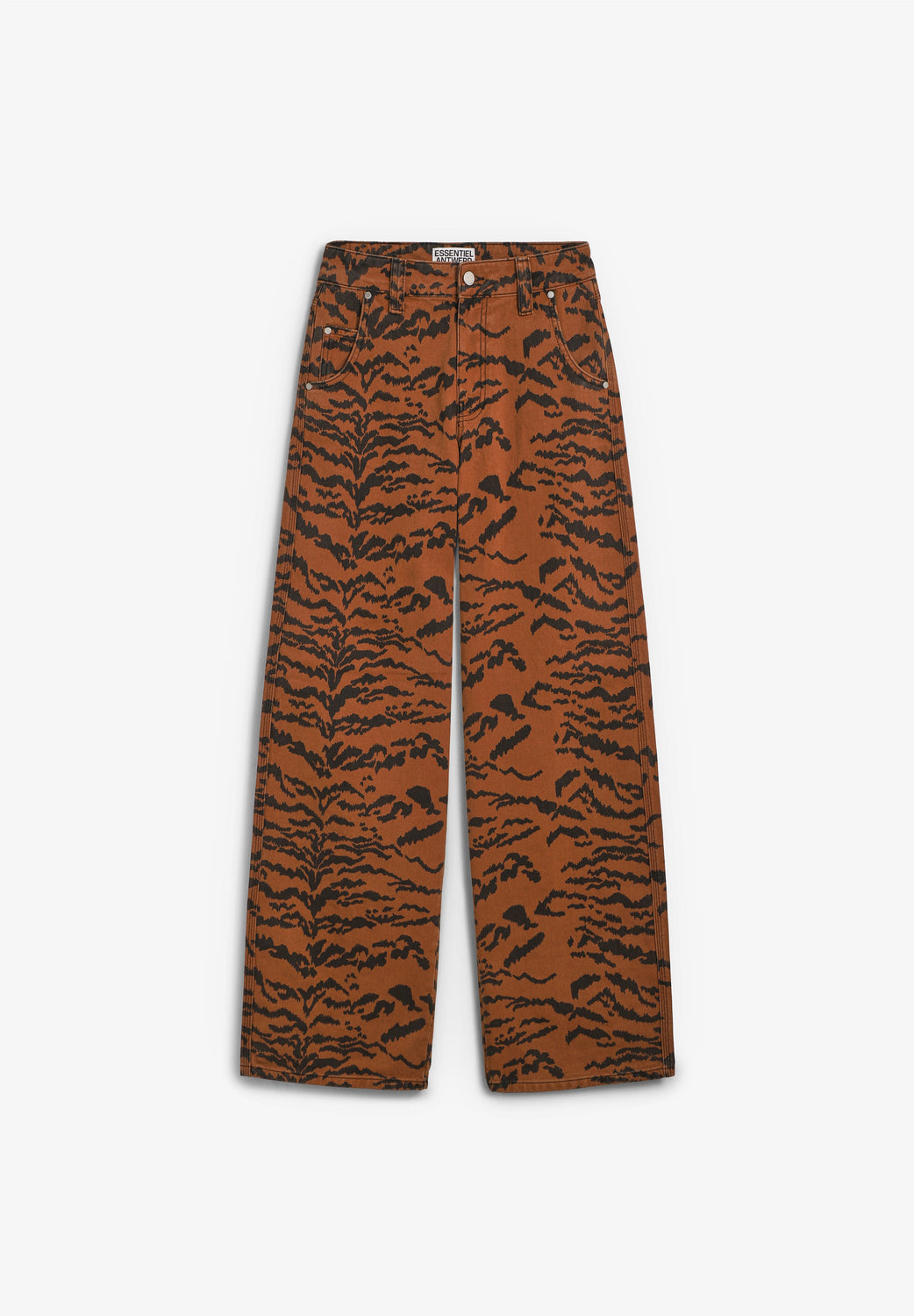 Calças jeans Essentiel confecionados em 100% algodão e concebidos com uma silhueta descontraída. Com estampado arrojado de tigre, cintura alta, fecho de correr e botão prateados, cinco bolsos e presilhas para o cinto.