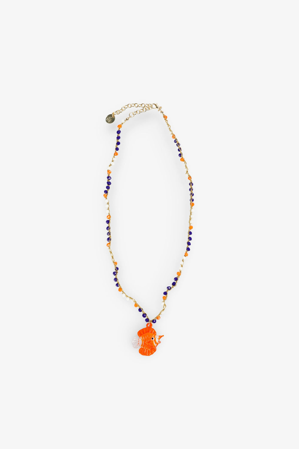Colar de contas de vidro tricolor com pormenor de peixe.