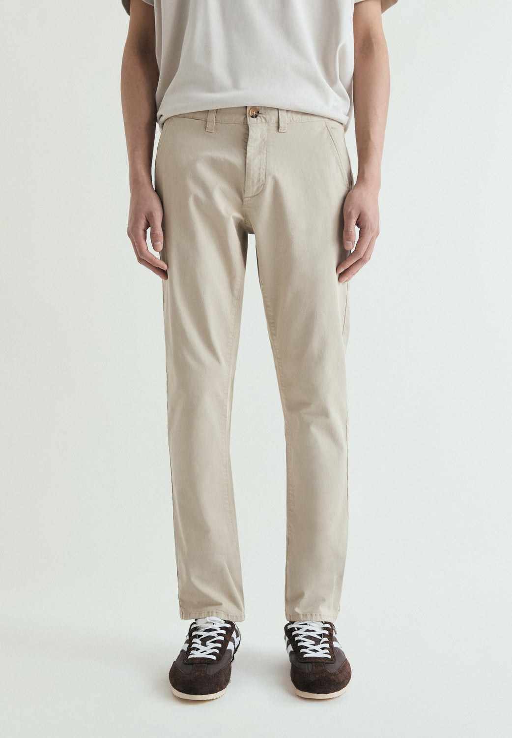 Calças chinos confecionadas em mistura de algodão. Fecho com botões ocultos na placket. Bolsos laterais e traseiros. Slim fit. Presilhas na cintura.