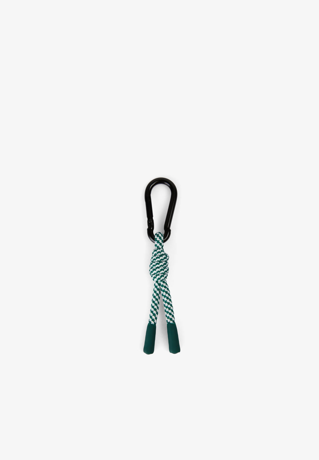 Porta-chaves com nó de cordão e mosquetão. Pormenor de logótipo nas extremidades.