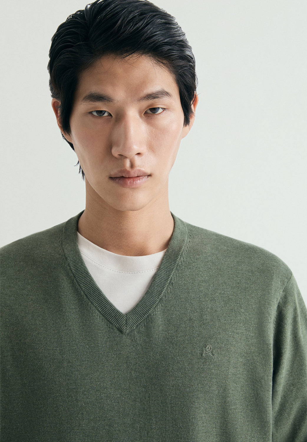Sweater confecionada em 100% algodão supima de elevada qualidade. Decote em bico. Skull bordada no tom no peito. Acabamentos canelados.
