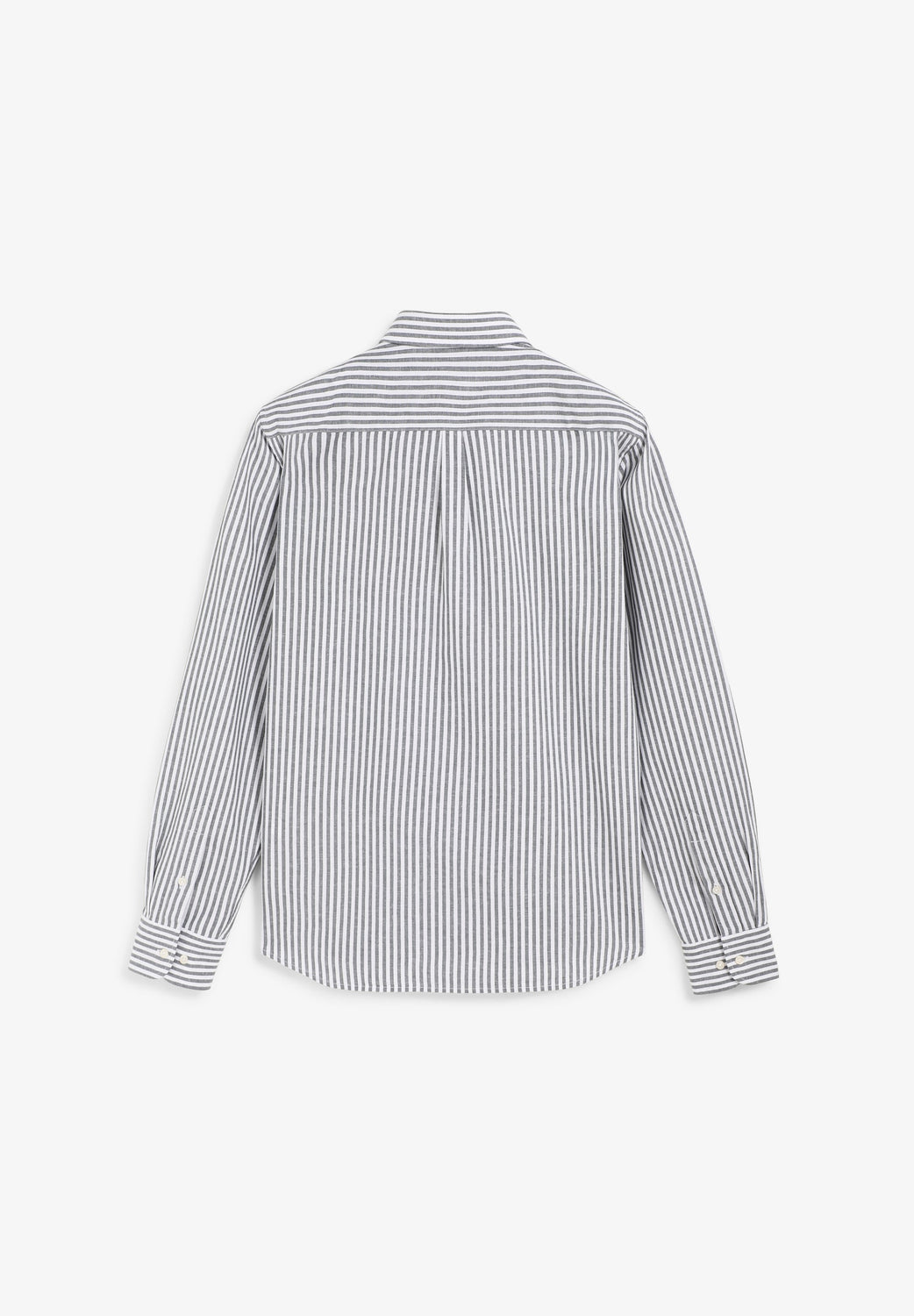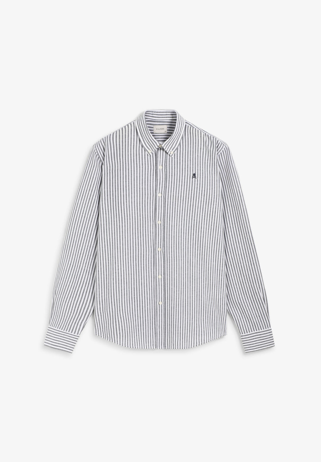 Camisa Oxford confecionada em mistura de algodão e linho. Padrão às riscas. Fecho frontal com botões. Skull bordada a contrastar no peito.