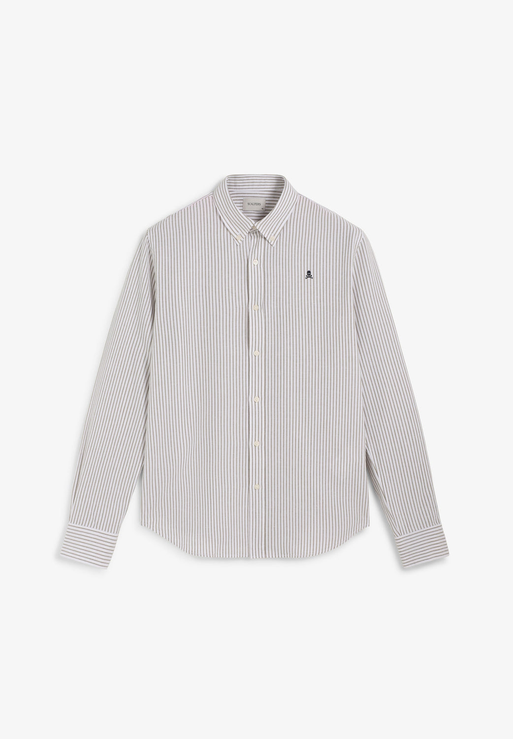 Camisa Oxford confecionada em mistura de algodão e linho. Padrão às riscas. Fecho frontal com botões. Skull bordada a contrastar no peito.